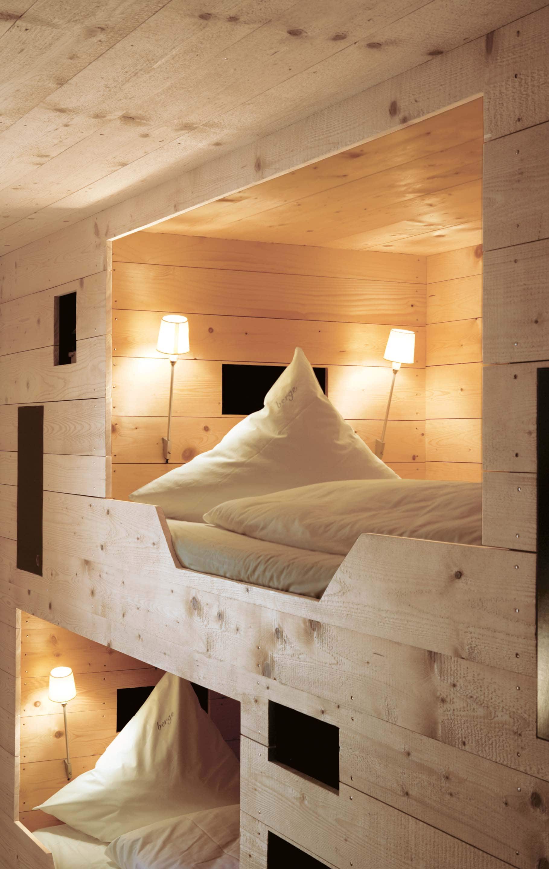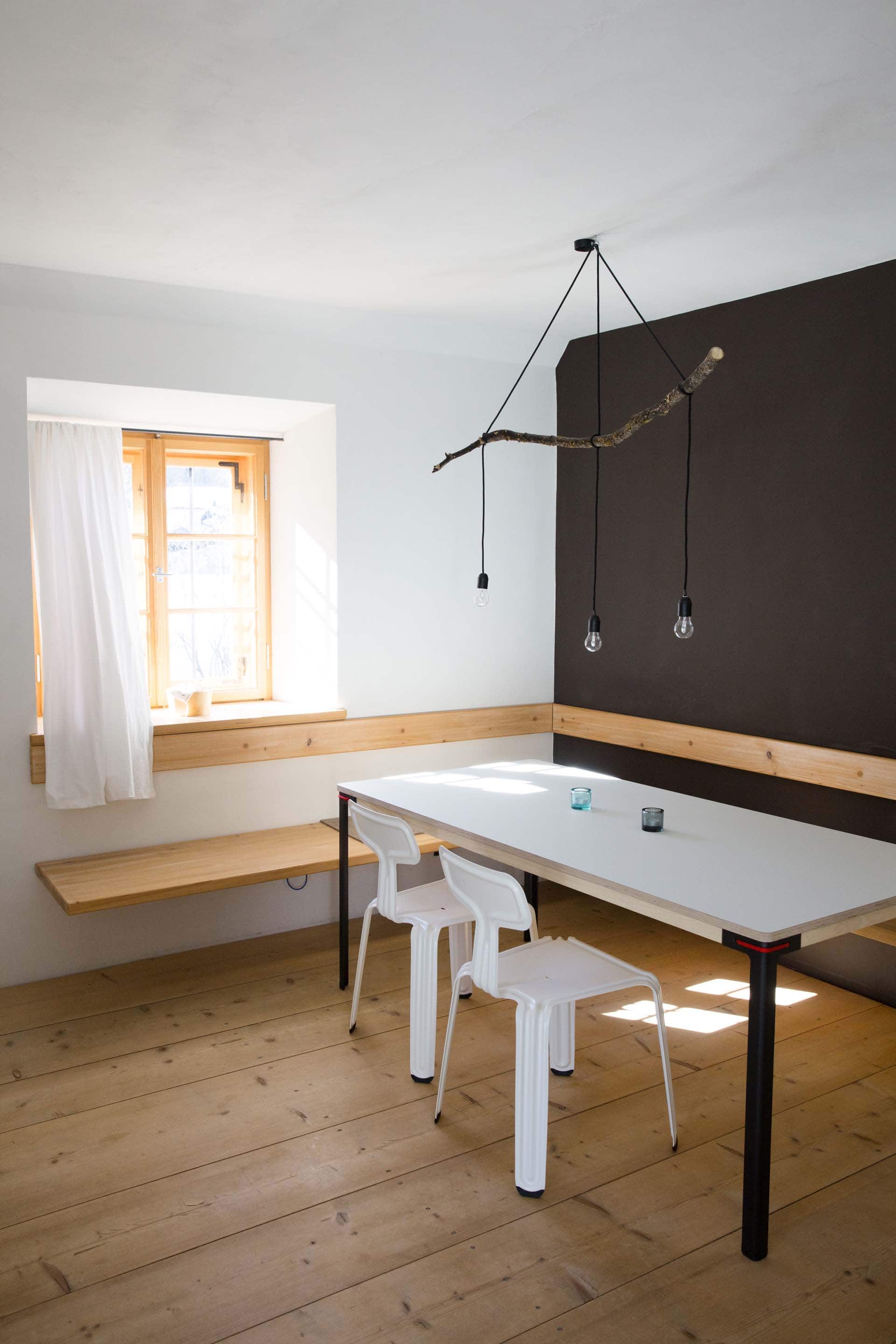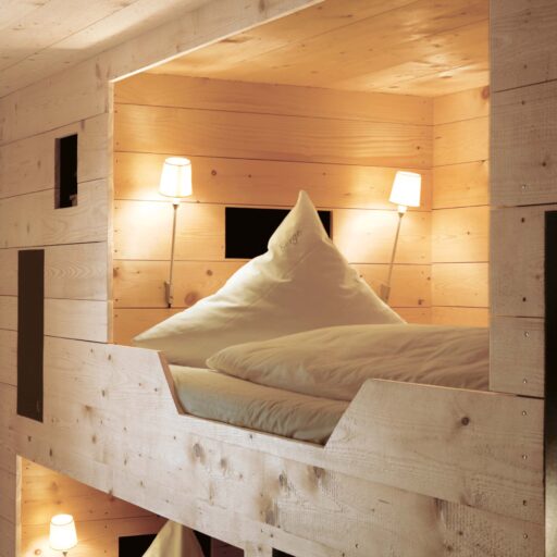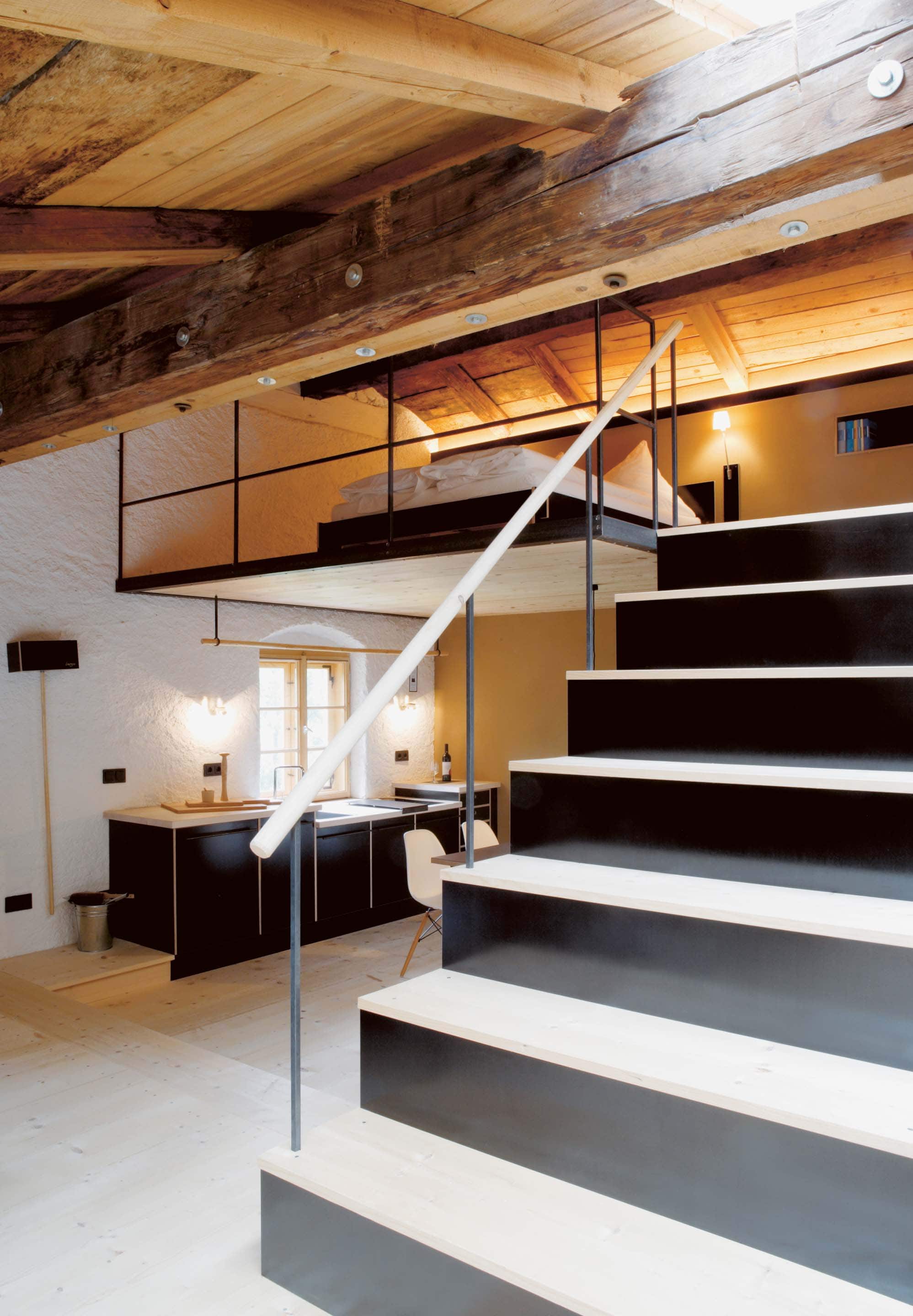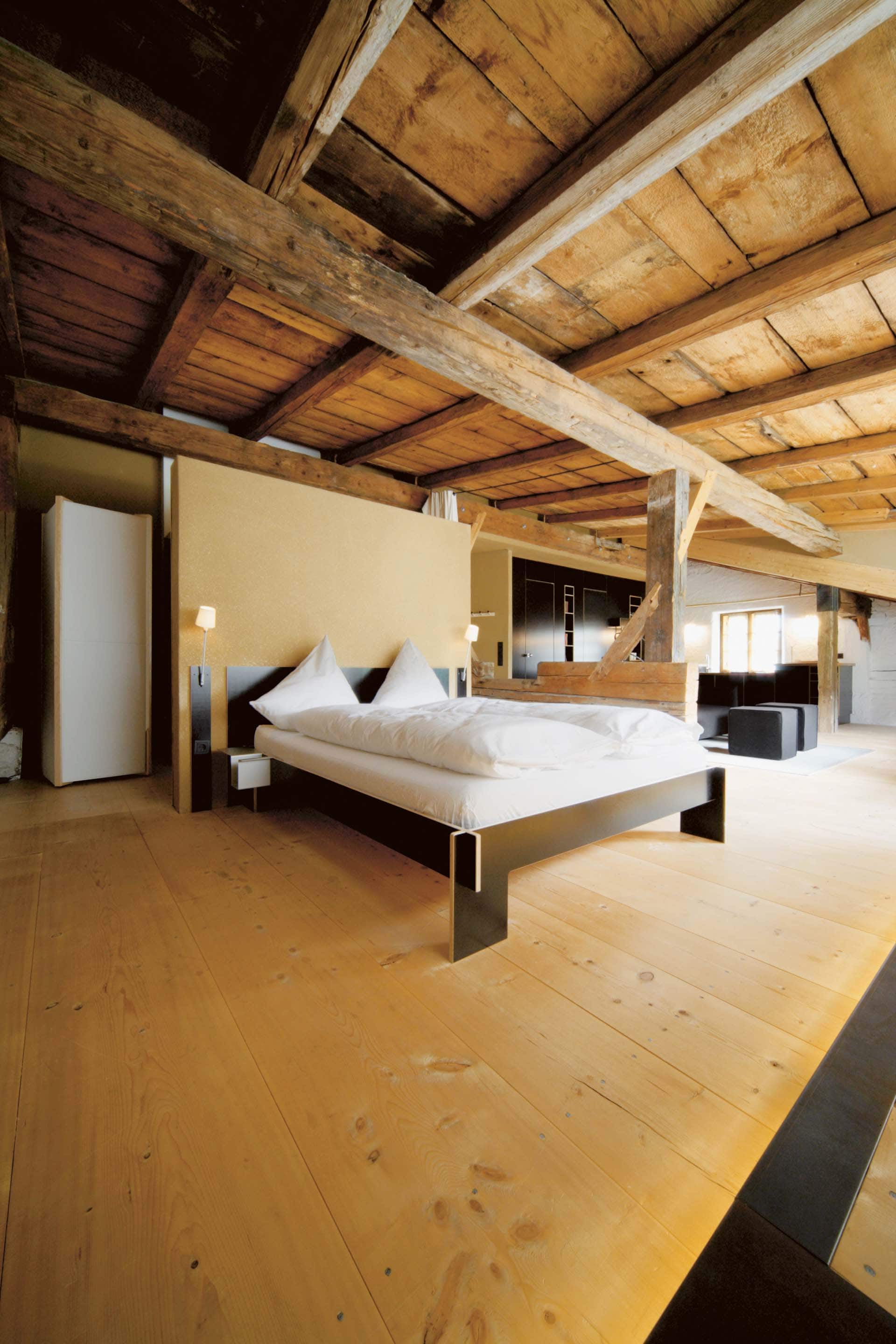 „Alles weglassen, was unnötig ist“ – so lautet die Philosophie des Gästehauses berge in Aschau im Chiemgau. Ursprünglich wurde es von dem Designer und Möbelunternehmer Nils Holger Moormann entwickelt, der für sein unkonventionelles, intelligentes und hochwertiges Möbeldesign bekannt ist. 2005 entdeckte er das rund 350 Jahre alte Gebäude und verwandelte es in eine außergewöhnliche Herberge. Seit 2025 wird das Haus von Nicole Martinsohn mit derselben Liebe zum Detail weitergeführt. 17 verschiedene Unterkünfte zählt das Quartier in Oberbayern, sie heißen Bergbude oder Zaungast und reichen vom Tiny House im Bauerngarten bis zur Galeriewohnung unterm Dach. Alle sind individuell gestaltet, sprechen aber die gleiche Formensprache – und am liebsten würde man in jedem einzelnen (mindestens!) eine Nacht verbringen. Die historische Substanz wurde in dem alten Bauernhaus erhalten und in einen spannenden Kontrast zu reduziertem Design gesetzt. So treffen knarzende Dielenböden und freiliegende Deckenbalken auf Stahl, offengelegte Steinwände auf Glasflächen. Wo alte Strukturen vorhanden waren, werden diese auch gezeigt: ungestrichene Lehmputzwände, Böden aus unbehandelter Hochgebirgsfichte und im Entrée ein Deckengewölbe, das erst beim Umbau des Hauses wieder freigelegt wurde. Die Einbauten bestehen größtenteils aus schwarzem Furniersperrholz, sind funktional und geradlinig. Neben Stücken aus der Moormann-Kollektion finden sich Klassiker wie der Plastic Side Chair von Charles und Ray Eames oder Maßanfertigungen wie die Bettnischen, in denen man so gemütlich schlummert wie in einem Nest. Und weil das alles so sensationell gut zusammen passt, gab es dafür bereits zahlreiche Designpreise. Absolut preisverdächtig ist übrigens auch der Blick auf die Kampenwand, den Aschauer Hausberg, der beim Aufwachen genauso glücklich macht wie am Abend, wenn man bei einem Glas Wein beobachtet, wie die Sonne hinter den Bergen verschwindet. Dafür, dass der größte Luxus in der Einfachheit der Dinge liegt, ist diese Unterkunft der allerschönste Beweis.