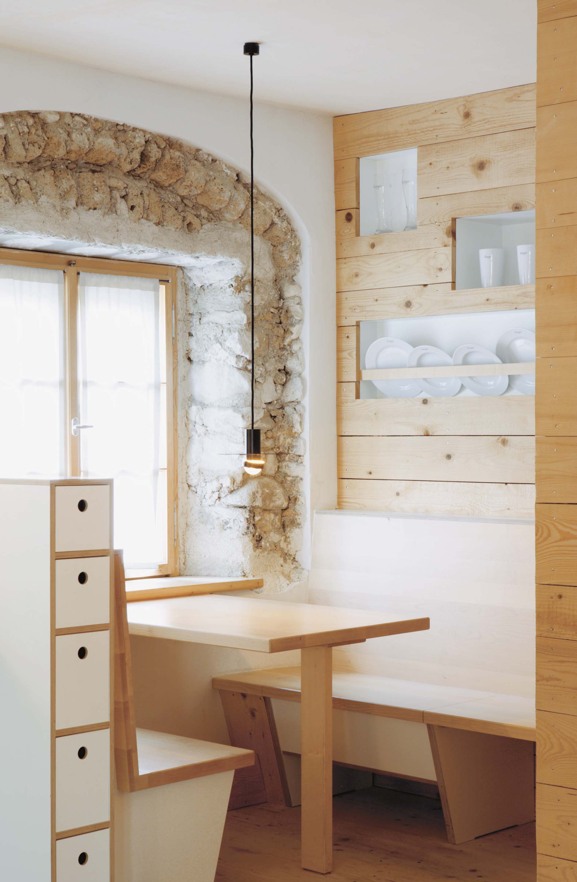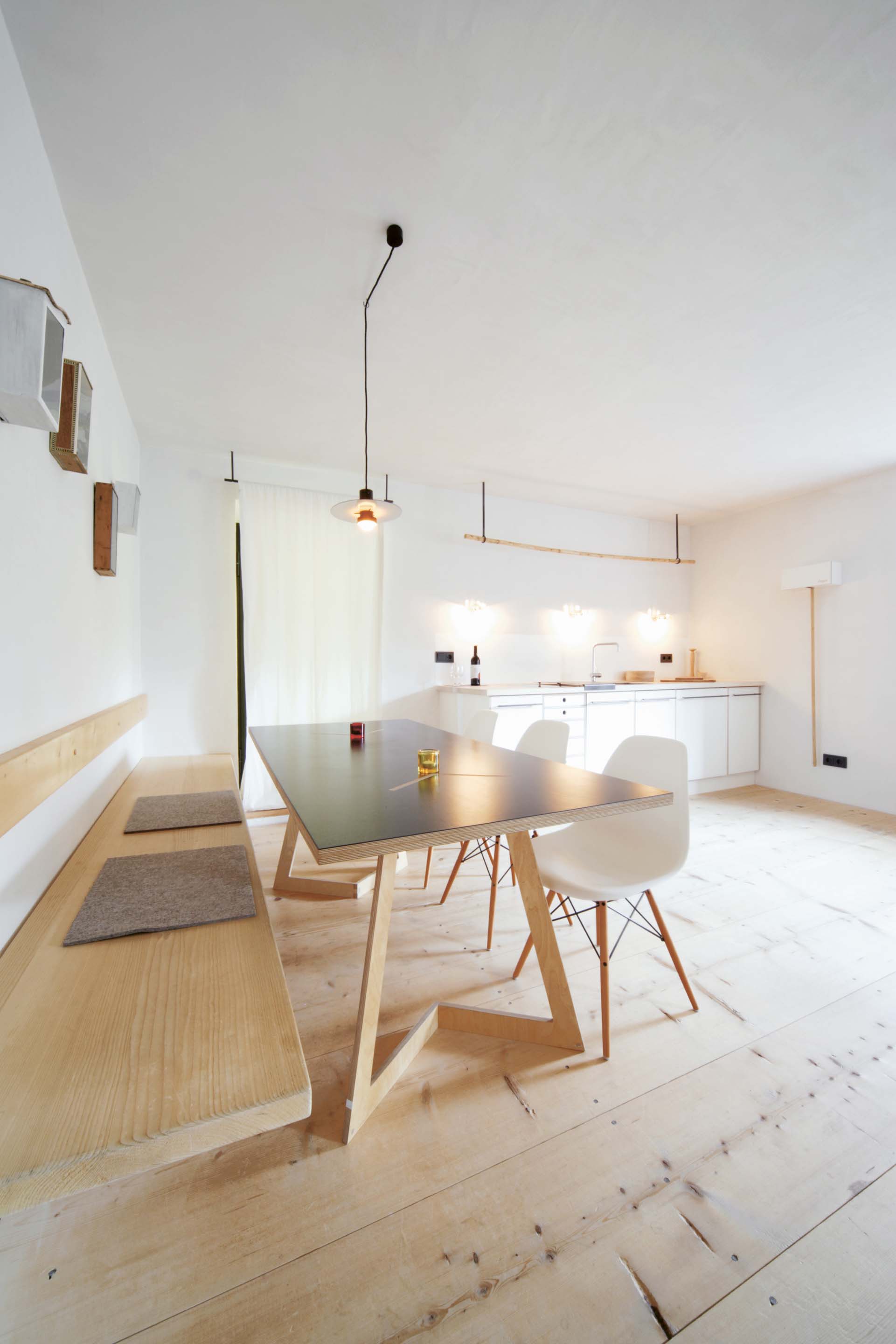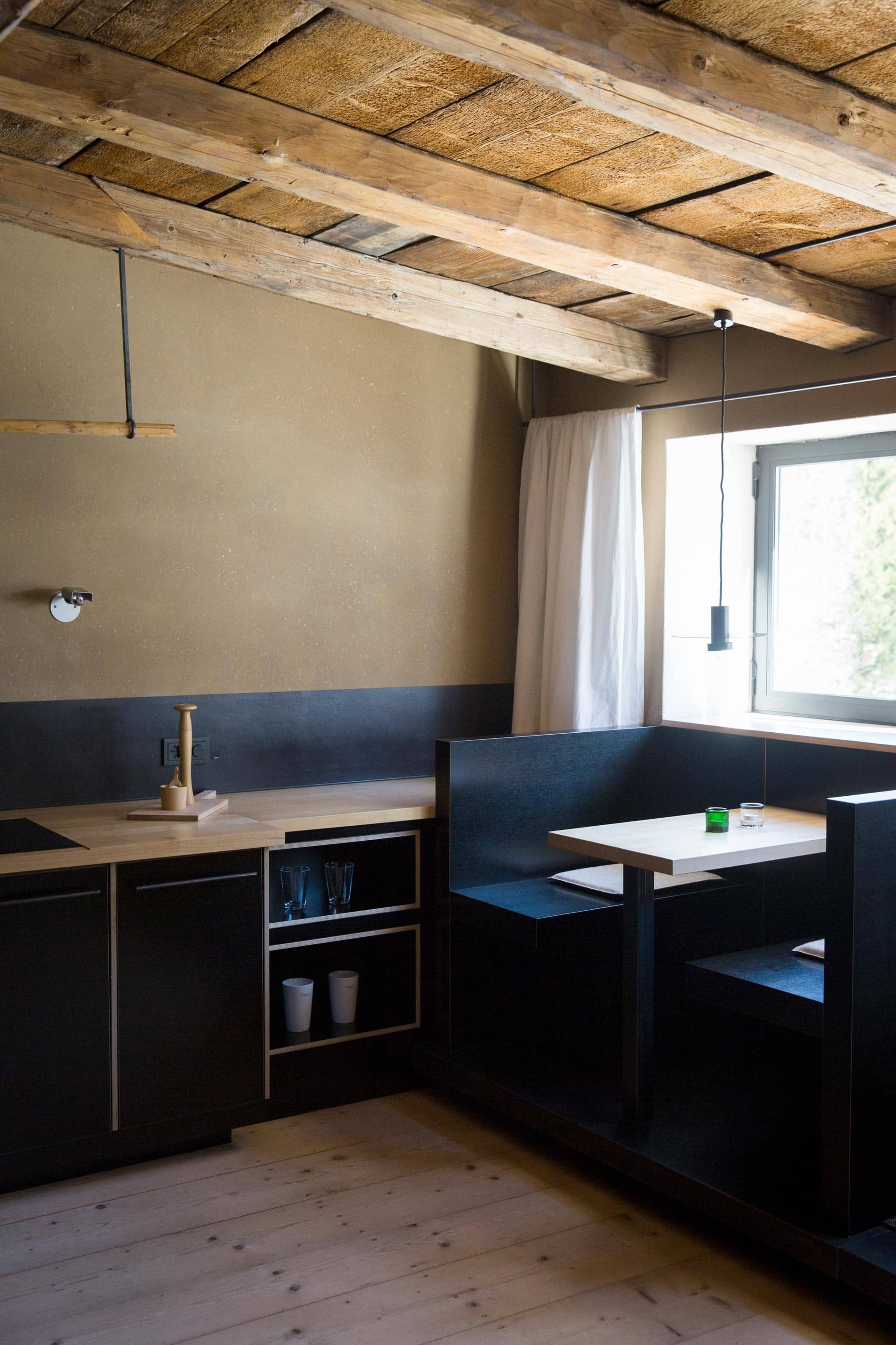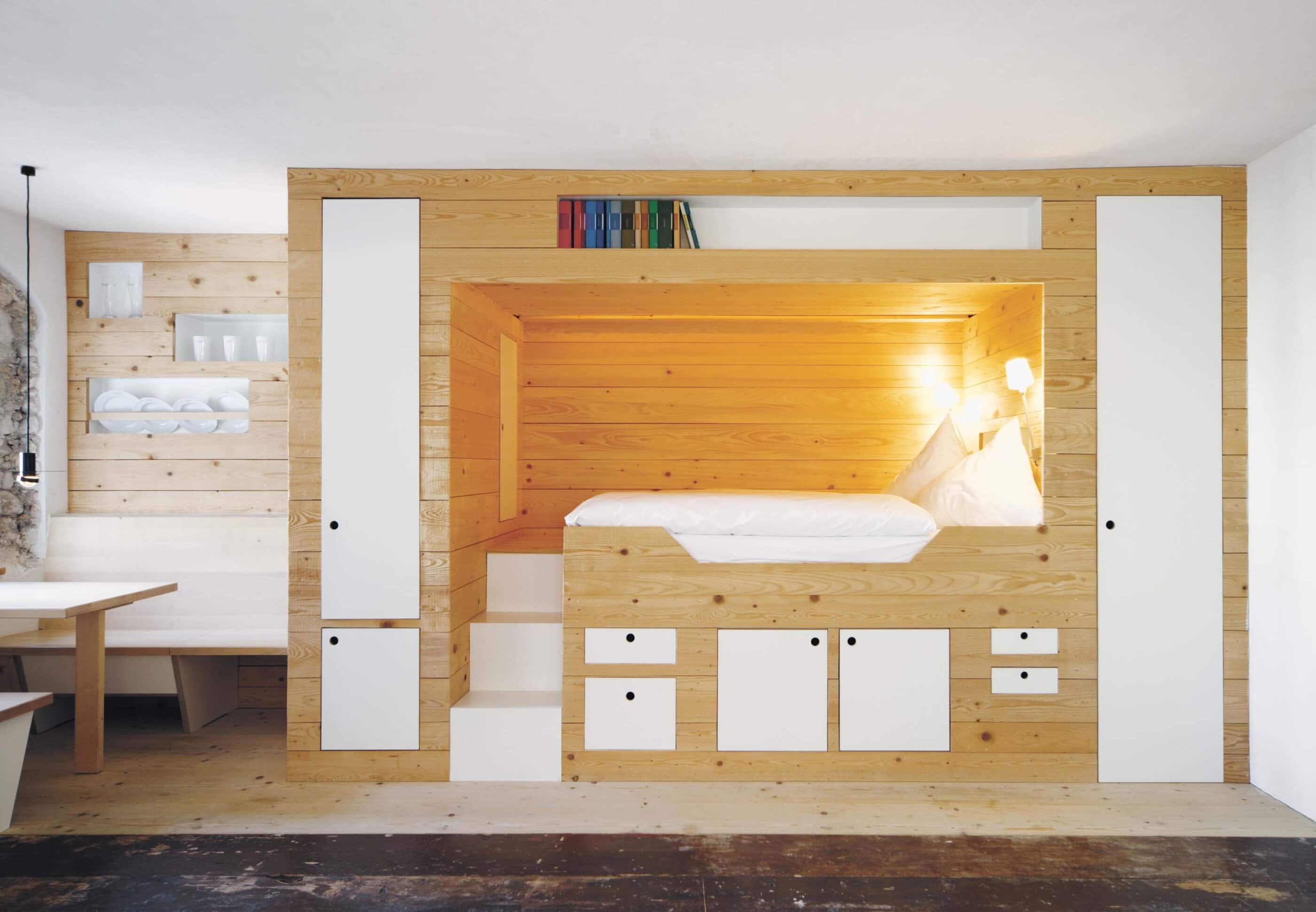 „Alles weglassen, was unnötig ist“ – so lautet die Philosophie des Gästehauses berge in Aschau im Chiemgau. Ursprünglich wurde es von dem Designer und Möbelunternehmer Nils Holger Moormann entwickelt, der für sein unkonventionelles, intelligentes und hochwertiges Möbeldesign bekannt ist. 2005 entdeckte er das rund 350 Jahre alte Gebäude und verwandelte es in eine außergewöhnliche Herberge. Seit 2025 wird das Haus von Nicole Martinsohn mit derselben Liebe zum Detail weitergeführt. 17 verschiedene Unterkünfte zählt das Quartier in Oberbayern, sie heißen Bergbude oder Zaungast und reichen vom Tiny House im Bauerngarten bis zur Galeriewohnung unterm Dach. Alle sind individuell gestaltet, sprechen aber die gleiche Formensprache – und am liebsten würde man in jedem einzelnen (mindestens!) eine Nacht verbringen. Die historische Substanz wurde in dem alten Bauernhaus erhalten und in einen spannenden Kontrast zu reduziertem Design gesetzt. So treffen knarzende Dielenböden und freiliegende Deckenbalken auf Stahl, offengelegte Steinwände auf Glasflächen. Wo alte Strukturen vorhanden waren, werden diese auch gezeigt: ungestrichene Lehmputzwände, Böden aus unbehandelter Hochgebirgsfichte und im Entrée ein Deckengewölbe, das erst beim Umbau des Hauses wieder freigelegt wurde. Die Einbauten bestehen größtenteils aus schwarzem Furniersperrholz, sind funktional und geradlinig. Neben Stücken aus der Moormann-Kollektion finden sich Klassiker wie der Plastic Side Chair von Charles und Ray Eames oder Maßanfertigungen wie die Bettnischen, in denen man so gemütlich schlummert wie in einem Nest. Und weil das alles so sensationell gut zusammen passt, gab es dafür bereits zahlreiche Designpreise. Absolut preisverdächtig ist übrigens auch der Blick auf die Kampenwand, den Aschauer Hausberg, der beim Aufwachen genauso glücklich macht wie am Abend, wenn man bei einem Glas Wein beobachtet, wie die Sonne hinter den Bergen verschwindet. Dafür, dass der größte Luxus in der Einfachheit der Dinge liegt, ist diese Unterkunft der allerschönste Beweis.