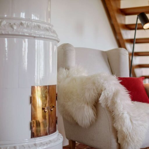 - den Jugendstil-Kaminofen im Apartment „Ost“ und den antiken schwedischen Kachelofen in der „West“-Wohnung – mit Ohrensessel zum Schmökern gleich daneben