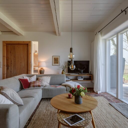 Um mal alles loszulassen, braucht es oft gar nicht viel. Erfahrungsgemäß geht es sogar mit möglichst wenig Ablenkung am allerbesten. Und zwar so: Bequem im Strandkorb einrichten, je nach Witterung ein kühles Getränk oder einen dampfenden Tee bereitstellen, und den Blick über die Marschlandschaft Schleswig-Holsteins streifen lassen. Weidende Schafe, Deiche, Wiesen und Felder. Diese Art der Entschleunigung klappt ausgezeichnet im Garten des alten Friesenhauses, das in Alleinlage auf der Halbinsel Eiderstedt an der Nordseeküste steht. 120 Jahre hat Huus Uelvesbüll auf dem Buckel, wurde ursprünglich von Zimmerleuten bewohnt. Damals war es noch eine Kate, die später zu einem Landhaus mit Reetdach erweitert wurde, was ihr ausgesprochen gut steht. Nach der Restaurierung im Jahr 2017 beherbergt es heute drei Ferienwohnungen, die einiges gemeinsam haben: Ein zurückgenommenes, skandinavisch inspiriertes Innenleben mit vielen vom Tischler gefertigten Möbeln, gedeckten Farben und einem Mix aus massivem Eichenholz und Glas. Außerdem den Charme von freiliegenden Balken, Giebelfenstern und Reetdachgauben. Von allen Apartments bietet sich der Blick in die Weite. Geteilt wird der Mini-Wellnessbereich in Form einer Sauna mit Ruheraum. Von diesem erholsamen Fleckchen aus kann man sich aufs Rad schwingen und die Deiche entlang strampeln. Den zwölf Kilometer langen Sandstrand von St. Peter-Ording mit Salzwiesen, Dünen und Watt erkunden. Oder am Hafen von Husum Ebbe und Flut mitten in der Stadt erleben. Aber auch wer ganz auf Ausruh-Mission ist und seine Urlaubstage damit verbringen möchte, nichts zu tun als dieses herrliche Haus zu genießen, macht rein gar nichts verkehrt.