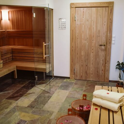 - Sauna- und Duschtücher liegen bereit, außerdem verschiedene Aromen für den Aufguss sowie Holzkübel für die Kneipp-Fraktion