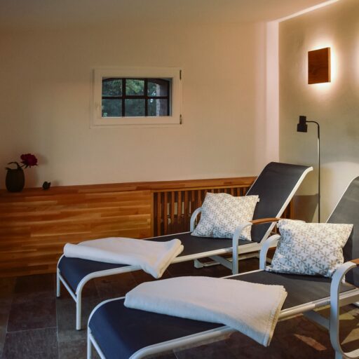 - den Chill-out-Bereich im kleinen Spa. Nicht nur dampft man hier mit Blick aus großen Panoramafenstern aus, er bietet auch einen zusätzlichen Rückzugsort, etwa für die Morgenmeditation