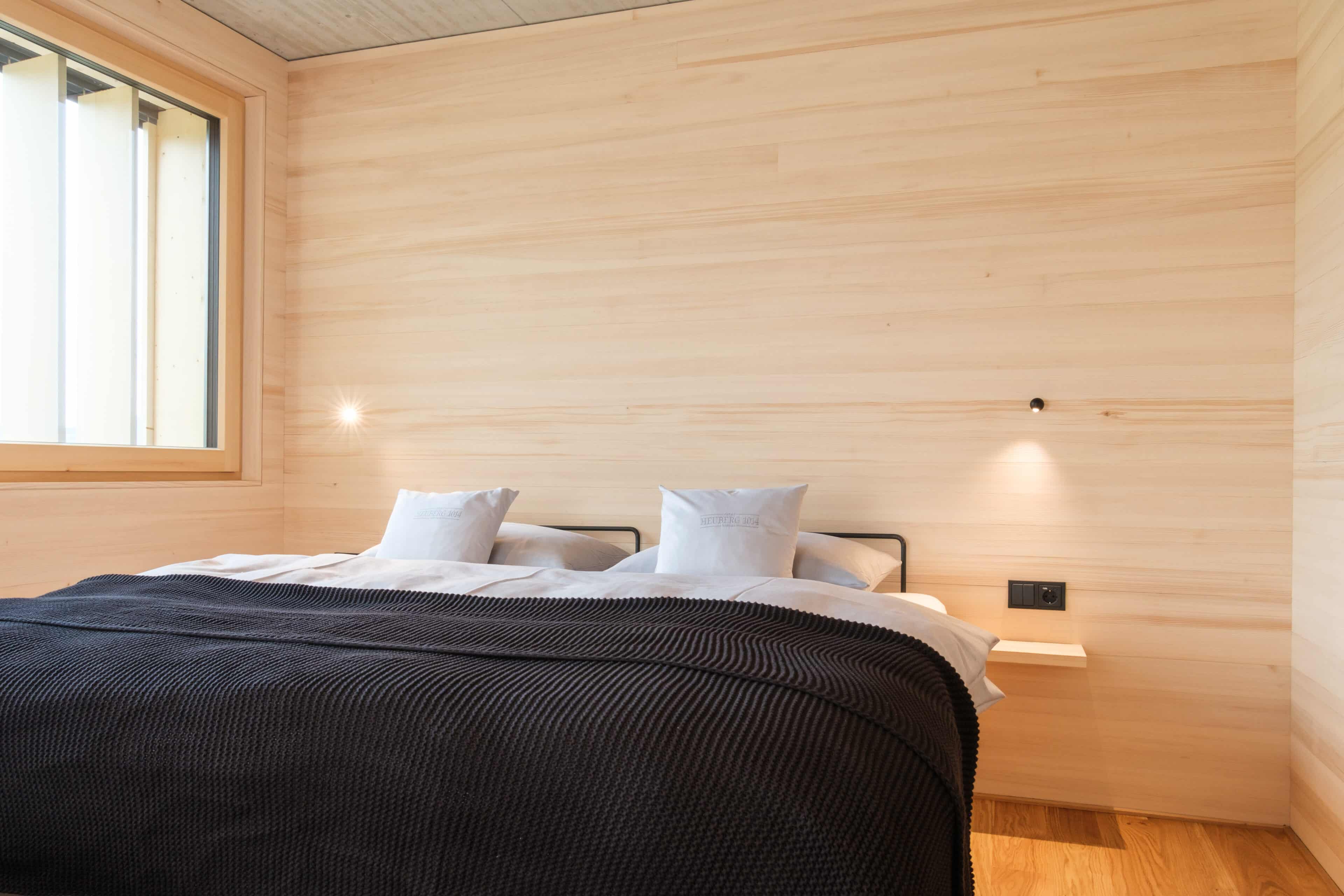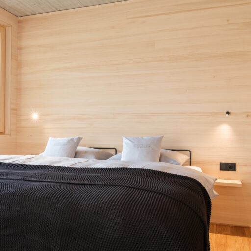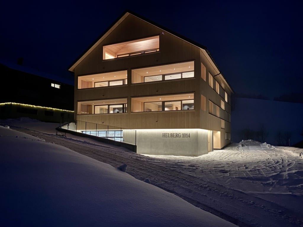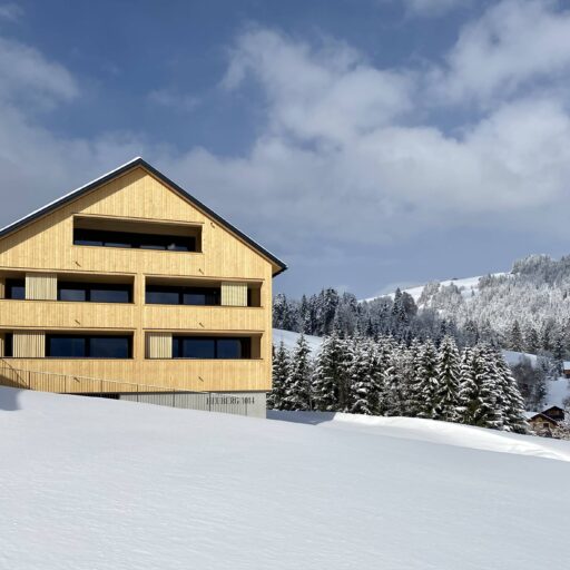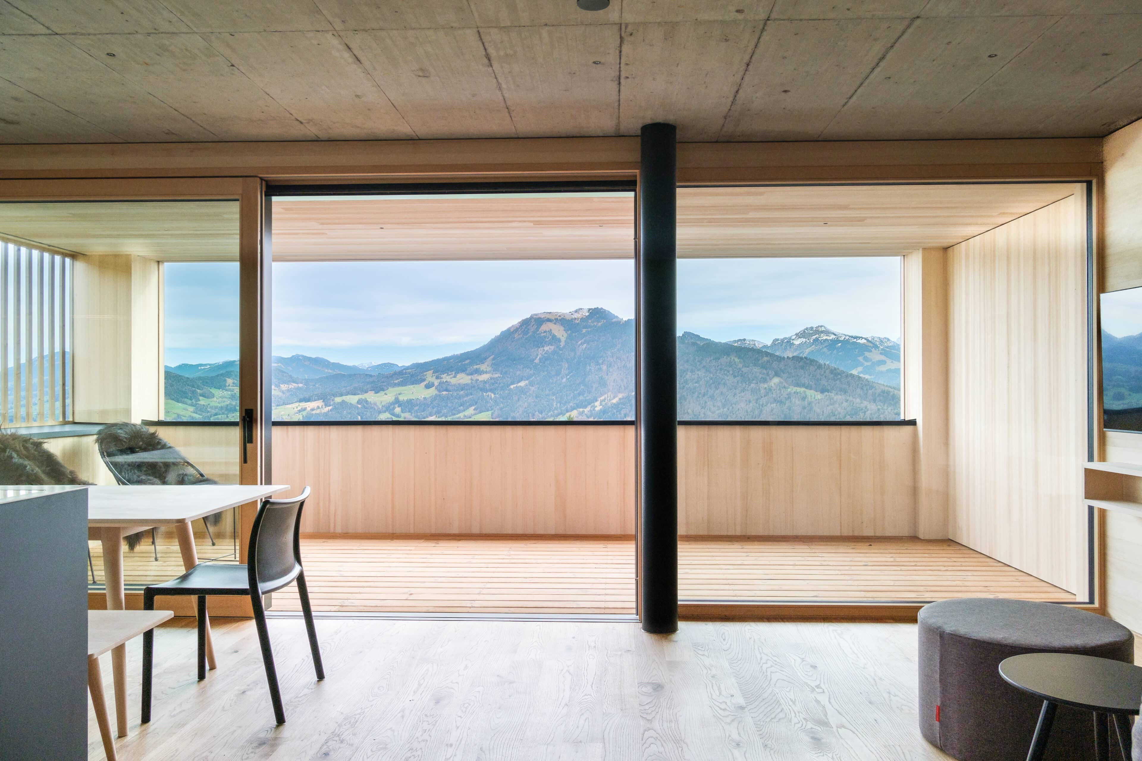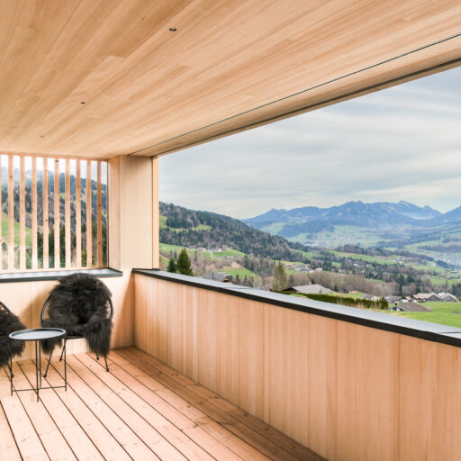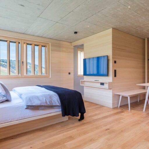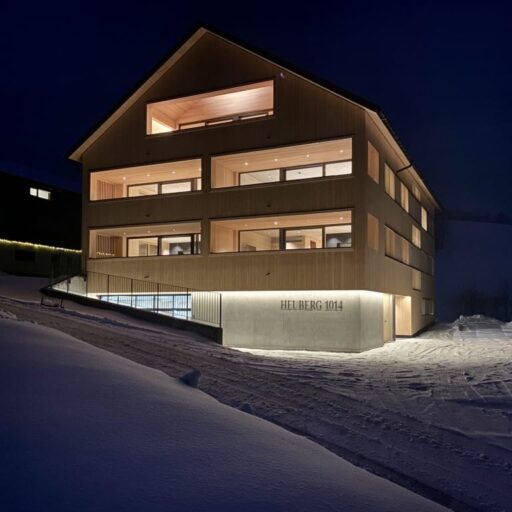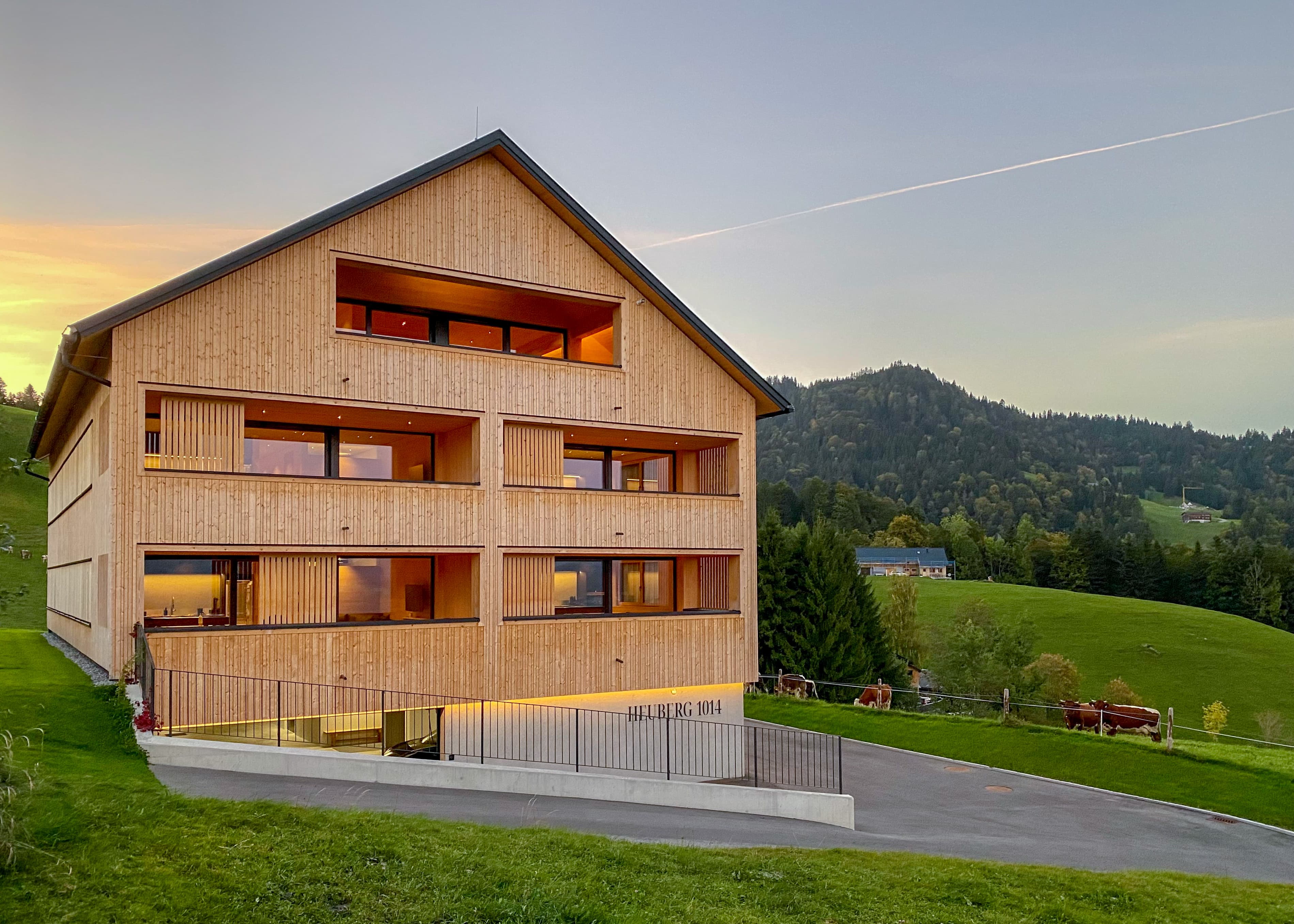 Am Hang oberhalb von Schwarzenberg öffnet sich der Blick weit über Wiesen, das Tal und die Bergkulisse des Bregenzerwaldes. In dieser Landschaft haben Ulla und Lukas Feurstein 2022 das Heuberg 1014 entstehen lassen – ein Holzhaus, das sich harmonisch in die Umgebung einfügt und doch seinen ganz eigenen Stil hat. Von Handwerkern aus der Region errichtet, steht das Haus mit seiner ruhigen, schnörkellosen Holzfassade am Hang. Die vertraute Form des Giebels bleibt erhalten, Lamellen, Loggien und große Fensterfronten geben der Architektur eine zeitgenössische Leichtigkeit. Auch im Inneren bleibt die Sprache klar: Holz und Sichtbeton, zurückhaltend kombiniert und durch passgenaue Einbauten und maßgefertigte Möbel ergänzt, schaffen eine Atmosphäre, die reduziert und warm zugleich ist. Von allen acht Ferienwohnungen aus öffnet sich der Blick nach draußen – auf grüne Hänge, den Bregenzerwald und die Gipfel, die den Horizont rahmen. Das Haus liegt etwas oberhalb des Dorfes, nur wenige Minuten vom Bödele entfernt. Wer hinausgeht, ist sofort mittendrin: Wanderwege starten vor der Haustür, Sommerbergbahnen bringen Wanderer den Gipfeln entgegen. Die hügelige Natur lässt sich aber auch prima per Mountainbike erkunden. Wilde Flüsse geben Gelegenheit zum Raften und Angeln. Wer im Winter das Naturerlebnis dem Pistenrummel vorzieht, kann mit Schneeschuhen und Skiern losziehen – und anschließend in der privaten Sauna entspannen. Feursteins haben das Heuberg 1014 so geplant, dass sie am liebsten sofort selbst einziehen würden. Jedes Detail ist hinsichtlich Nachhaltigkeit, Funktionalität und sozialer Verträglichkeit durchdacht. Regionalen Erzeugern und Werkstätten geben die Gastgeber im eigenen Lädchen eine Plattform – ein rundum sympathisches Konzept, das neue Wege geht, ohne die eigene Herkunft aus dem Blick zu verlieren.