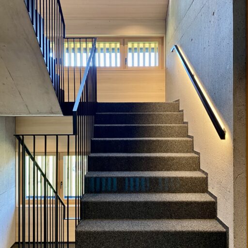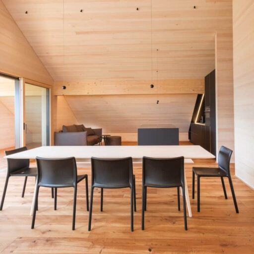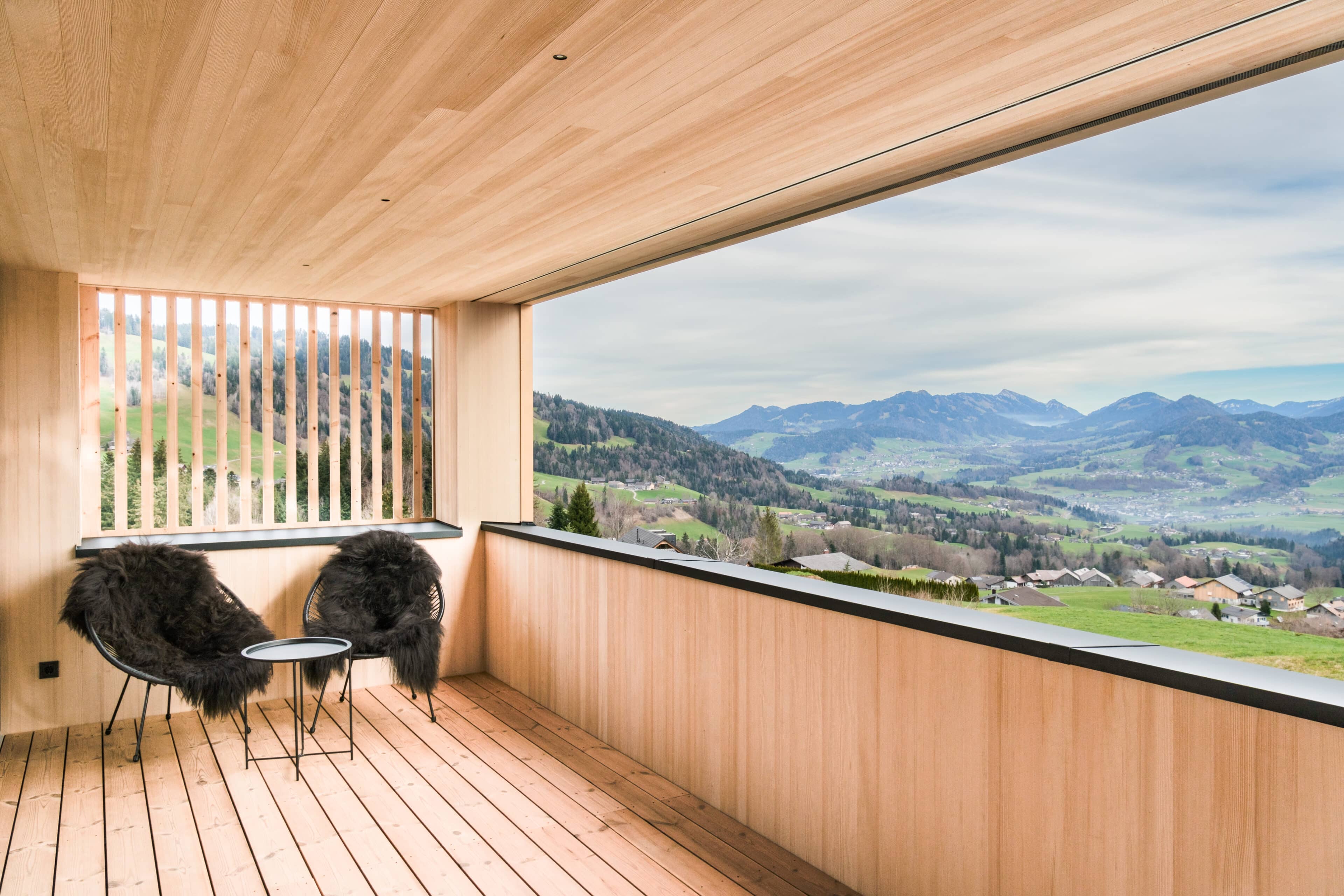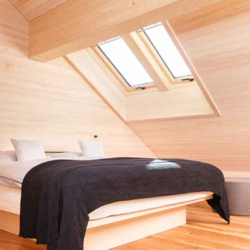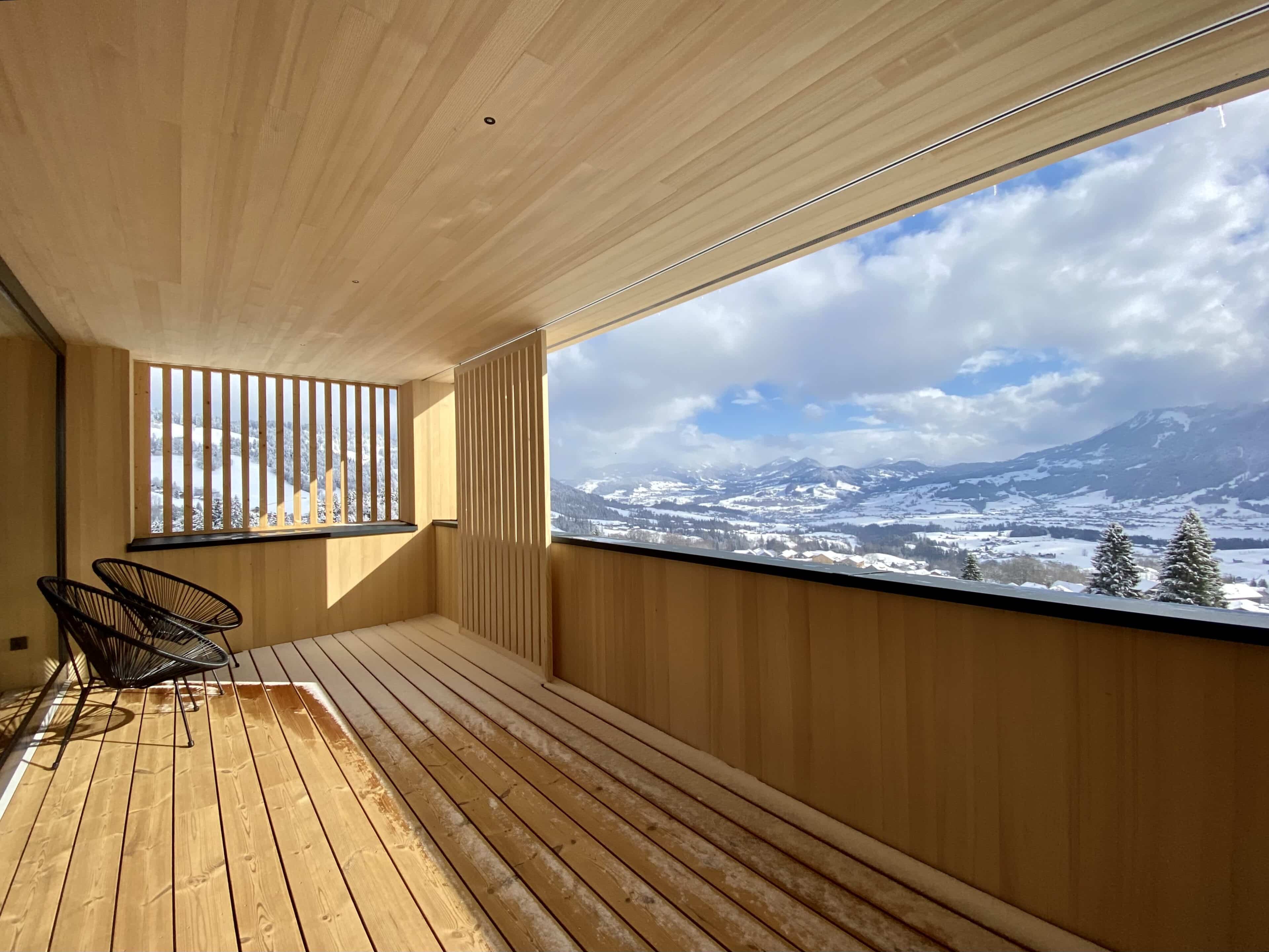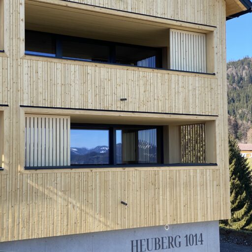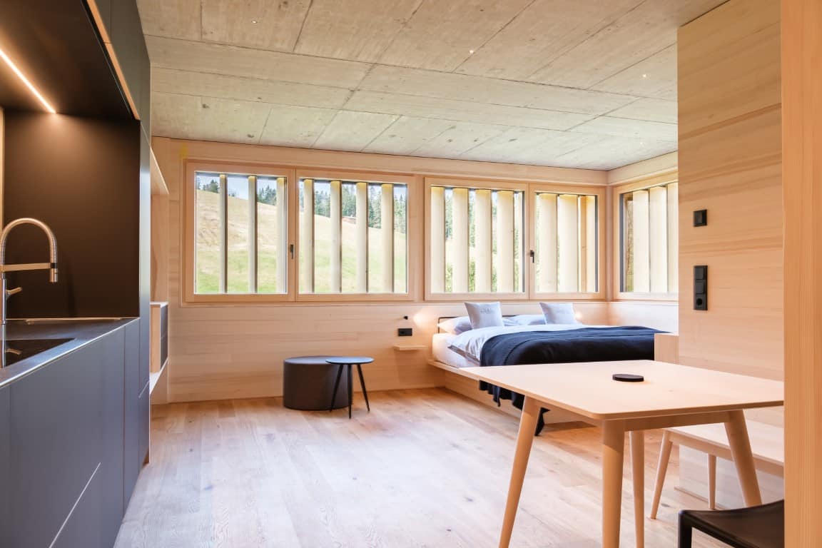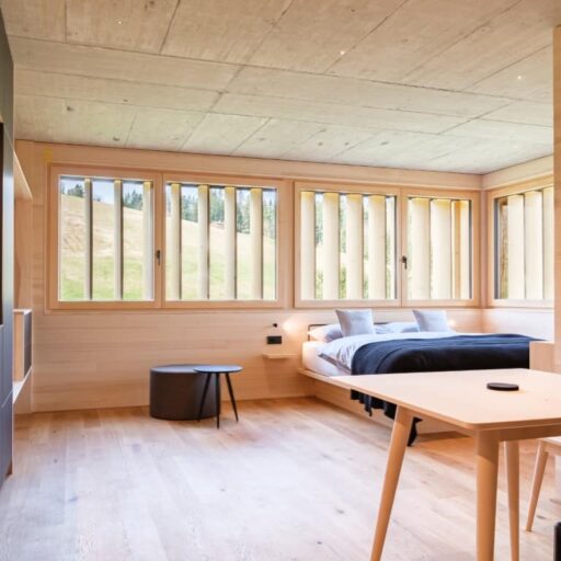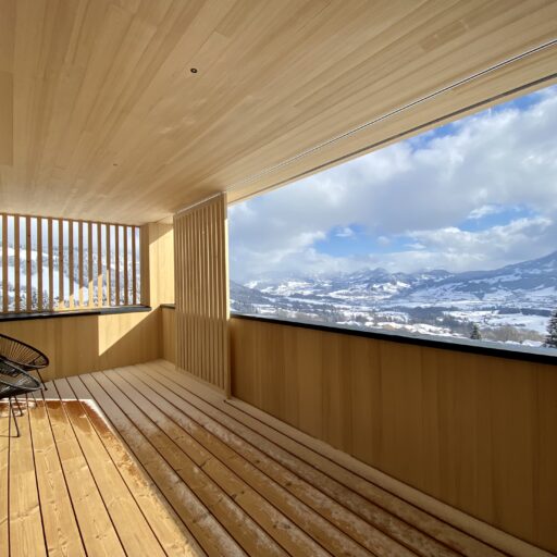 Am Hang oberhalb von Schwarzenberg öffnet sich der Blick weit über Wiesen, das Tal und die Bergkulisse des Bregenzerwaldes. In dieser Landschaft haben Ulla und Lukas Feurstein 2022 das Heuberg 1014 entstehen lassen – ein Holzhaus, das sich harmonisch in die Umgebung einfügt und doch seinen ganz eigenen Stil hat. Von Handwerkern aus der Region errichtet, steht das Haus mit seiner ruhigen, schnörkellosen Holzfassade am Hang. Die vertraute Form des Giebels bleibt erhalten, Lamellen, Loggien und große Fensterfronten geben der Architektur eine zeitgenössische Leichtigkeit. Auch im Inneren bleibt die Sprache klar: Holz und Sichtbeton, zurückhaltend kombiniert und durch passgenaue Einbauten und maßgefertigte Möbel ergänzt, schaffen eine Atmosphäre, die reduziert und warm zugleich ist. Von allen acht Ferienwohnungen aus öffnet sich der Blick nach draußen – auf grüne Hänge, den Bregenzerwald und die Gipfel, die den Horizont rahmen. Das Haus liegt etwas oberhalb des Dorfes, nur wenige Minuten vom Bödele entfernt. Wer hinausgeht, ist sofort mittendrin: Wanderwege starten vor der Haustür, Sommerbergbahnen bringen Wanderer den Gipfeln entgegen. Die hügelige Natur lässt sich aber auch prima per Mountainbike erkunden. Wilde Flüsse geben Gelegenheit zum Raften und Angeln. Wer im Winter das Naturerlebnis dem Pistenrummel vorzieht, kann mit Schneeschuhen und Skiern losziehen – und anschließend in der privaten Sauna entspannen. Feursteins haben das Heuberg 1014 so geplant, dass sie am liebsten sofort selbst einziehen würden. Jedes Detail ist hinsichtlich Nachhaltigkeit, Funktionalität und sozialer Verträglichkeit durchdacht. Regionalen Erzeugern und Werkstätten geben die Gastgeber im eigenen Lädchen eine Plattform – ein rundum sympathisches Konzept, das neue Wege geht, ohne die eigene Herkunft aus dem Blick zu verlieren.