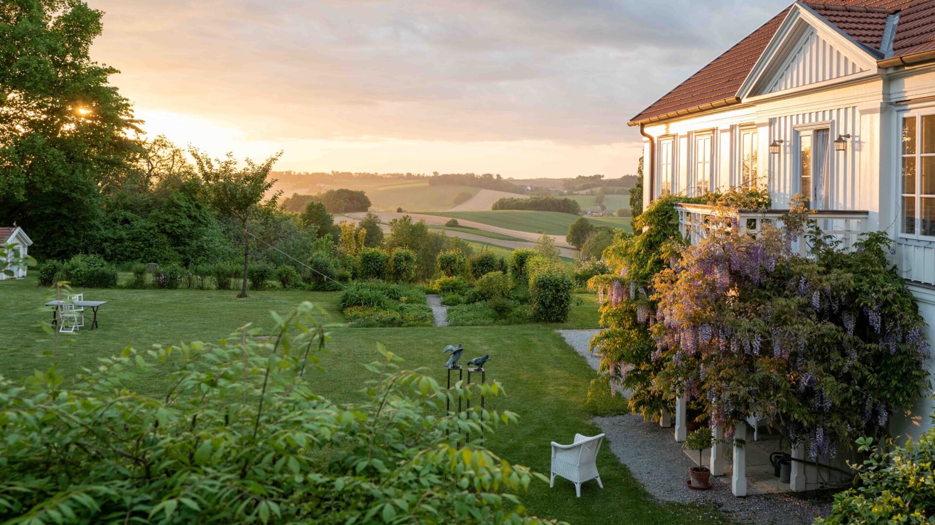 Eigentlich hatten wir bisher nie daran gezweifelt, dass Astrid Lindgrens Bullerbü in Schweden liegt. Und zwar einzig und allein dort. Seit wir jedoch Hof Grillenöd entdeckt haben, ist ziemlich klar: So einen Sehnsuchtsort, der uns an den Duft von frischem Heu und Pfannkuchen mit Blaubeeren denken lässt, an dem die Welt noch in Ordnung zu sein scheint, den gibt es auch in Niederbayern. „Als wir vor dreißig  Jahren an diesen verlassenen Fleck kamen, ahnte ich, dass ich hier den Platz für die Verwirklichung meiner Träume gefunden hatte“, so Bildhauerin Mona Zimen. Obwohl der alte Hof nach mehreren Bränden nur noch aus Ruinen bestand, war sie verzaubert von der Lage zwischen dichtem Wald, offenem Tal und den Bergketten am Horizont. Hier sollte nicht nur eine kleine biologische Landwirtschaft, sondern auch ein Begegnungsort für Menschen aus aller Welt entstehen. Inspiriert durch die schwedische Heimat ihres inzwischen verstorbenen Mannes Erik Zimen, einem bekannten Verhaltensforscher, entstand hier nach und nach ein Ensemble aus Holzhäusern in Rot und Weiß, inklusive Stall, Scheune, Schuppen und einer kleinen Kapelle. Während die Gastgeberin im Haupthaus lebt und dort im Bildhauer-Atelier arbeitet, wohnen die Gäste in einer der beiden Ferienwohnungen im ersten und zweiten Stock des roten Gästehauses. Möbel in skandinavischem Stil, helle Farben, Holzdielen, antike Möbel, viel Kunst und historische Öfen schaffen Wohlfühlatmosphäre. Und draußen vor der Tür wartet das Abenteuer Natur. In Form von Hühnern, Schafen, Galloways und Zwergeseln. Einem Badeteich mit Steg. Dichten Brombeersträuchern, Holunder- und Obstbäumen. Sanften Hügeln. Und auch wenn Monas vier Adoptivkinder längst erwachsen sind und sie hier heute auch regelmäßig Kunstevents für die Großen organisiert, so ist es doch das, was diesen Ort ausmacht: dass er Kindheitserinnerungen weckt – oder neue entstehen lässt.