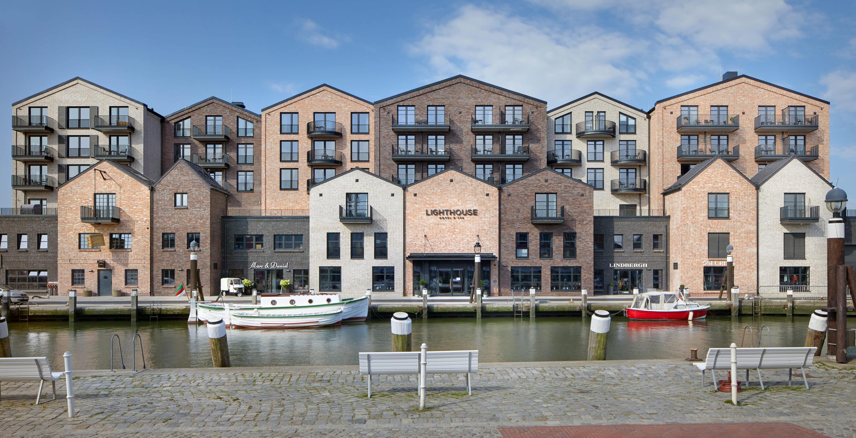 - wie das Hotel in kleinteilige Baukörper aufgeteilt wurde und dadurch an alte Hafenspeicher erinnert – mit einer Prise Hamptons-Style