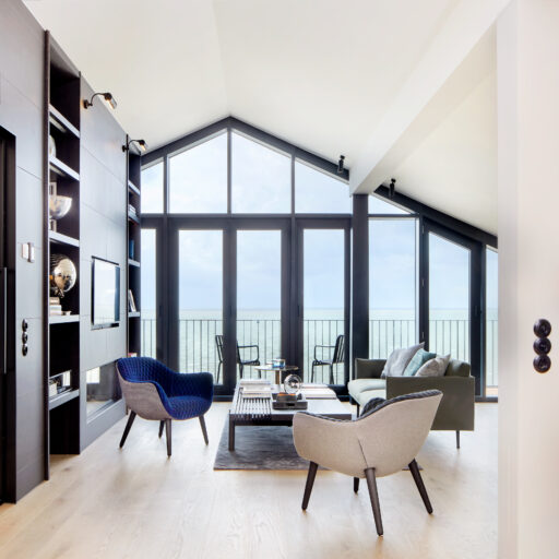 - dass die große Wendeltreppe, die beide Ebenen des Hauses verbindet, an die Leuchtturm-Architektur angelehnt ist, passend zum angebauten Leuchtfeuer am Nordwestgiebel des Gebäudes