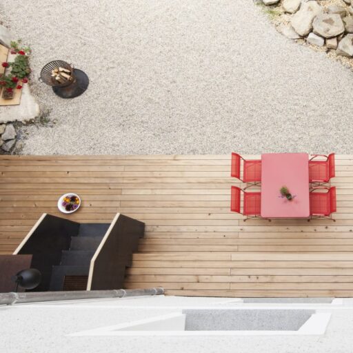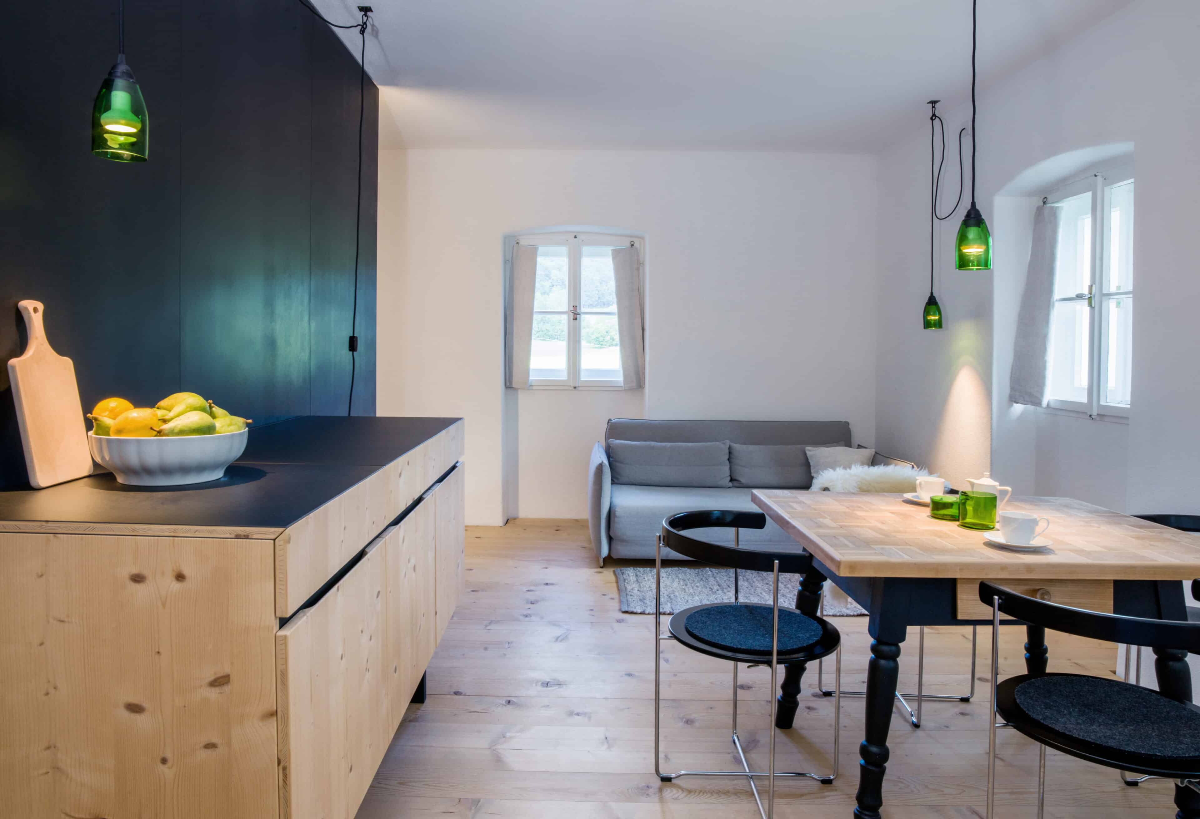 - die beiden Gästeappartements bestehen jeweils aus einem Raum, in der Mitte die Holzbox (mit Bad) – so teilt sich die Wohnung in verschiedene Bereiche auf und kann flexibel genutzt werden; da darf auch mal der Tisch umgestellt werden…