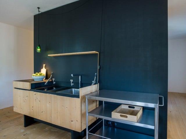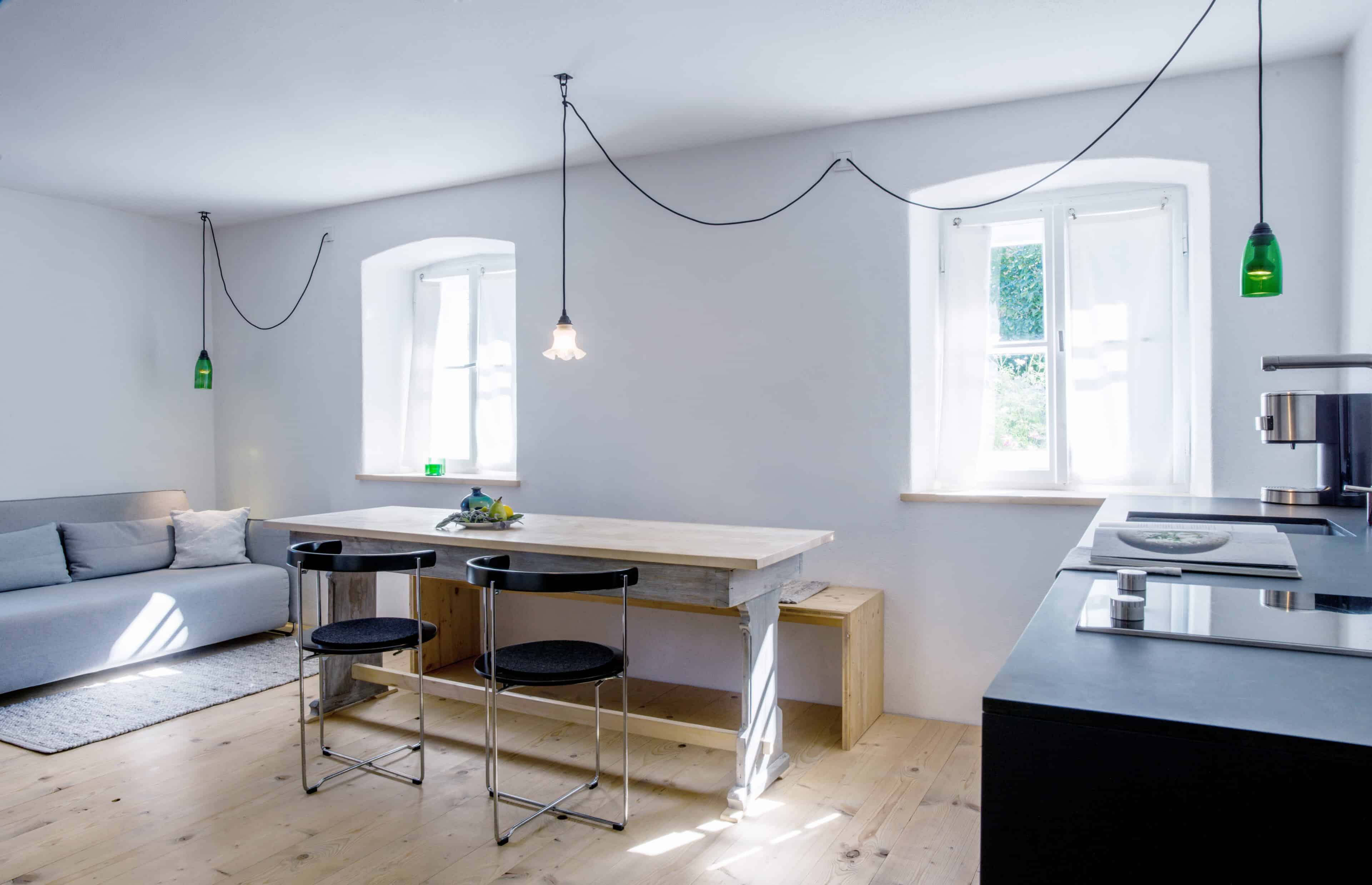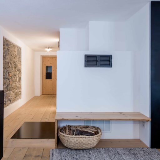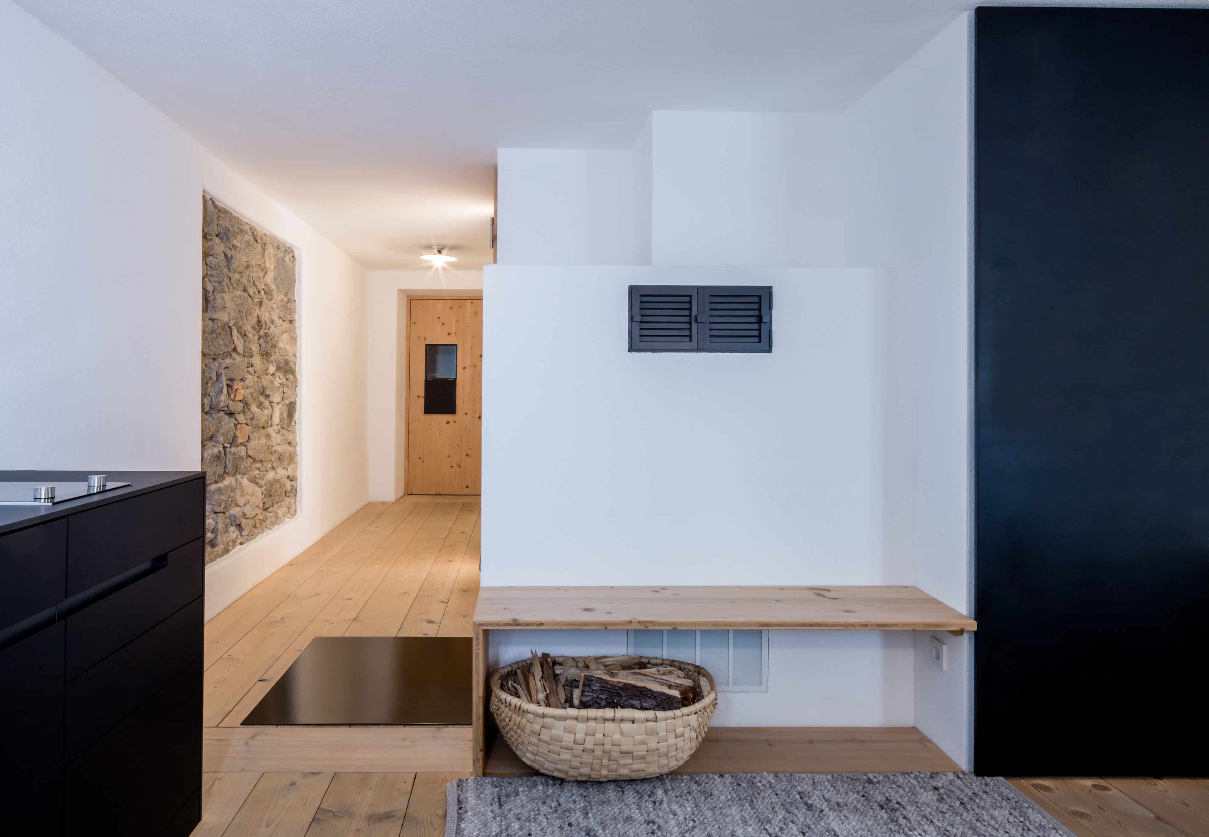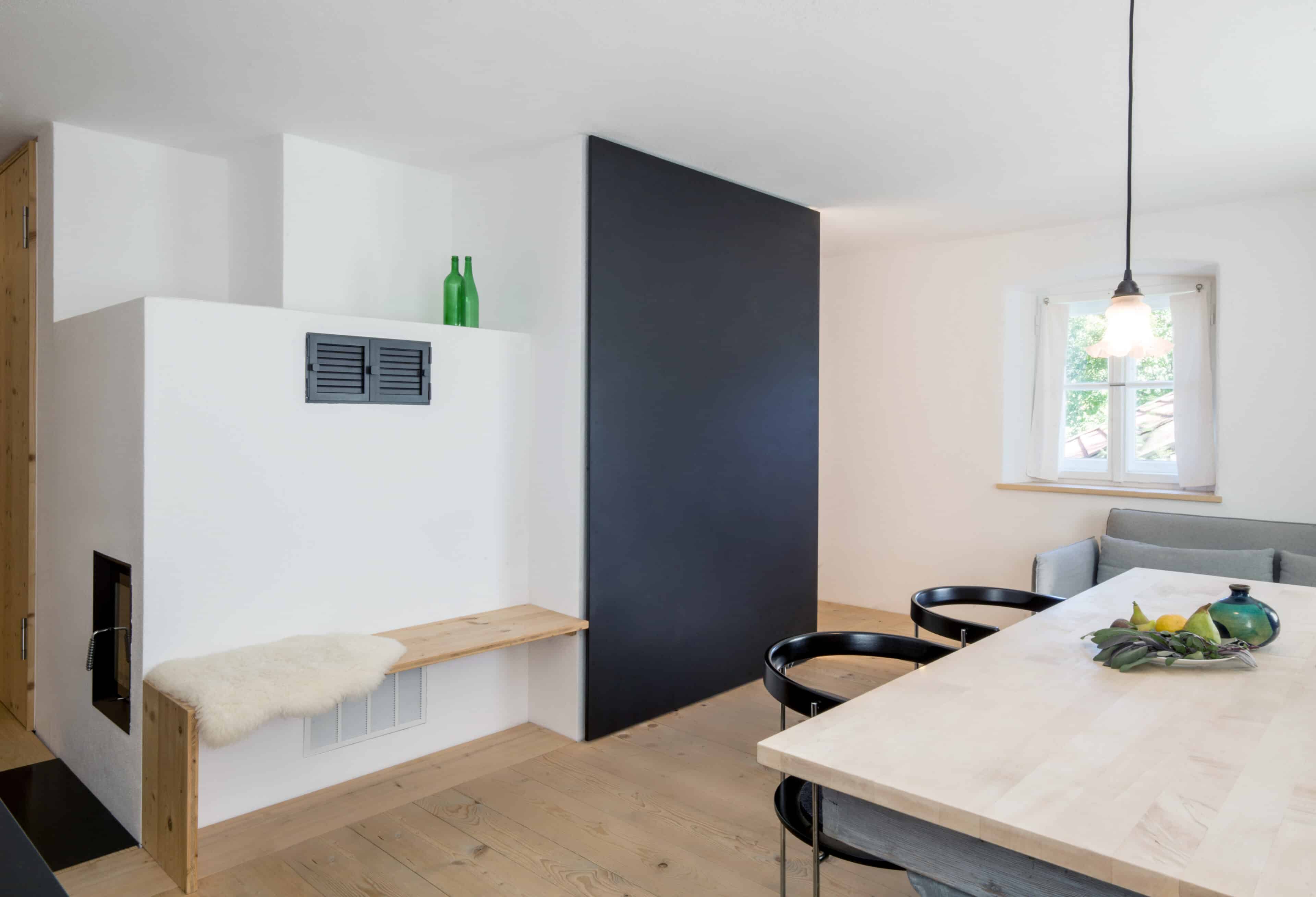 - die beiden Ferienwohnungen im Moosham 13 haben als einzigen Verweis auf ihre bäuerliche Herkunft ihre schönen Fenster behalten, alles andere ist weiß und geradlinig und sehr klar, selbst der Kaminofen ist weiß verputzt