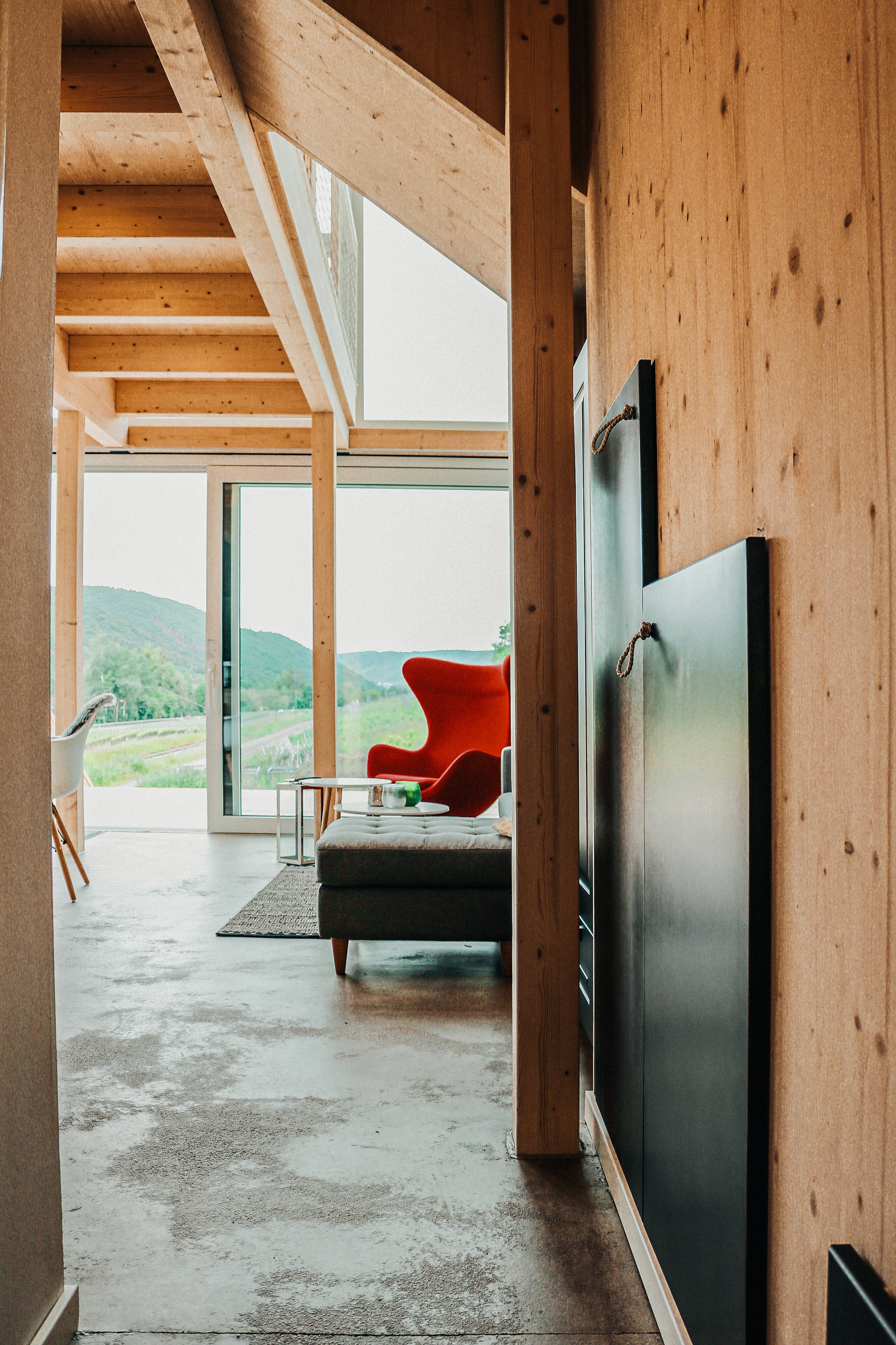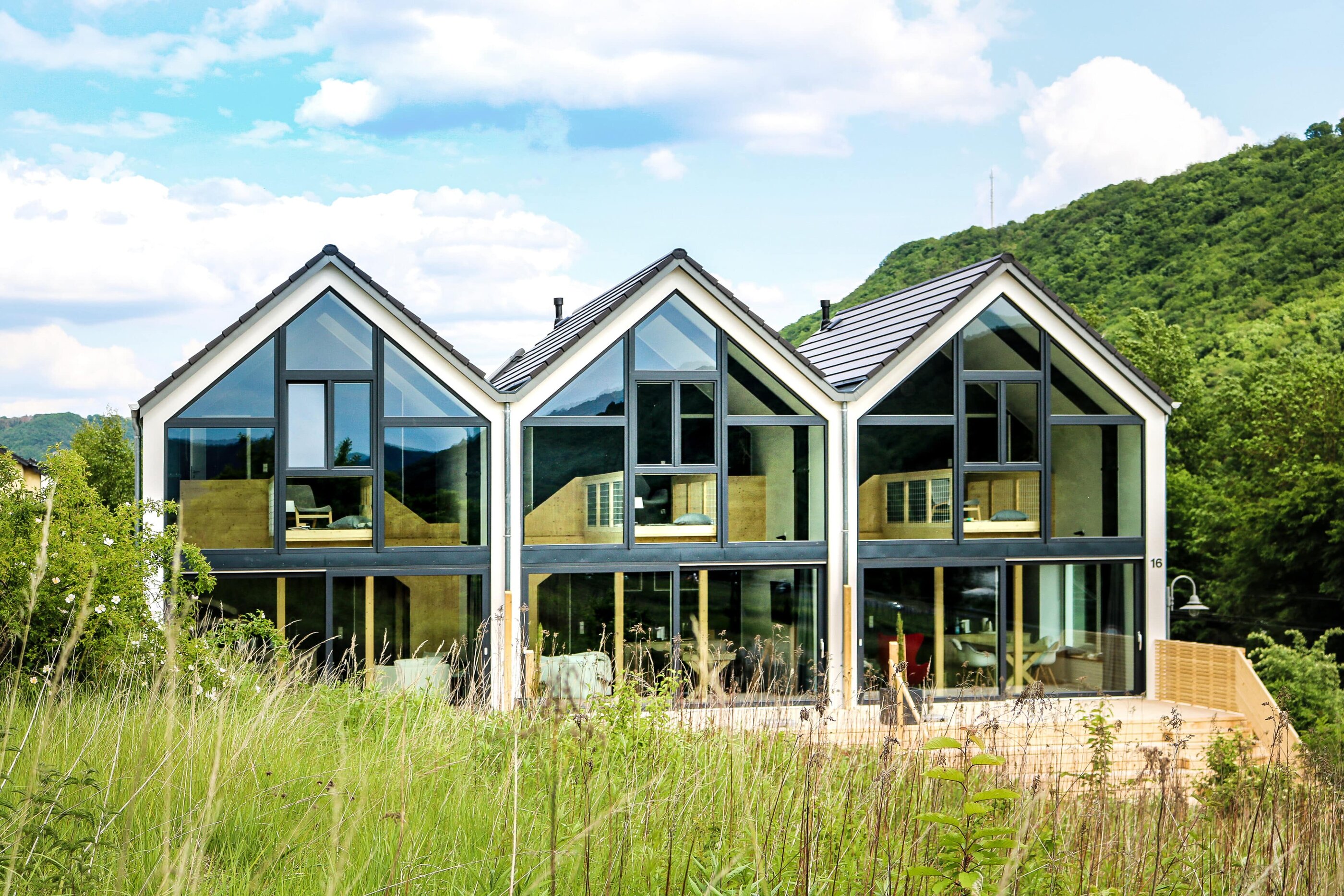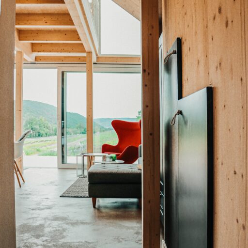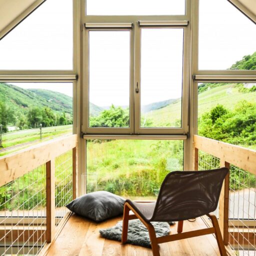 Fast genauso schön wie „Wein-Trinken“ ist das „Wein-Gucken“. In den Design-Häusern der Mosel Chalets kann man den Blick durch die große Panoramafensterfront auf den längsten Süd-Weinberghang der Mosel wandern lassen. Und natürlich ist das noch besser – klar, mit einem Glas Wein in der Hand! Wein gehört in dieser Region einfach zum Leben, davon zeugen die zahlreichen ausgezeichneten Winzer im Dorf und in der näheren Umgebung. Für sie alle spielt Qualität eine große Rolle. Und hier schließt sich der Kreis, denn Qualitätsbewußtsein gehört auch zur Philosophie dieser drei hochwertig ausgestatteten Ferienwohnungen. Die Mosel Chalets sind ein Familienunternehmen per excellence: Die Idee für die fabelhaften Häuser in ihrem Heimatort hatte Holger Maurer; seine Schwester Gaby und ihr Mann Andi kümmern sich vor Ort um Haus und Gäste und sind bei Fragen jederzeit zu erreichen, Mama Anni ist auch dabei und seine Lebensgefährtin Jessica hat den Kommunikationspart inne. Die 2019 neu erbauten hochgewachsenen Holzgebäude sind nachhaltig gebaut und betrieben, dazu modern und sehr hochwertig ausgestattet. Wie drei Freunde stehen sie nebeneinander, die Chalets „Mosel“, „Mitte“ und „Berg“ und winken einen freundlich herein. Ein echtes Highlight in der Region. Mit den großen Panoramafenstern hat man von innen einen herrlichen Blick auf die Weinberge, und auch auf der davor gelegenen Terrasse lässt es sich gut leben: hier kann man auf den Terrassenstufen sitzen und kaffeetrinkend ein Buch lesen oder abends gemütlich mit Kerzen und Decke der Sonne beim Untergehen zuschauen. Das ist perfektes Natur-Kino!