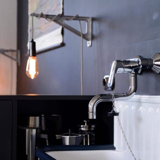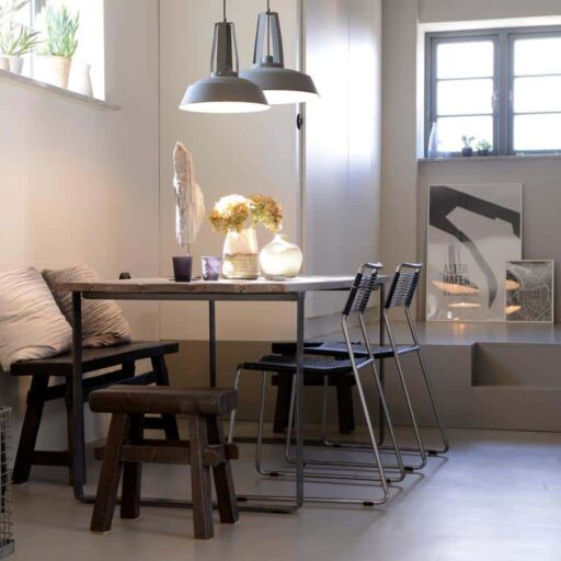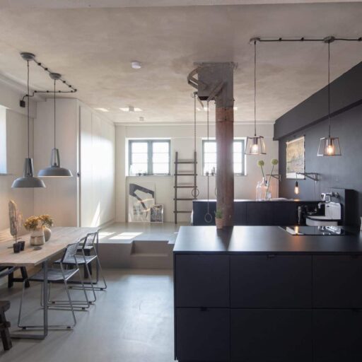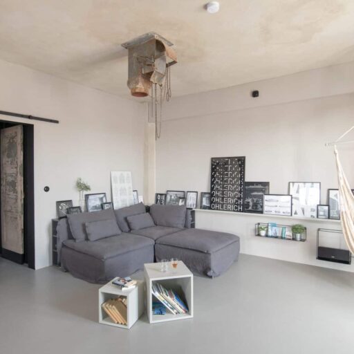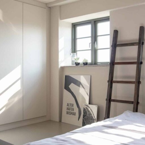 Meerluft schnuppern oder Stadt entdecken? Wer sich nicht entscheiden kann, findet im Hafenstädtchen Wismar das Beste aus beiden Welten. Wunderschöne Strände nur einen kurzen Abstecher entfernt, eine bezaubernde Altstadt, die zum Weltkulturerbe gehört und ganz viel maritimes Flair im Hafen mit Fischbrötchen und Kutter gucken. Einen herrlichen Blick auf das Bilderbuchgewimmel von Altstadt und Hafen hat man vom Balkon (und vom Sofa! Und von der Hängeschaukel!) des Ohlerich Apartment in einem denkmalgeschützten Getreidespeicher. Überaus fotogen präsentiert es sich, das 55 qm große Ferienapartment – mit seinen Betonböden, dem schwarzen Küchenblock und der Farbgestaltung in Schwarz, Weiß und Grau. Ein Mix aus coolem Loft und Industriedenkmal. Denn so Einiges, was noch aus dem früheren Leben als Getreidesilo stammt, wurde kurzerhand ins neue Zuhause integriert. So durften z.B. zwei alte Schüttrohre hier wohnen bleiben, ein altes Ausgussbecken ziert dekorativ die Küchenwand und historische Türen wurden in Schiebetüren verwandelt oder dienen jetzt als Tischplatte. Die beiden kreativen Eigentümer aus Berlin haben sich akribisch mit der Vergangenheit des denkmalgeschützten Speichergebäudes von 1938 auseinandergesetzt und viele liebevolle Details wie Bakelitschalter, Industrielampen und vor allem Fotos und Grafiken ergänzt. Genau die richtige Mischung aus moderner Coolness und Respekt vor der Vergangenheit, die man sich für diesen Ort wünscht.