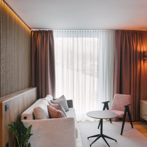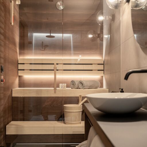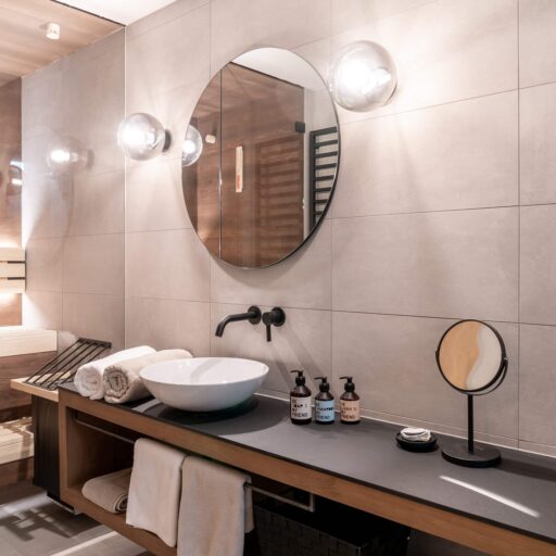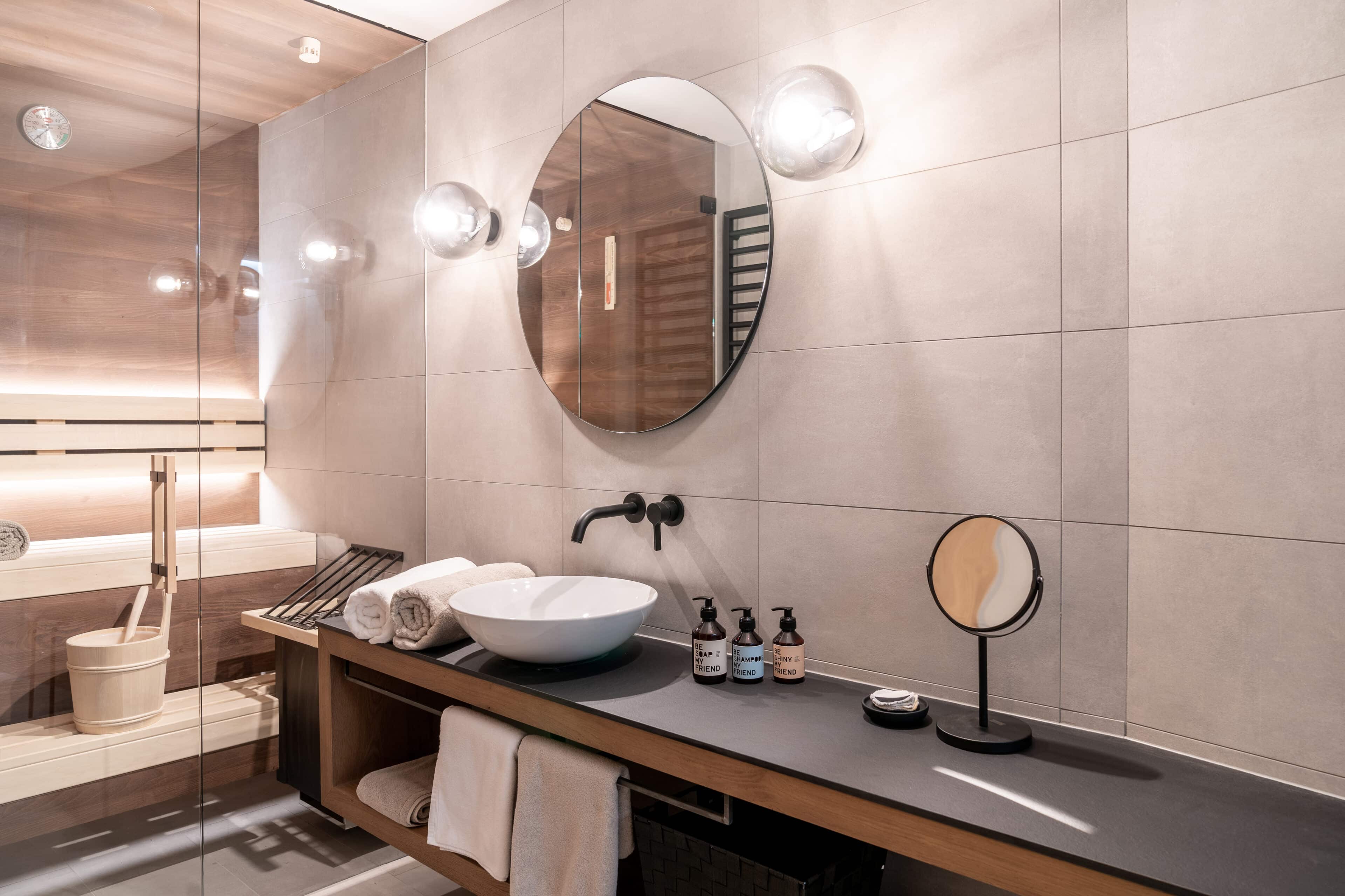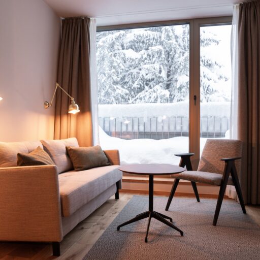 Meist sind es die kleinen Dinge, die darüber entscheiden, ob wir uns an einem Ort gleich so richtig willkommen fühlen. In diesem gemütlichen Domizil in St.Anton am Arlberg gibt es davon eine Menge: Frische Milch und Mandelmilch stehen bei Ankunft in den vier Ferienwohnungen bereit, an der „Vino-Take“, der Wein- und Getränkebar in der Lounge, erinnert eine Tafel mit der entlastenden Botschaft „Vacation Calories Don’t Count“ daran, dass ab jetzt Loslassen angesagt ist, und in Bonbon-Gläsern wartet Süßes „für die Liftfahrt“. Das Resultat: Man hat gerade erst den Koffer abgestellt, schon denkt man über eine Dauermiete nach. Die Gastgeber Lisa und Martin Zangerl, beide in der Region aufgewachsen, haben sich diesen Kniff von einem Familienmitglied abgeschaut: Ihrer Oma Ela, die nicht nur eine Genießerin ist, sondern vor allem eine gute Gastgeberin, bei der sich alle rundum wohlfühlen. Das Mountain Hideaway steht genau dort, wo Skipiste und Dorf aufeinandertreffen, sprich: gleich neben der Talstation der Nassereinbahn, die ins Arlberg-Skigebiet führt. Das Zentrum von St.Anton ist zu Fuß erreichbar, aber weit genug entfernt, um vom möglichen Après-Ski-Trubel im Ort rein gar nichts mitzubekommen. Die wohlige Atmosphäre kommt aber nicht nur durch die großmütterlichen Einflüsse, sondern auch daher, dass es tatsächlich ein Zuhause ist: Die geräumigen Apartments, die seit Dezember 2020 Feriengäste beherbergen, befinden sich im ersten und zweiten Stock, Lisa und Martin wohnen mit ihren zwei Kindern unterm Giebeldach. Der entspannte Rückzugsort wirkt von außen reduziert, innen sorgen natürliche Farben, dezente Muster und eine kleine private Sauna in jeder Wohnung dafür, dass man auch eine Schlechtwetterfront hier problemlos verschmerzen würde.