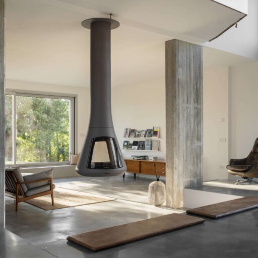- den freihängenden Holzkamin im Wohnzimmer, der selbst dann ein Hingucker ist, wenn gerade keine Flammen darin lodern