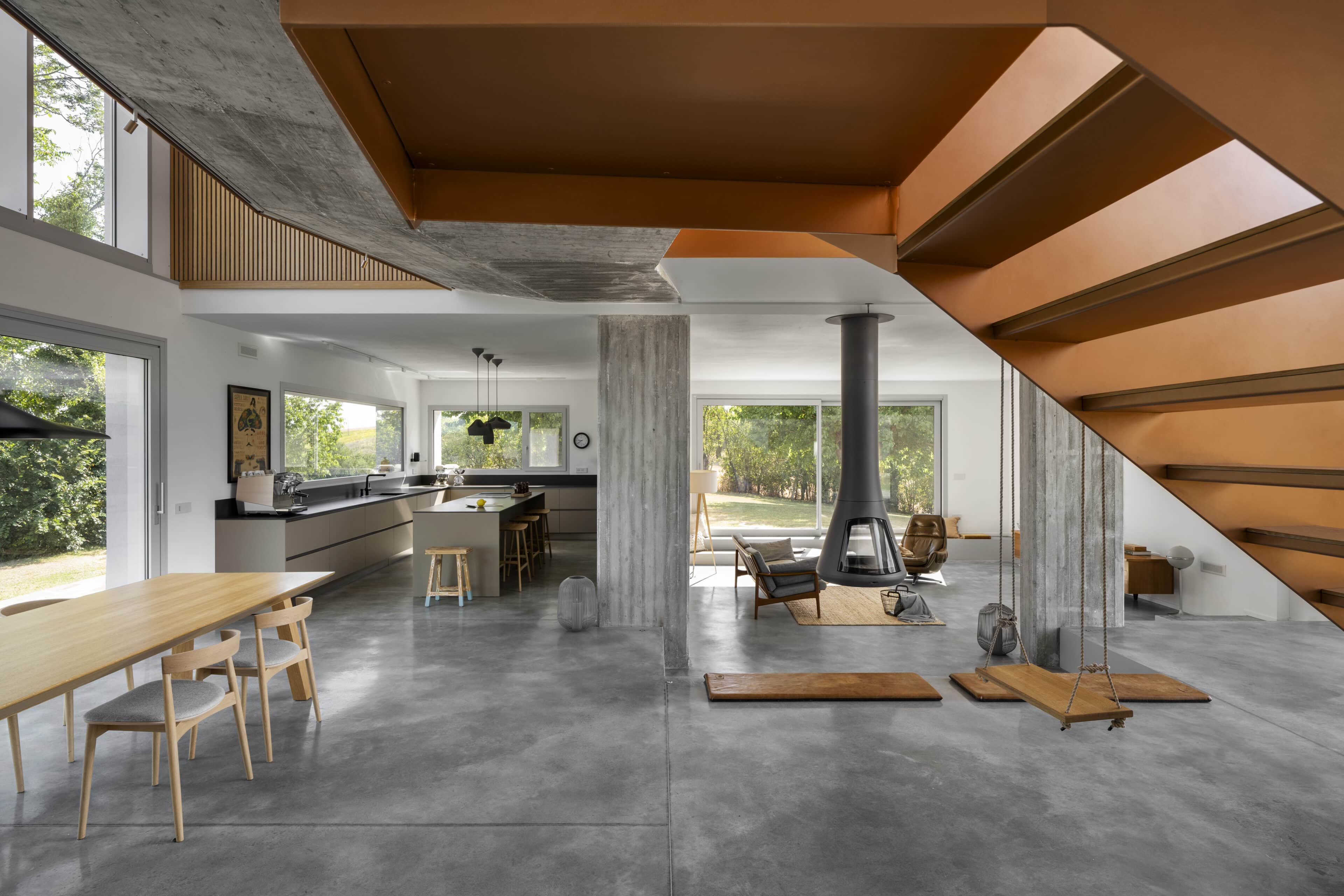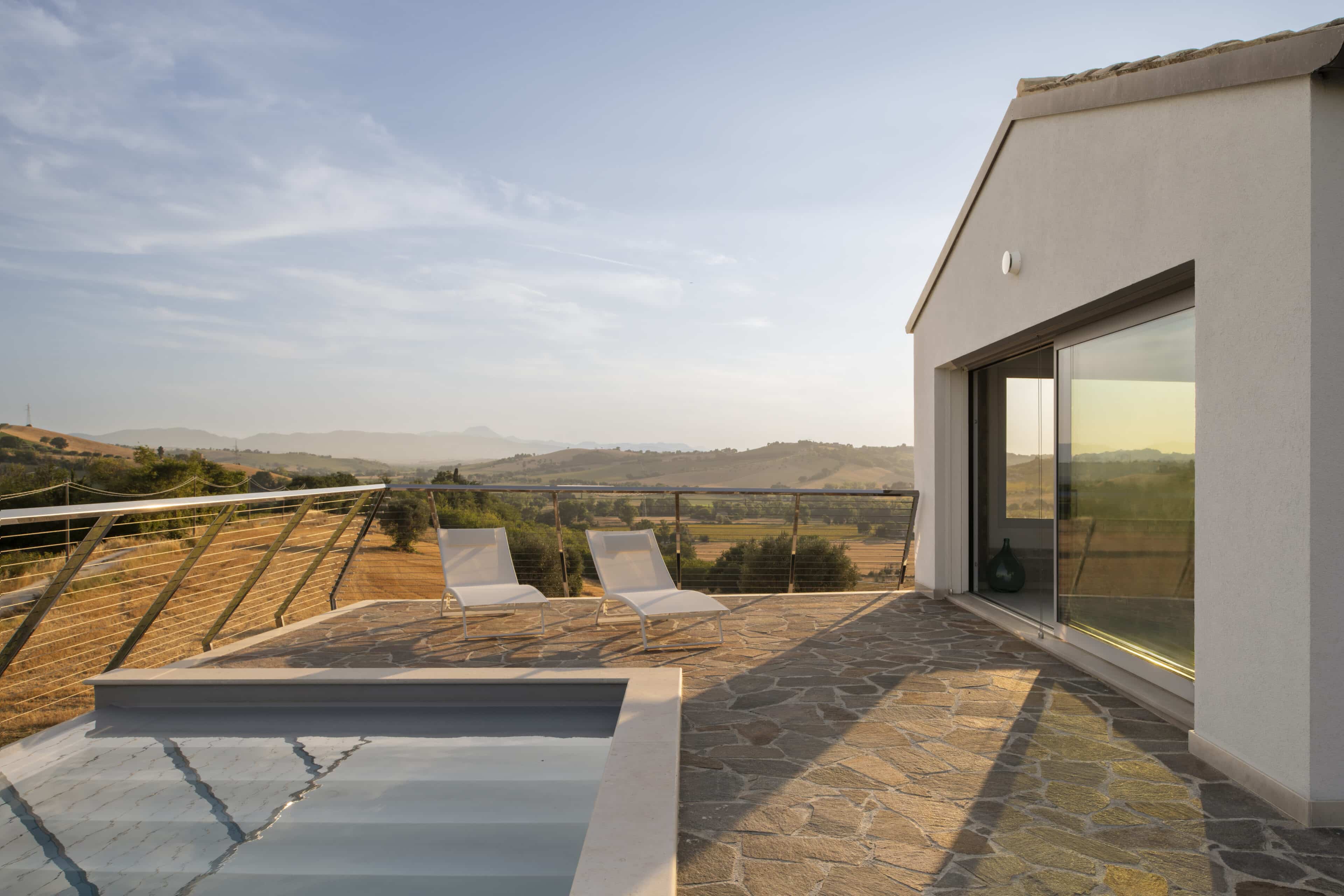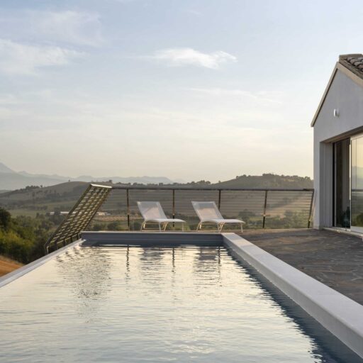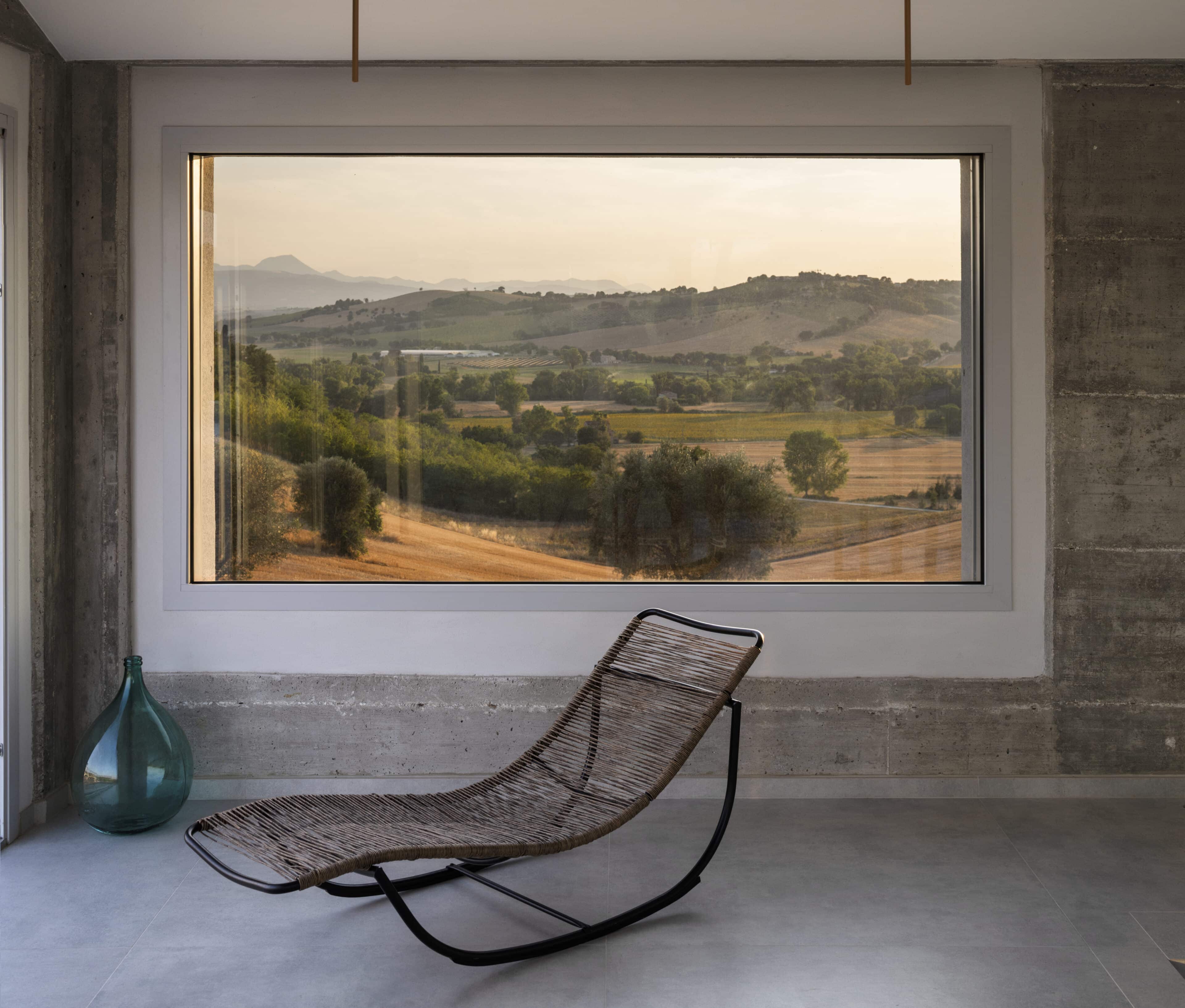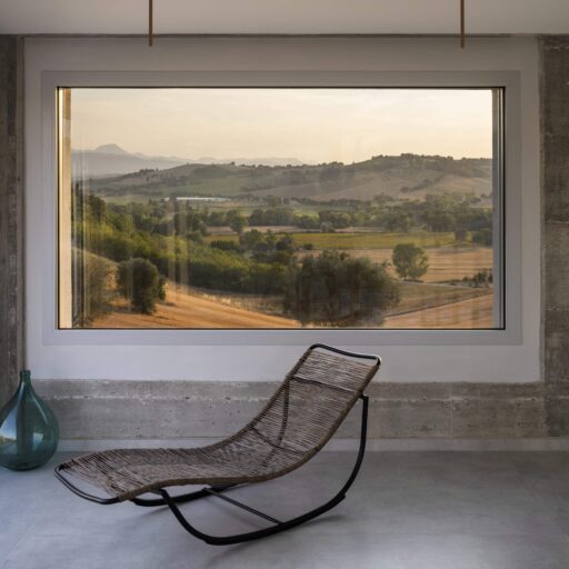 Schon der Name ist eine Einladung, loszulassen und durchzuatmen. „Zeitvertreib“ bedeutet er wortwörtlich, mit „die Seele baumeln lassen“ ließe er sich aber ebenso gut übersetzen. Wo könnte das besser klappen als an diesem verträumten Fleck in den italienischen Marken? Dort, wo früher ein altes Bauernhaus langsam verfiel, steht heute ein Architektenhaus mit Panoramafenstern, die den Blick auf sanfte Hügel und Felder bis zu den Monti Sibillini freigeben. Neben der Natur gibt es hier aber noch einen weiteren großen Star. Wer das familiengeführte Bed & Breakfast betritt, dem fällt direkt die riesige Stahltreppe ins Auge, die zu schweben scheint, Gemeinschaftsbereiche verbindet und fast an ein skulpturales Kunstwerk erinnert. Das offene Konzept verströmt ein luftiges Raumgefühl, das cleane, nordische Design mit viel Stahl, Beton, Glas und Holz vermittelt Klarheit. Spätestens, wenn man von hier auf Kakteen, Rosmarin und Palmengewächse im Garten schaut und der Abend alles in warmes Licht taucht, stellt sich die berühmte italienische Leichtigkeit ein. Zum Glück ist so ein Urlaub ja dafür gedacht, diesem Gefühl auch nachzugehen. Dann heißt es, sich mit eiskaltem Spritz, Oliven und Grissini am Salzwasserpool einzufinden und der Sonne beim Untergehen zuzusehen. Das ist aber nur eine von vielen Optionen, hier zu entspannen. Auf der Schaukel in der Mitte des Wohnzimmers, dem kuscheligen Platz am Holzofen oder im geflochtenen Schaukelstuhl vorm Panoramafenster geht das ganz genauso schön. Im passa.tempo erinnern wir uns wieder daran, die kleinen Momente zu feiern: den ersten Cappuccino in der Morgensonne, ein gutes Buch im Schatten alter Bäume, den Blick in die Sterne – und das alles vor allem mit ganz viel Ruhe und Zeit.
