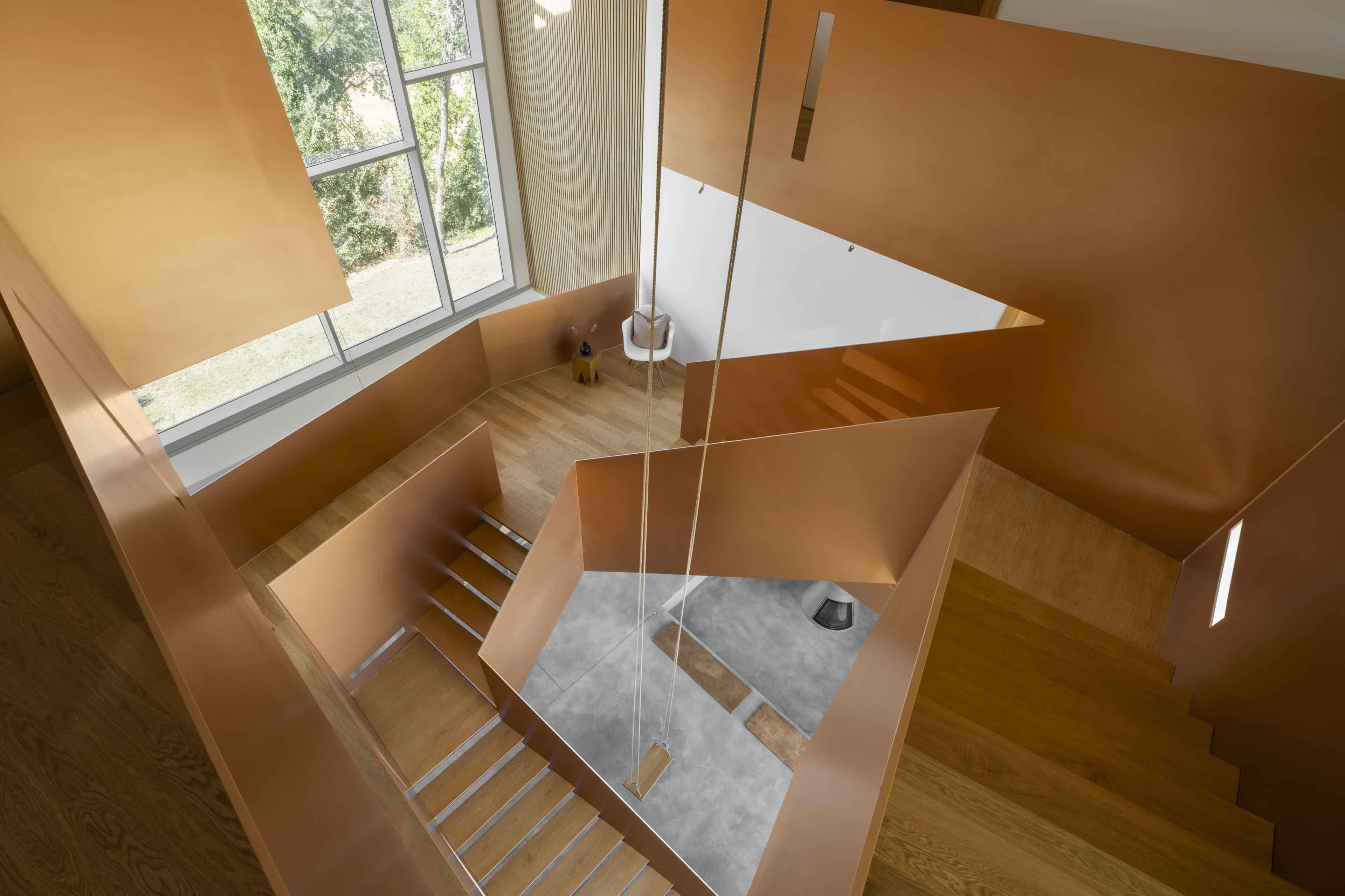 - wie sich die klare Form des Hauses an traditionellen Bauernhäusern in der Region anlehnt. Im Inneren wird die ursprüngliche Aufteilung aus ebenerdigem Stall, Wohnbereich im ersten Stock und Satteldach aufgebrochen und geschickt neu strukturiert