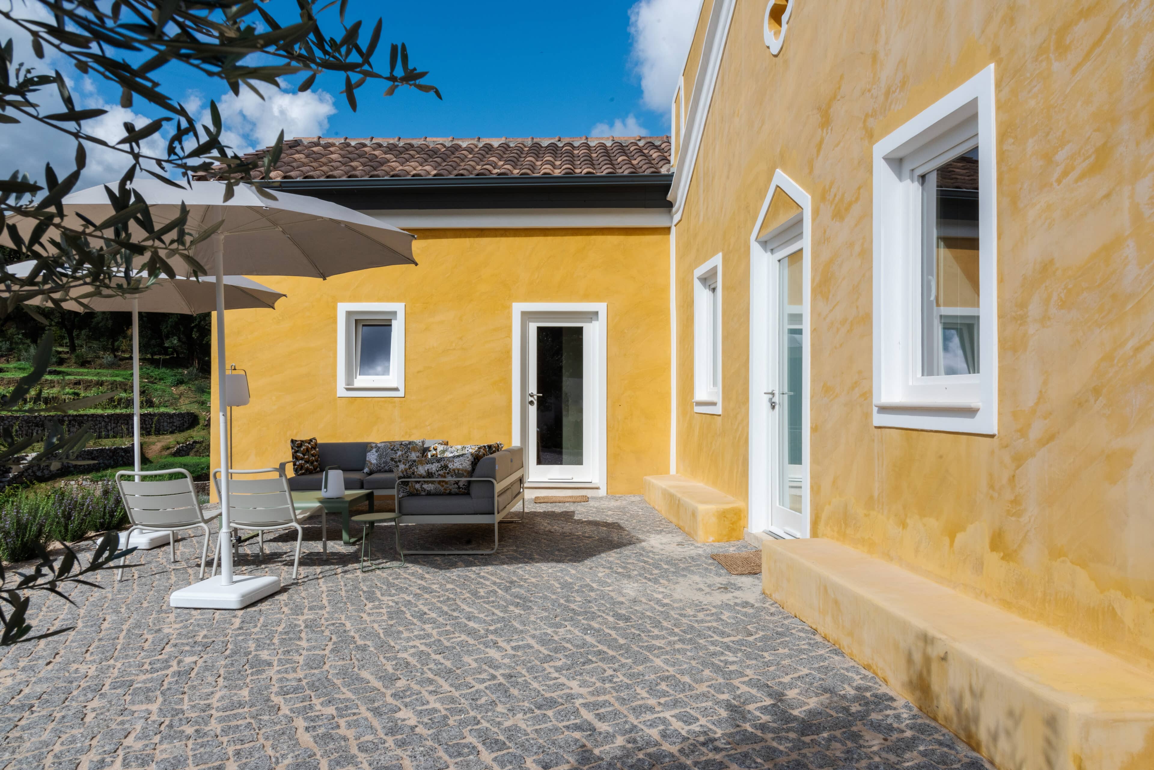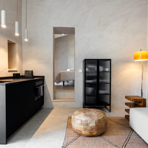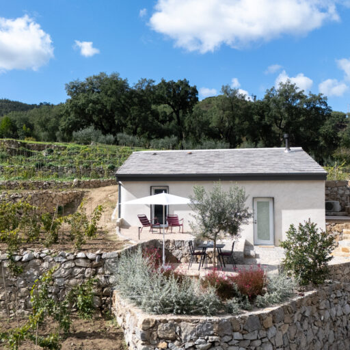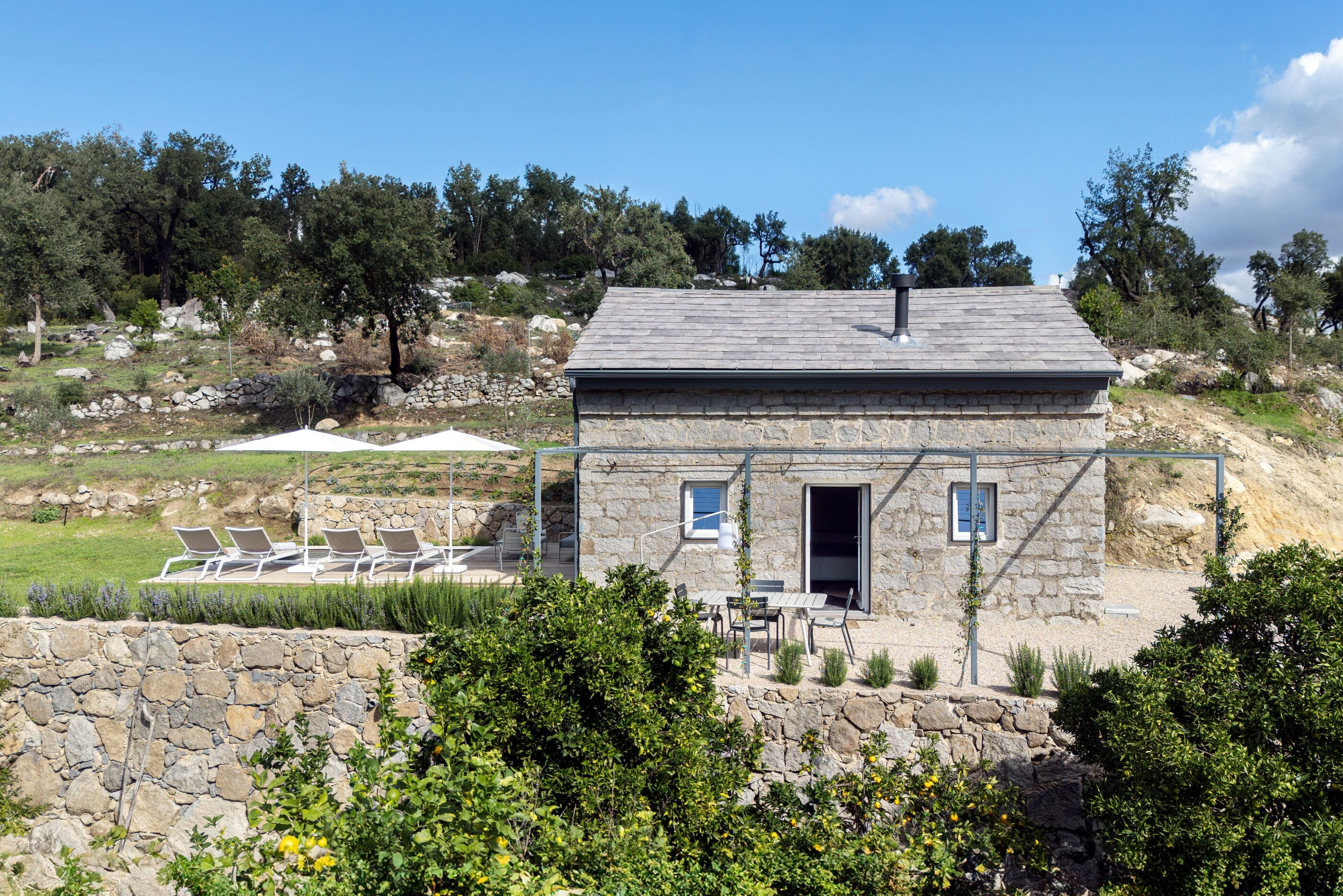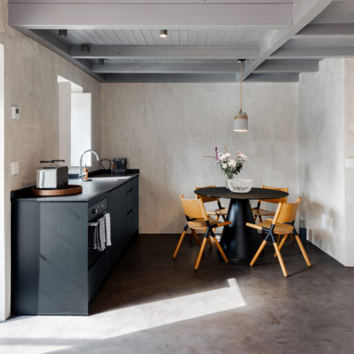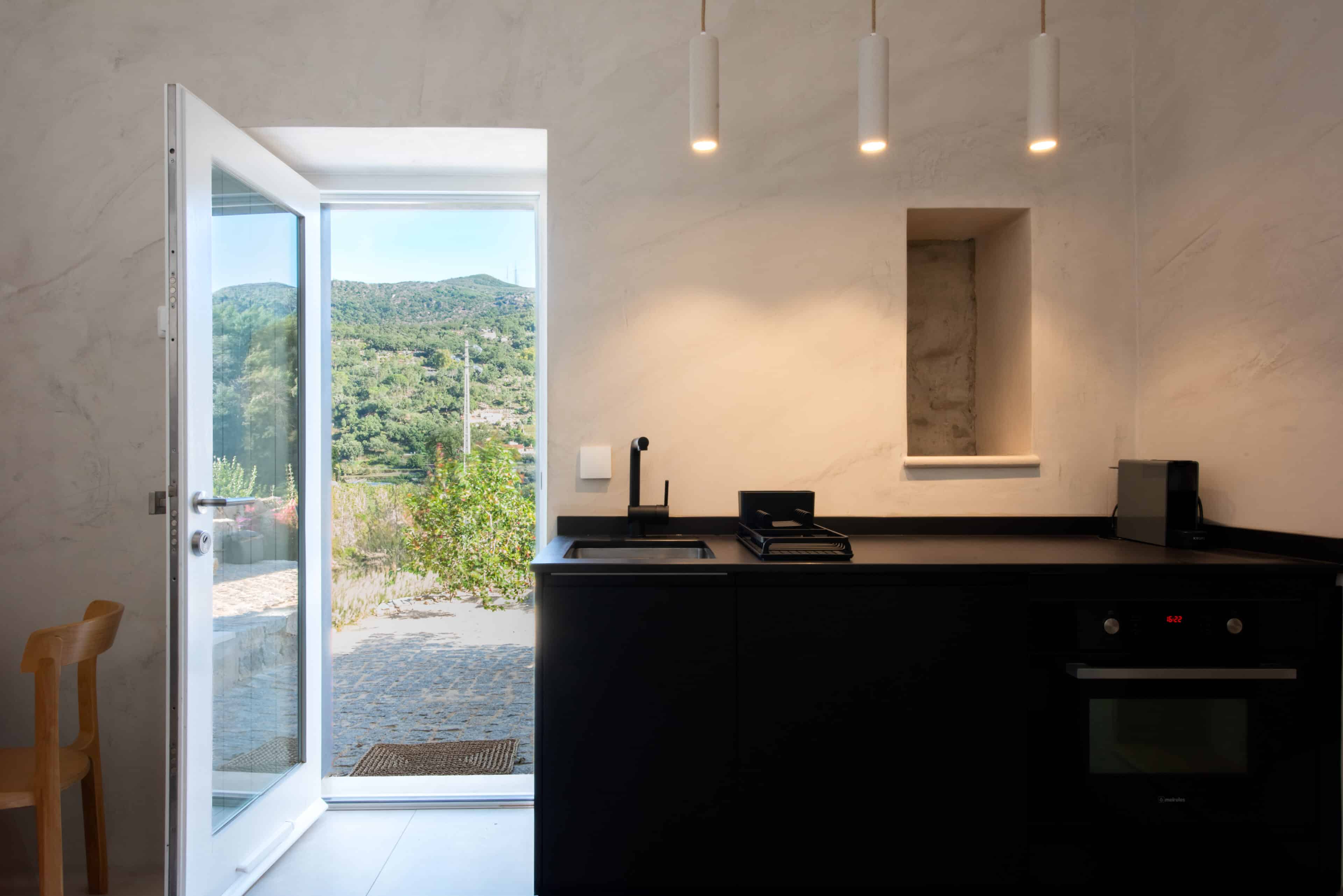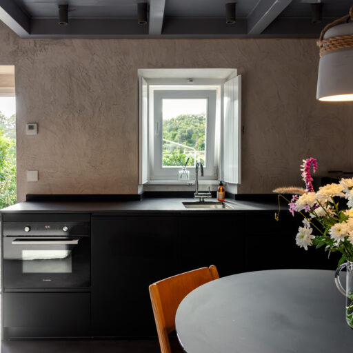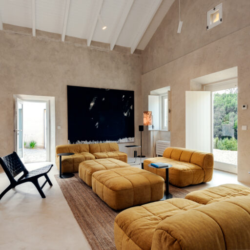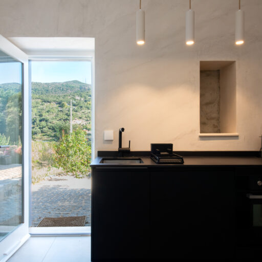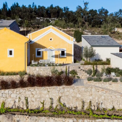Wenn wir uns dem Landgut im ruhigen Bergland der Algarve nähern, fallen zuerst die von Steinmauern eingerahmten Terrassen ins Auge. Weinreben wachsen hier, Oliven- und Mandarinenbäume. Von einer Anhöhe überblicken drei Ferienhäuser mit historischem Charme die Umgebung. Als Herman und Angela, ein niederländisch-brasilianisches Paar, das Land im Jahr 2021 erwarben, befanden sich darauf nur Ruinen. Nach und nach bauten sie den alten Hof zu einem Rückzugsort für Feriengäste um. The Yellow House besteht aus drei separaten Gebäuden und eignet sich für all jene, die gern zusammen reisen, aber auch Wert auf Freiraum legen. Das aus rauem Stein gebaute The Granite House verfügt über einen Obst- und Kräutergarten, in dem auch die seltene Apfelsorte Pera de Monchique gedeiht. Von der früheren Backstube, heute The Baker’s Cottage, blickt man auf Picota, den zweithöchsten Gipfel der Algarve. Die Gastgeber lieben Vintage-Stücke und sind überzeugt, dass sie einem Raum Seele verleihen. Da können wir nur zustimmen. Besonders, wenn sie so gekonnt mit minimalistischem Luxus kombiniert werden wie hier: mit mattschwarzen Aluminiumküchen, kalkverputzten Wänden – und duftenden Blumen aus dem Garten.