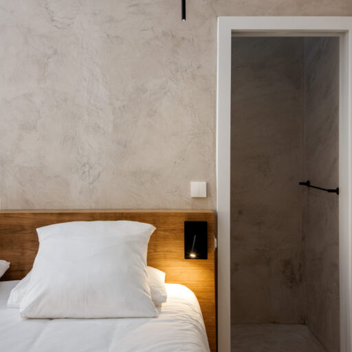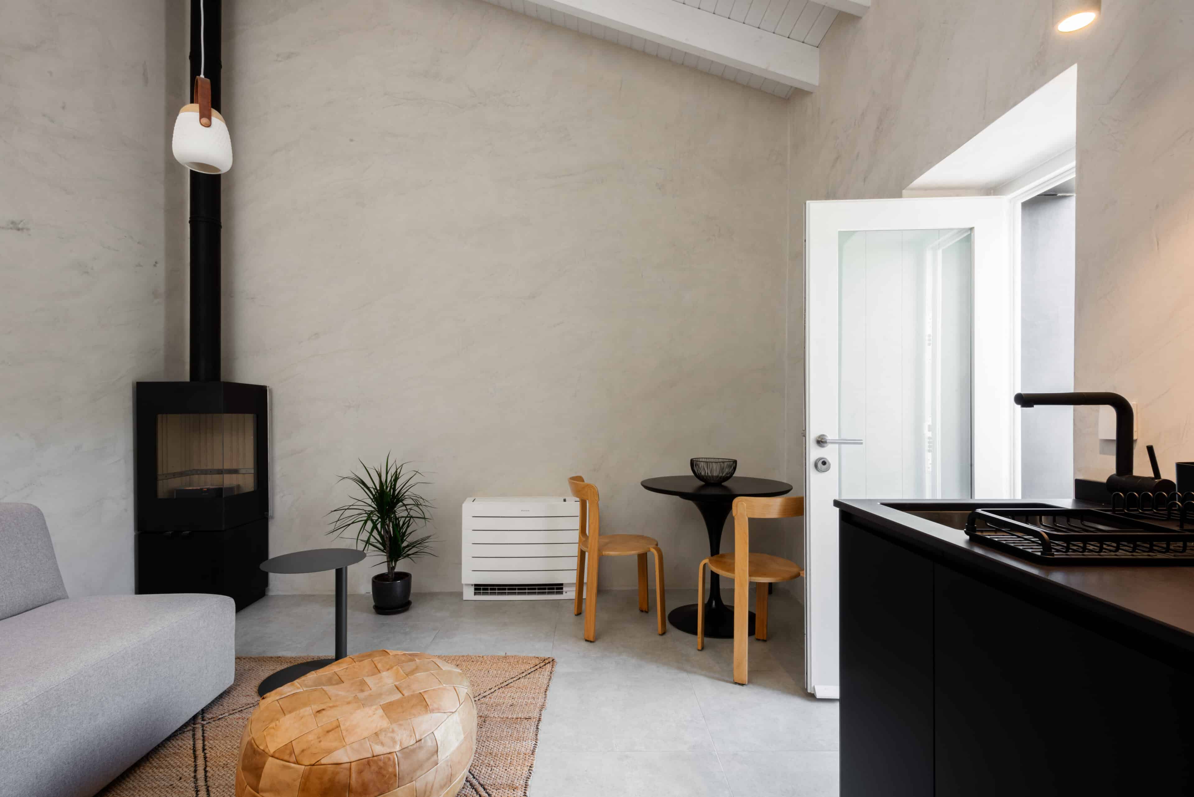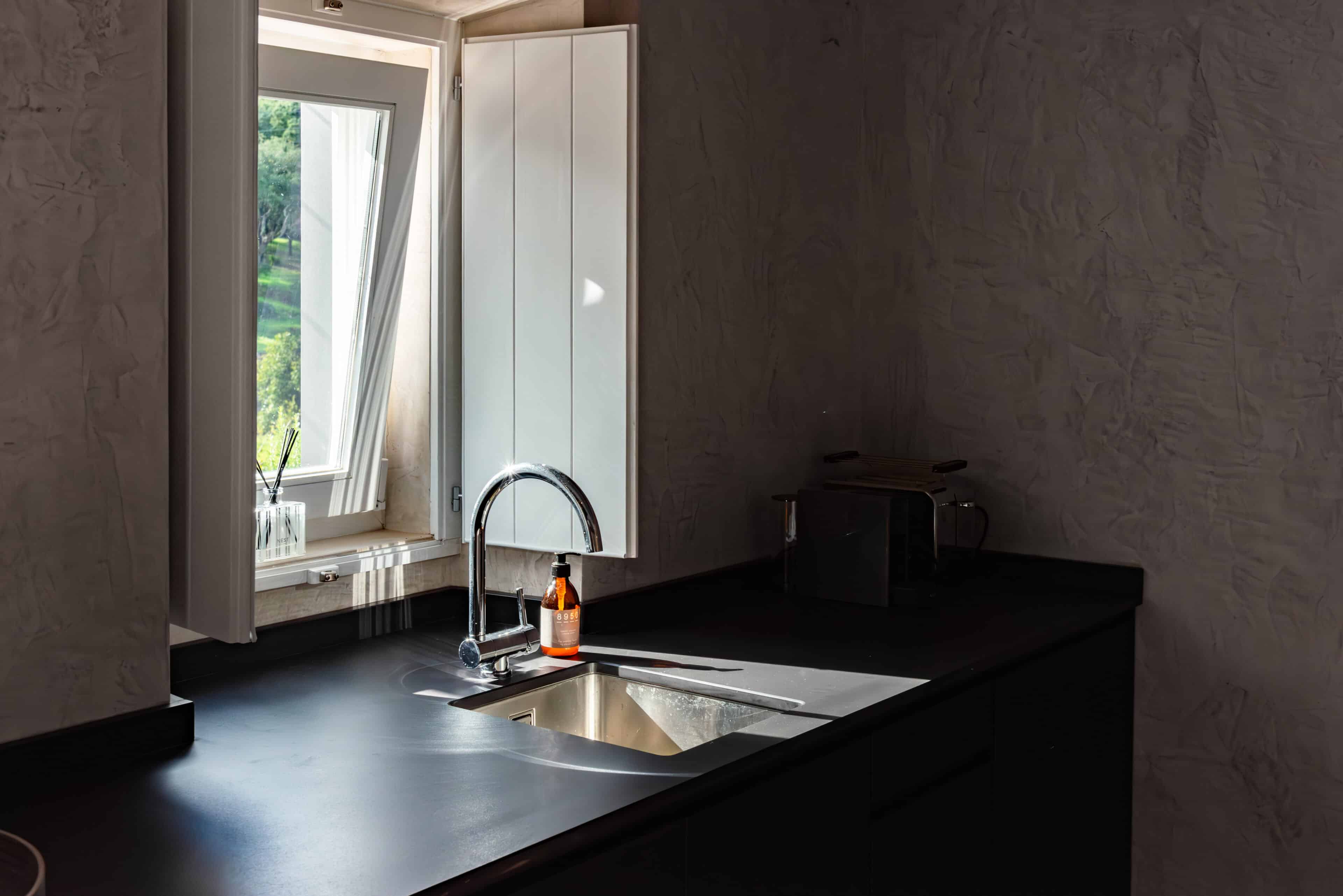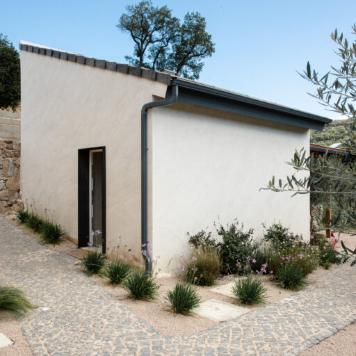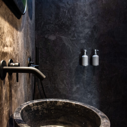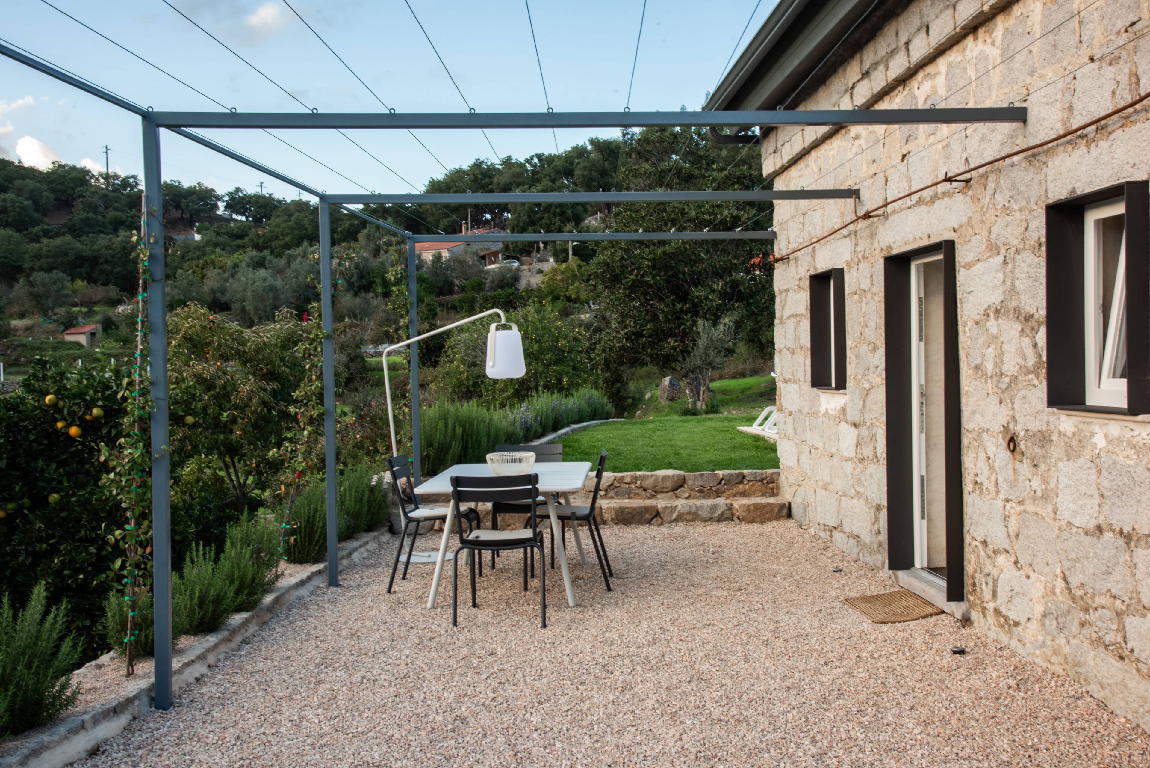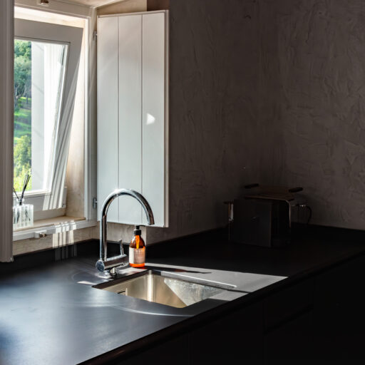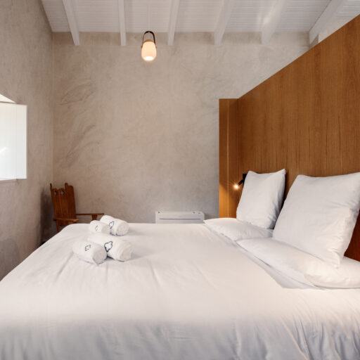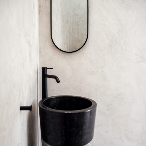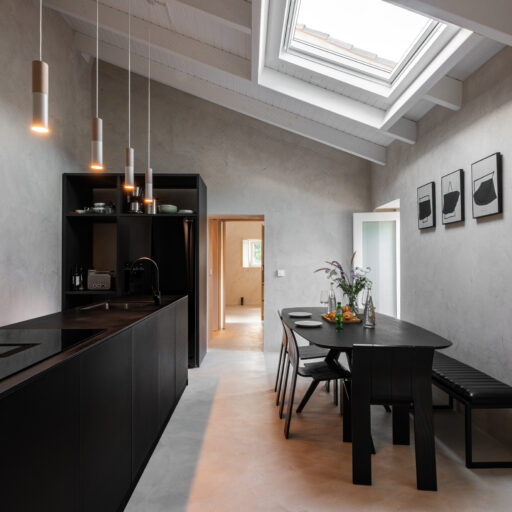 Wenn wir uns dem Landgut im ruhigen Bergland der Algarve nähern, fallen zuerst die von Steinmauern eingerahmten Terrassen ins Auge. Weinreben wachsen hier, Oliven- und Mandarinenbäume. Von einer Anhöhe überblicken drei Ferienhäuser mit historischem Charme die Umgebung. Als Herman und Angela, ein niederländisch-brasilianisches Paar, das Land im Jahr 2021 erwarben, befanden sich darauf nur Ruinen. Nach und nach bauten sie den alten Hof zu einem Rückzugsort für Feriengäste um. The Yellow House besteht aus drei separaten Gebäuden und eignet sich für all jene, die gern zusammen reisen, aber auch Wert auf Freiraum legen. Das aus rauem Stein gebaute The Granite House verfügt über einen Obst- und Kräutergarten, in dem auch die seltene Apfelsorte Pera de Monchique gedeiht. Von der früheren Backstube, heute The Baker’s Cottage, blickt man auf Picota, den zweithöchsten Gipfel der Algarve. Die Gastgeber lieben Vintage-Stücke und sind überzeugt, dass sie einem Raum Seele verleihen. Da können wir nur zustimmen. Besonders, wenn sie so gekonnt mit minimalistischem Luxus kombiniert werden wie hier: mit mattschwarzen Aluminiumküchen, kalkverputzten Wänden – und duftenden Blumen aus dem Garten.