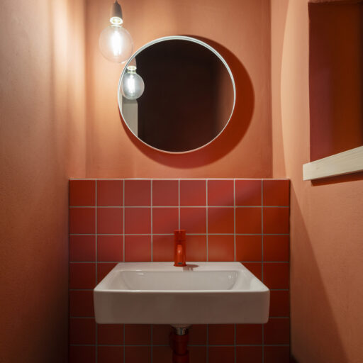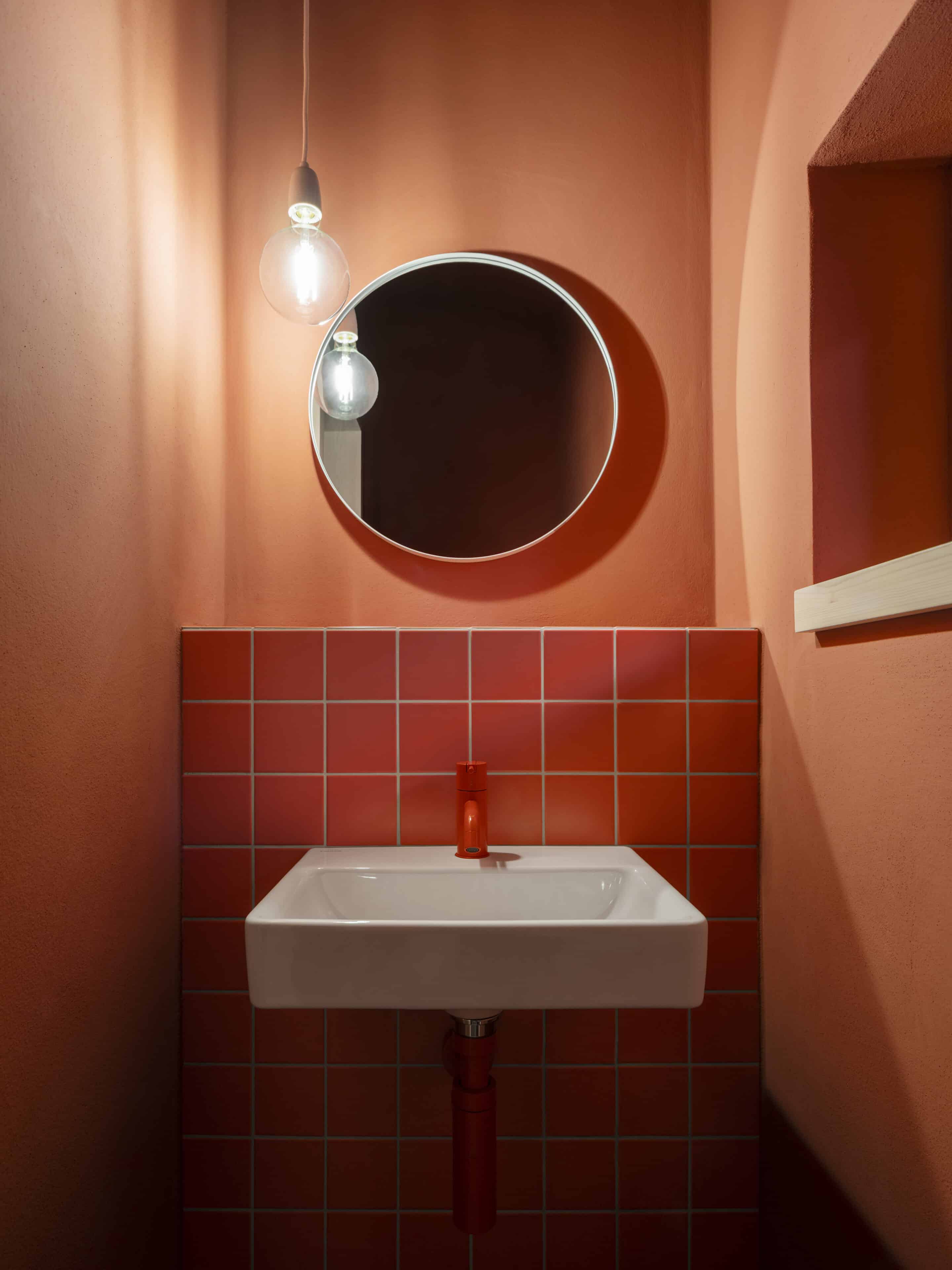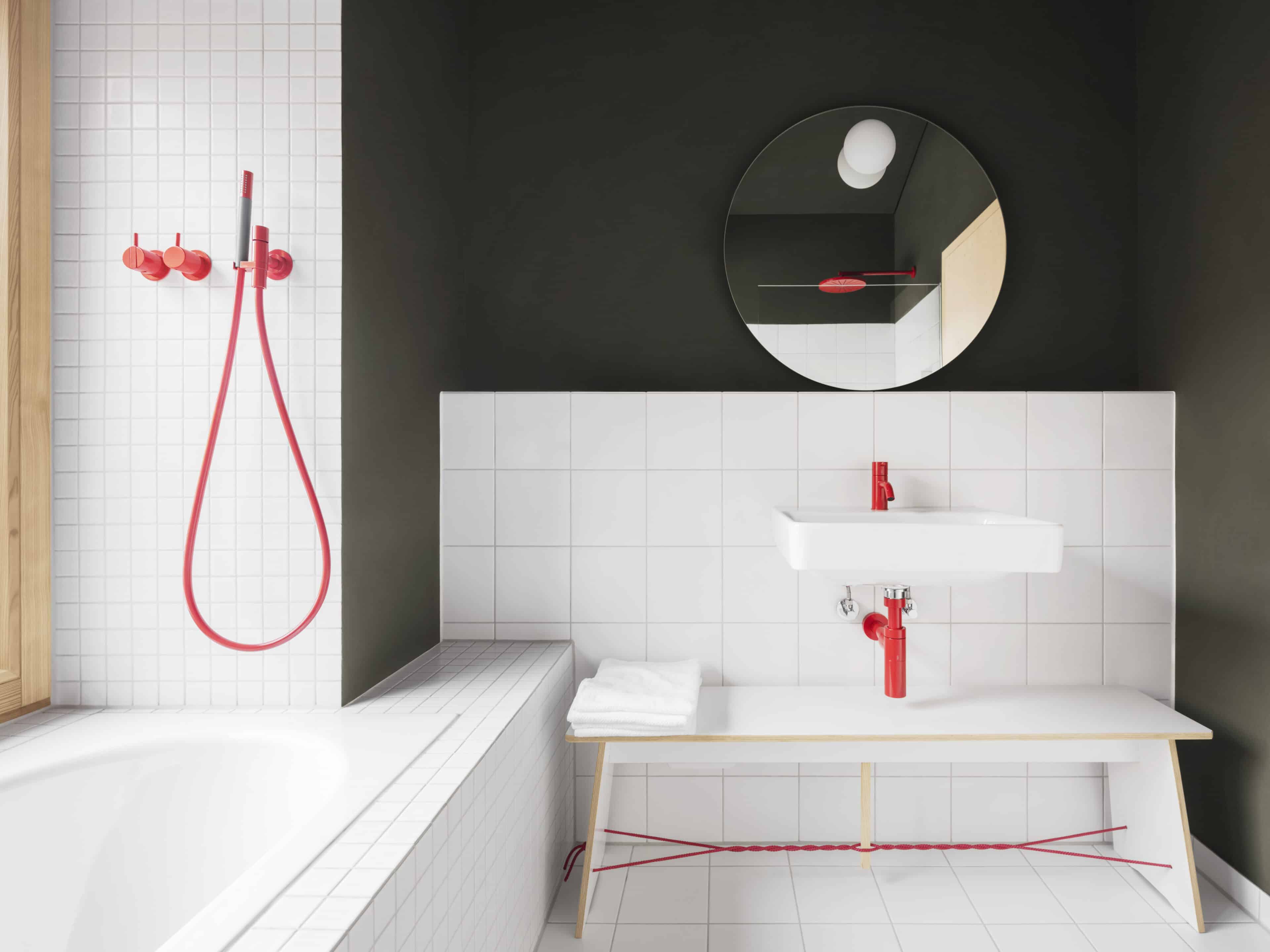- das Farbkonzept, das helle und dunkle Naturtöne kombiniert. Ein paar ausgewählte Details, wie die roten Armaturen in den Bädern sowie Wohntextilien im gleichen Ton, setzen lebendige Akzente