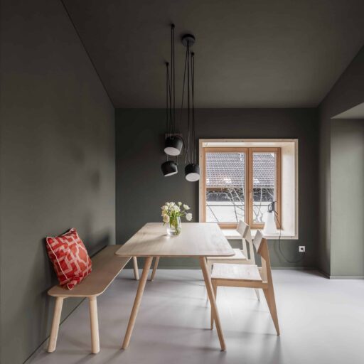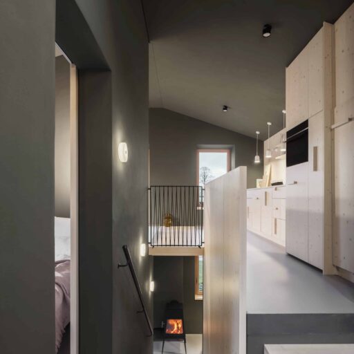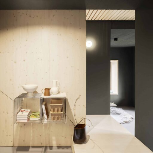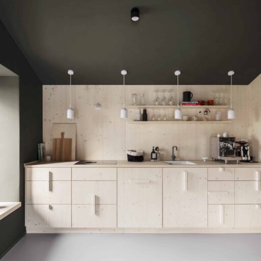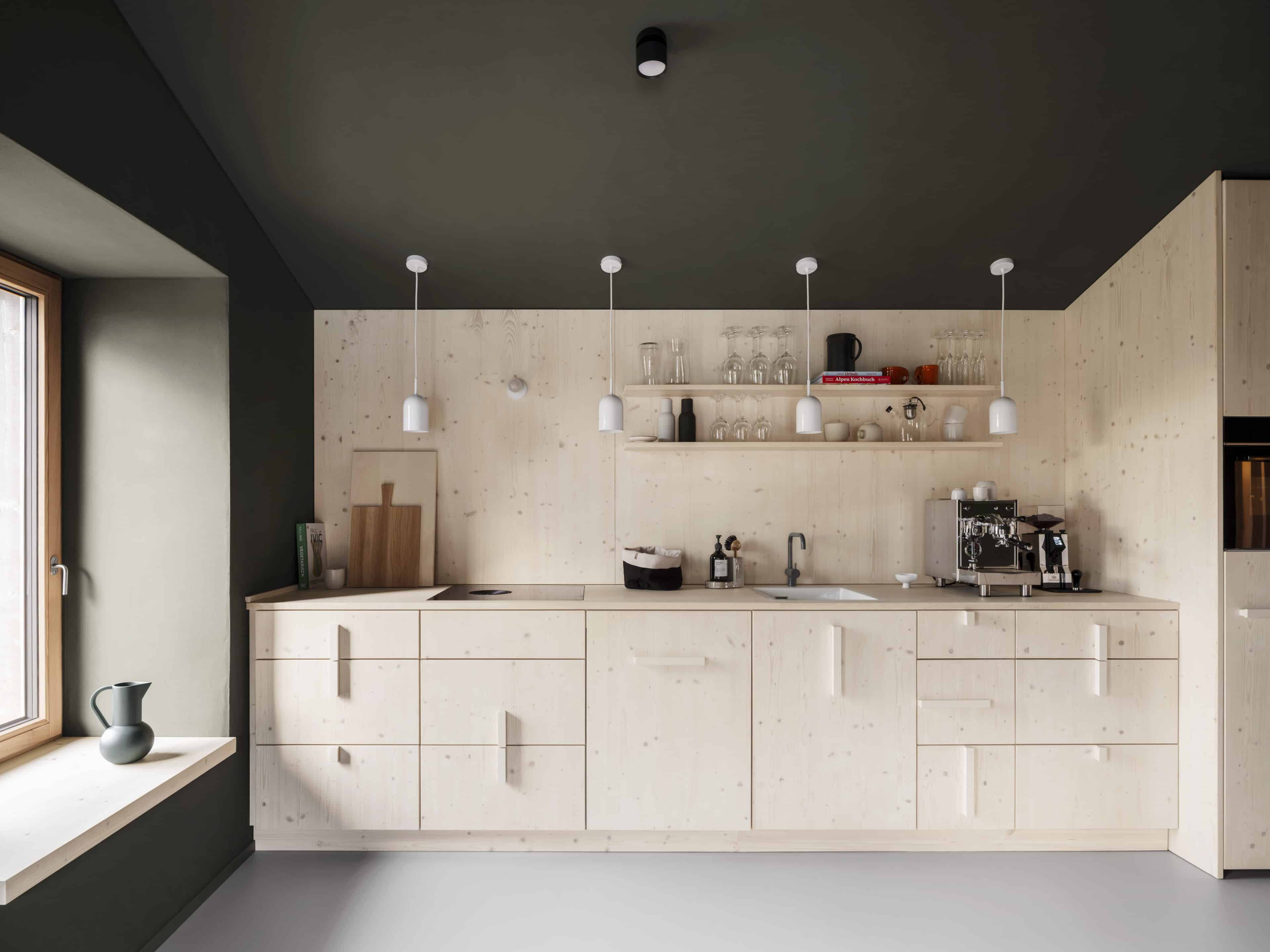 - die klare Geometrie der Einbauküchen aus geweißter Fichte und Ahorn, geplant von der Innenarchitektin Christine Arnhard. Eine Bezzera Siebträgermaschine und Bohnen von der lokalen Rösterei machen Kaffee-Liebhaber glücklich