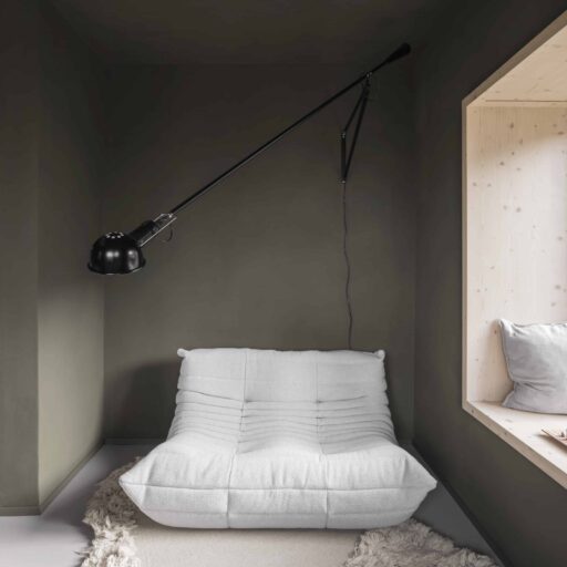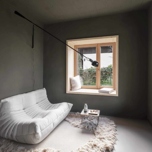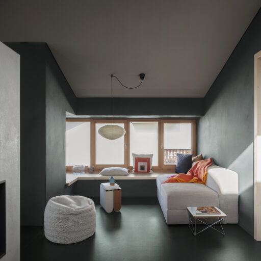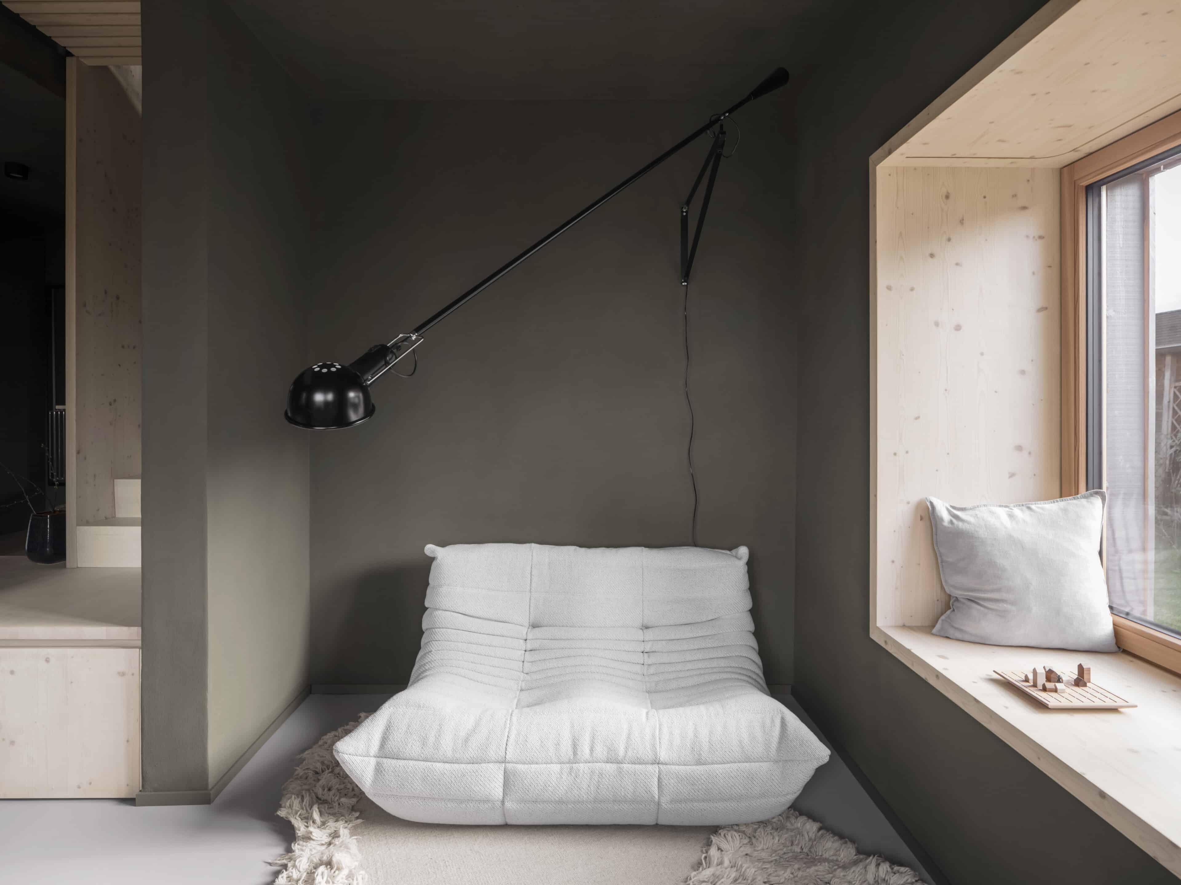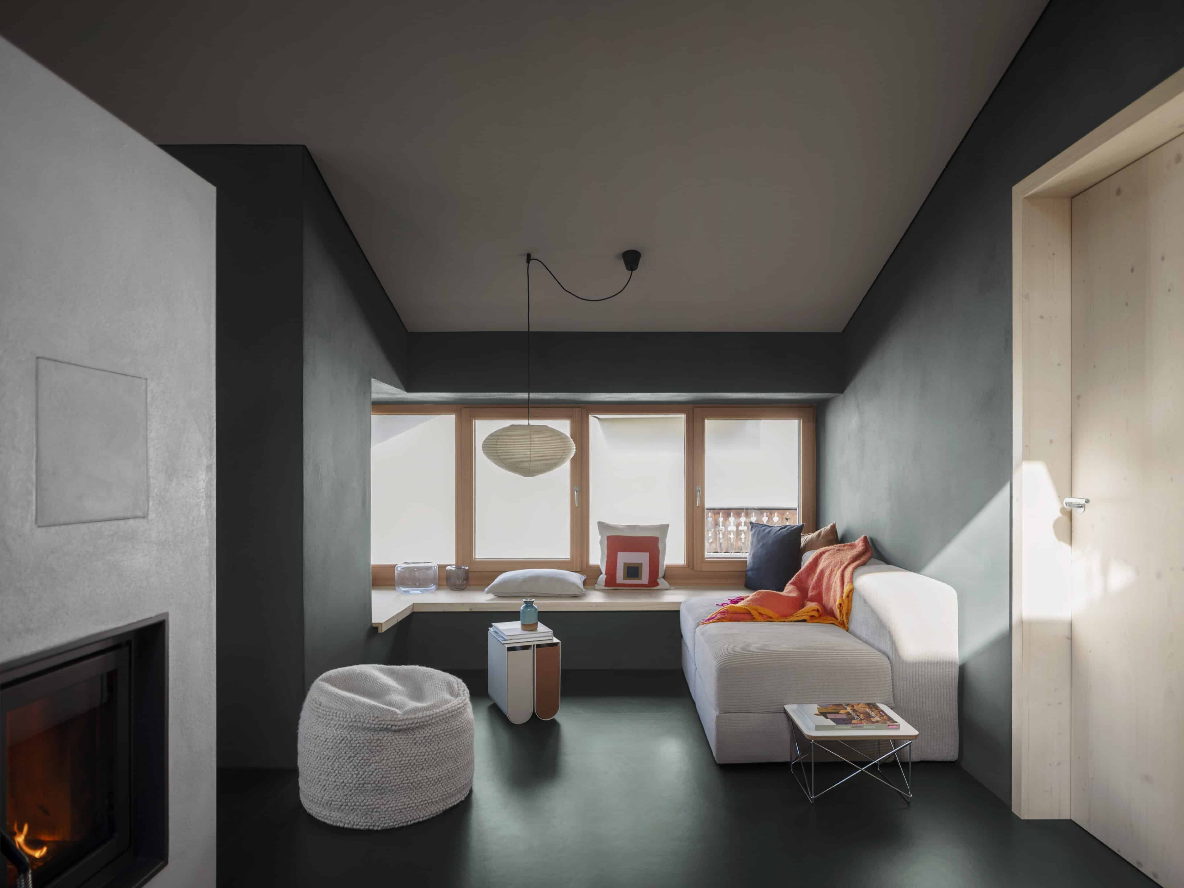 - den Sofakuschelplatz in der „Klara“, ein puristischer Raum mit Wänden in Olivgrün, hellem Mobiliar und einem großen, Fenster, das wie ein Fernseher zu den Alpen wirkt