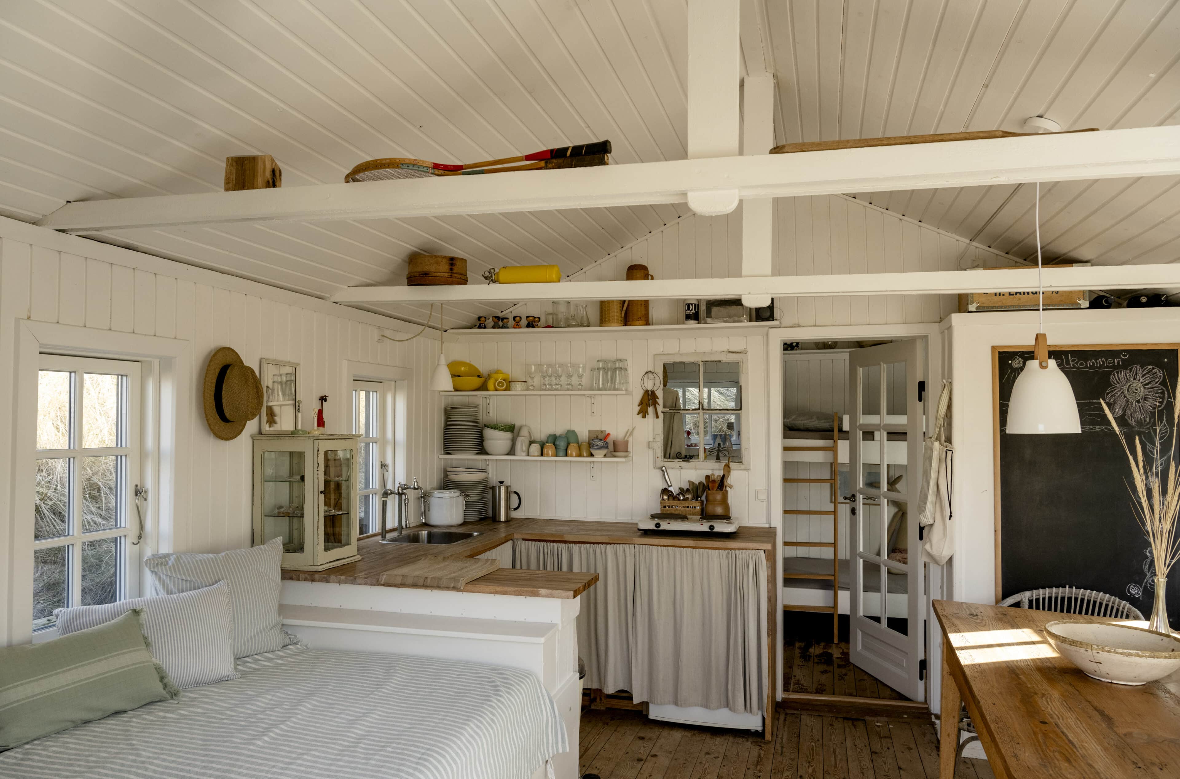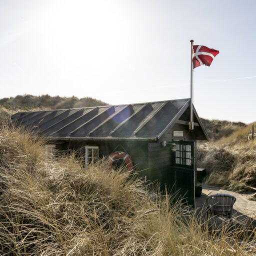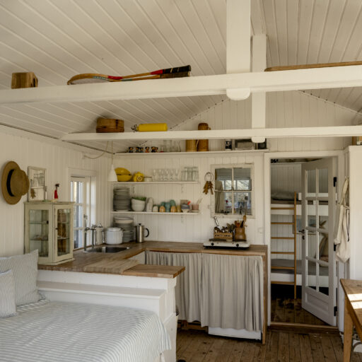 Wer sich mal gefragt hat, was wahres Urlaubsglück ausmacht, der findet die Antwort in einem Tiny House in Tornby Strand im Nordwesten Jütlands in Dänemark. Und zwar: ganz nah am Wasser! Tritt man morgens verschlafen nach draußen, kann man gleich das Salz des Meeres schmecken, spürt den Wind um die Nase. Den Morgenkaffee genießt man am Holztisch auf einer Düne vor dem Haus, mit Sand unter den Füßen, der Brandung im Ohr und der Nordsee im Blick. Übersetzt bedeutet der Name des Sommerhauses aus schwarzem Holz „Krähennest“. Weil es geschützt in einer Kuhle inmitten der Dünenlandschaft liegt, fühlt es sich dort richtig behaglich an. Als die dänemarkverliebten Gastgeber Anke und Felix Krohmer das Haus im Sommer 2024 entdeckten und es sogar die Möglichkeit gab, es zu kaufen, konnten sie es kaum fassen. Die beiden kommen ursprünglich aus dem Journalismus, stecken aber heute einen Großteil ihrer Energie (und noch mehr Herzblut) ins Gastgebertum. Vor allem die Hidden Champions haben es ihnen angetan, unentdeckte Orte in der zweiten Reihe, die sie neu zum Leben erwecken. Wie dieses Tiny House inmitten von wogendem Dünengras, das das behutsam renoviert wurde. Die Architektur aus den 1930ern ist denkmalgeschützt, im Inneren sorgen die mit weiß lackiertem Holz verkleideten Wände und Decken und ein Mix aus altem und neuem Mobiliar für ganz viel Gemütlichkeit – und die wiederum dafür, dass man die Bücher, die schon so lange zuhause auf dem Nachttisch liegen, endlich zu Ende lesen kann. Der große Luxus dieses winzigen Hauses liegt in der Reduktion auf das Wesentliche: auf gemeinsame Stunden inmitten von Wind und Wellen, ohne Hektik und Ablenkung, dafür mit ganz viel Ruhe und Zeit.