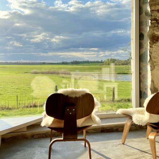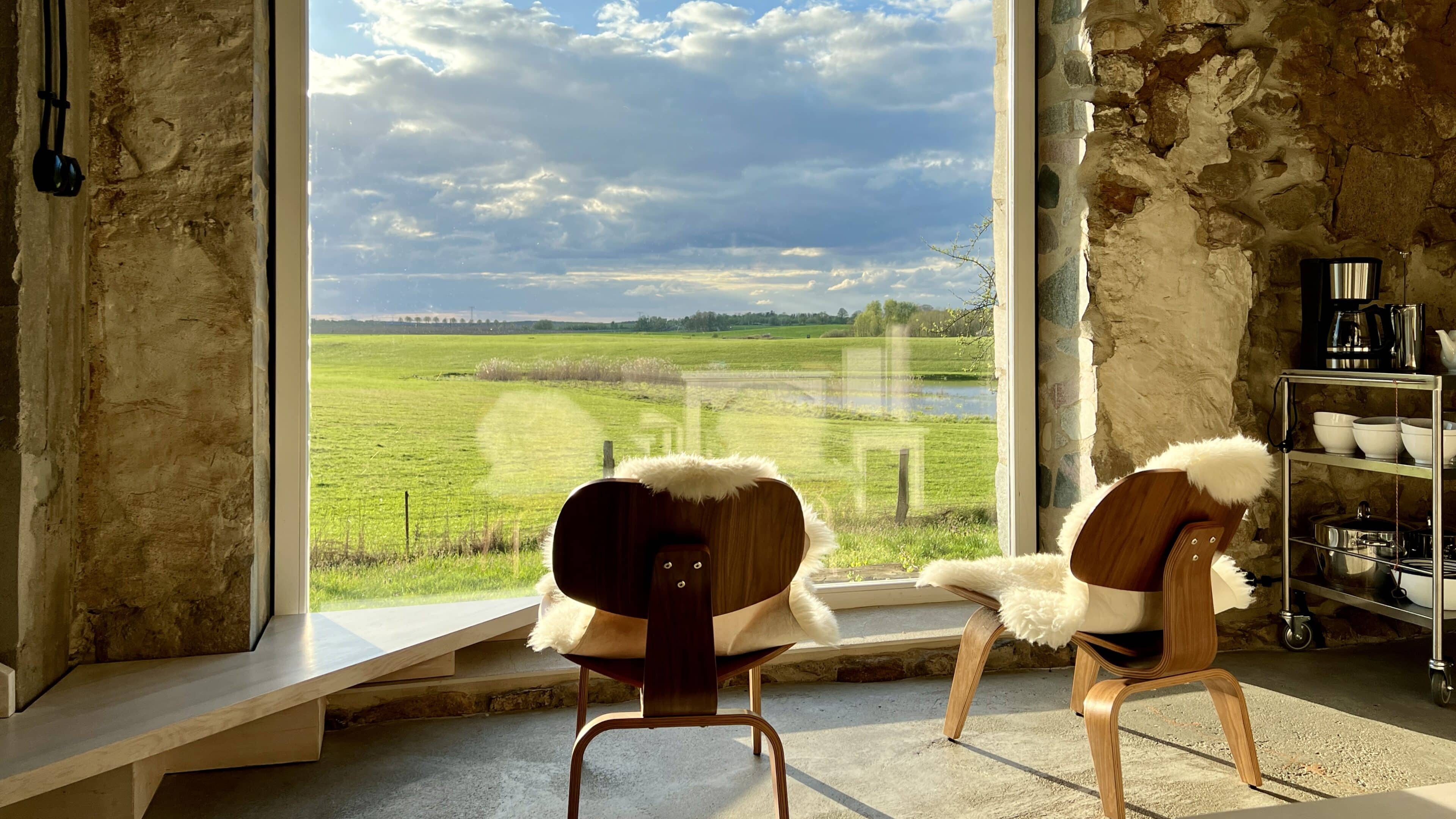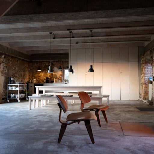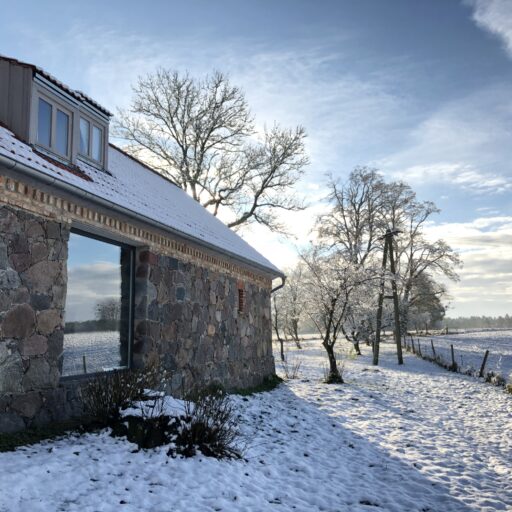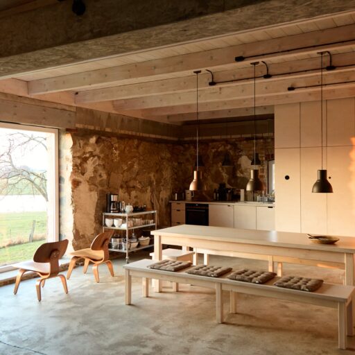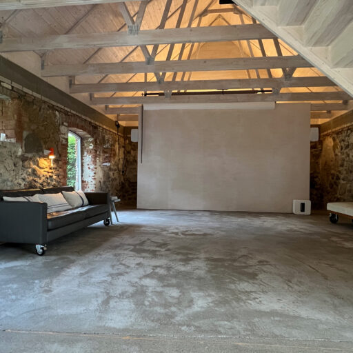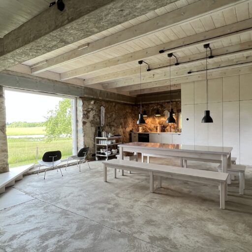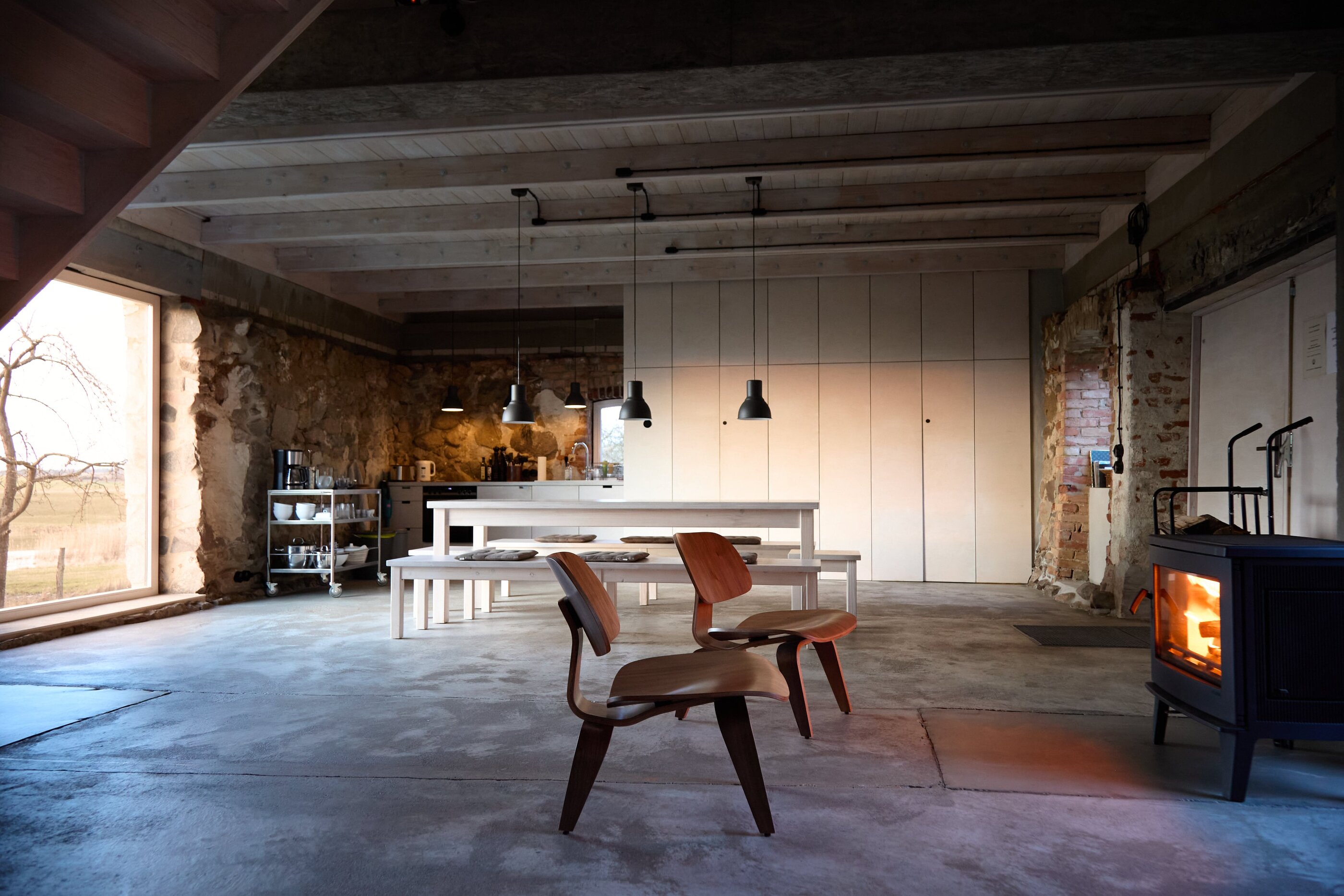 Damals stand hier auf dem stattlichen Anwesen namens Rieckshof ein Stall, in dem Pferde, Kühe und Schweine zu Hause waren. Heute finden wir an genau derselben Stelle das 2021 eröffnete Studio Uckermark – Kreativbüro, Shooting-Location und Ruheoase in einem. Es ist ein Ort, der jede Menge Raum für Klarheit, Inspiration und Persönlichkeit lässt. Entdeckt haben ihn Jane Garber und Karel Kuehne, selbst Kreative, die sich auf die Suche nach einem eigenen Schaffens- und Rückzugsort begeben hatten. Das 6.000 Quadratmeter große Gelände mit Hof und Wohnhaus, das einsam am Waldesrand außerhalb des Dorfes Klosterwalde liegt, schien perfekt: Das Projekt Studio Uckermark war geboren! Für das Paar ein Traum, der ganz behutsam und Schritt für Schritt umgesetzt werden sollte. Mithilfe eines tatkräftigen Teams und der Architektin Helga Blocksdorf wurde das ehemalige Stallgebäude umgebaut und heraus kam ein großzügig gestaltetes Loft mit zwei Etagen. Von außen gibt es mit seiner Steinfassade und großen Holztüren kleine Hinweise darauf, was da früher einmal war. Von innen beeindruckt es im modernen, minimalistischen Industrial-Style: Die offene Küche, der große Gemeinschaftstisch, gemütliche Sofas auf Rollen und der Kamin wirken einladend. Trotz – oder gerade wegen – des rohen Mauerwerks der Wände herrscht hier eine heimelige Atmosphäre. Das riesige Panoramafenster im Erdgeschoss ist das Herzstück des Studios, es gibt den Blick frei auf die Natur ringsum und bietet die Gelegenheit, Zeuge fantastischer Sonnenuntergänge zu werden. Im ausgebauten Dachgeschoss befindet sich ein Schlafsaal für bis zu sechs Personen inklusive Workplace. Hier kann man träumen und arbeiten – an kleinen oder ganz großen Ideen. Vielleicht werden auch sie eines Tages in die Tat umgesetzt. Wie das Studio Uckermark.