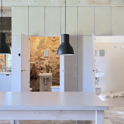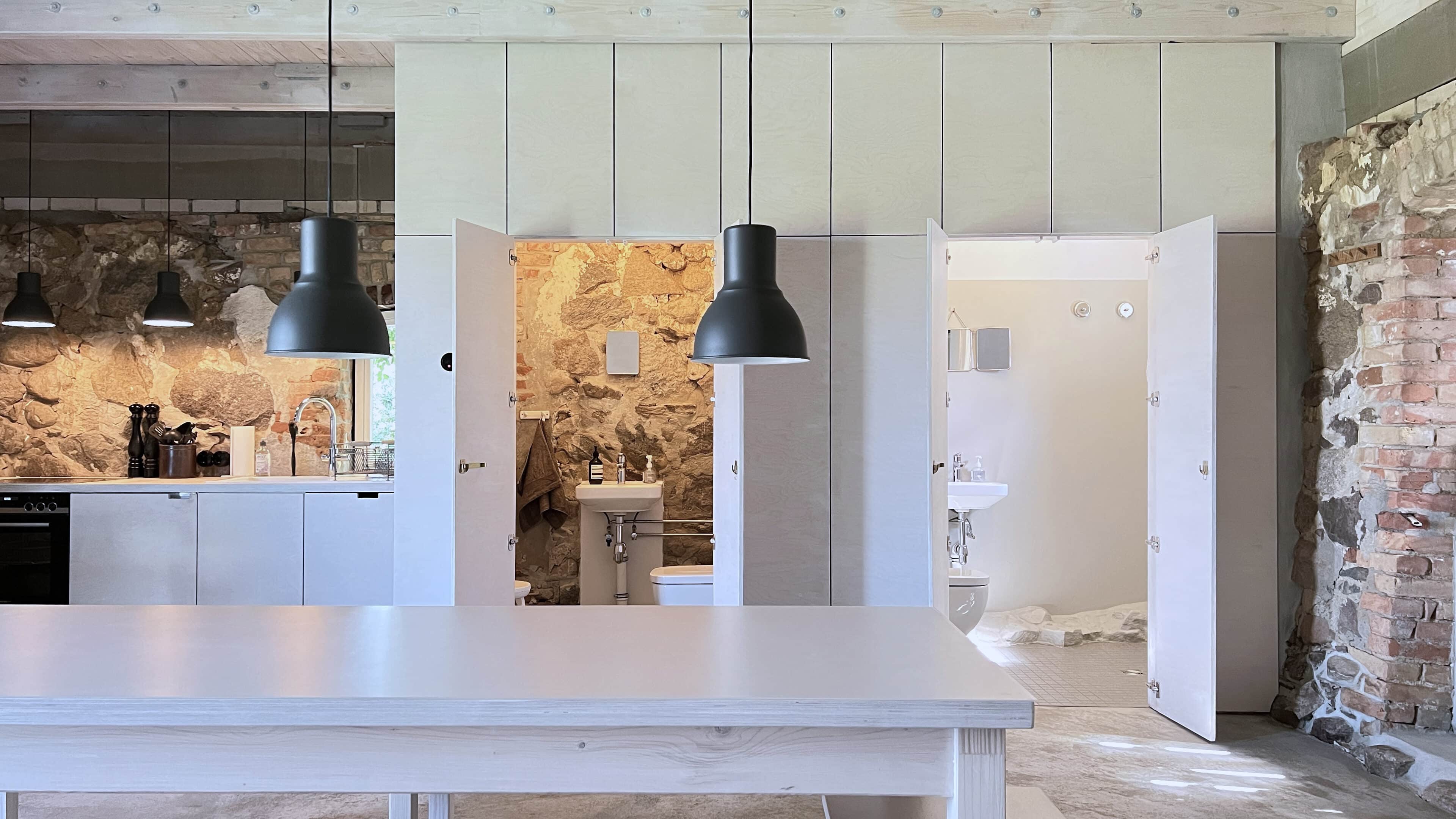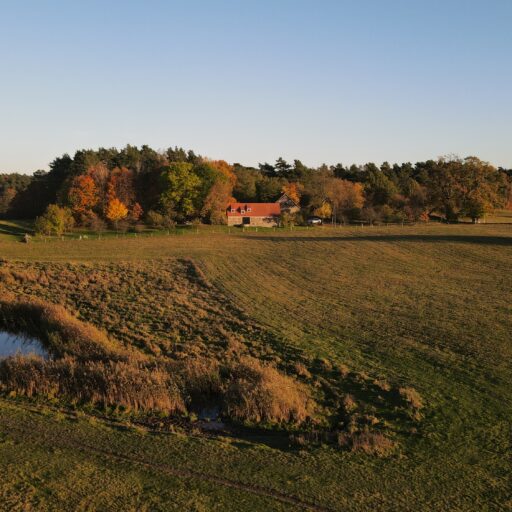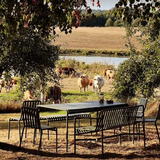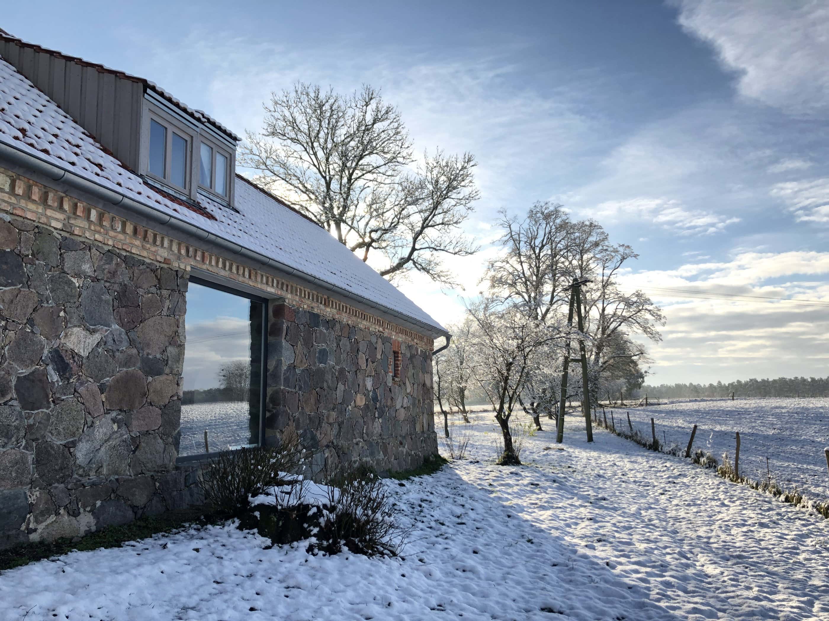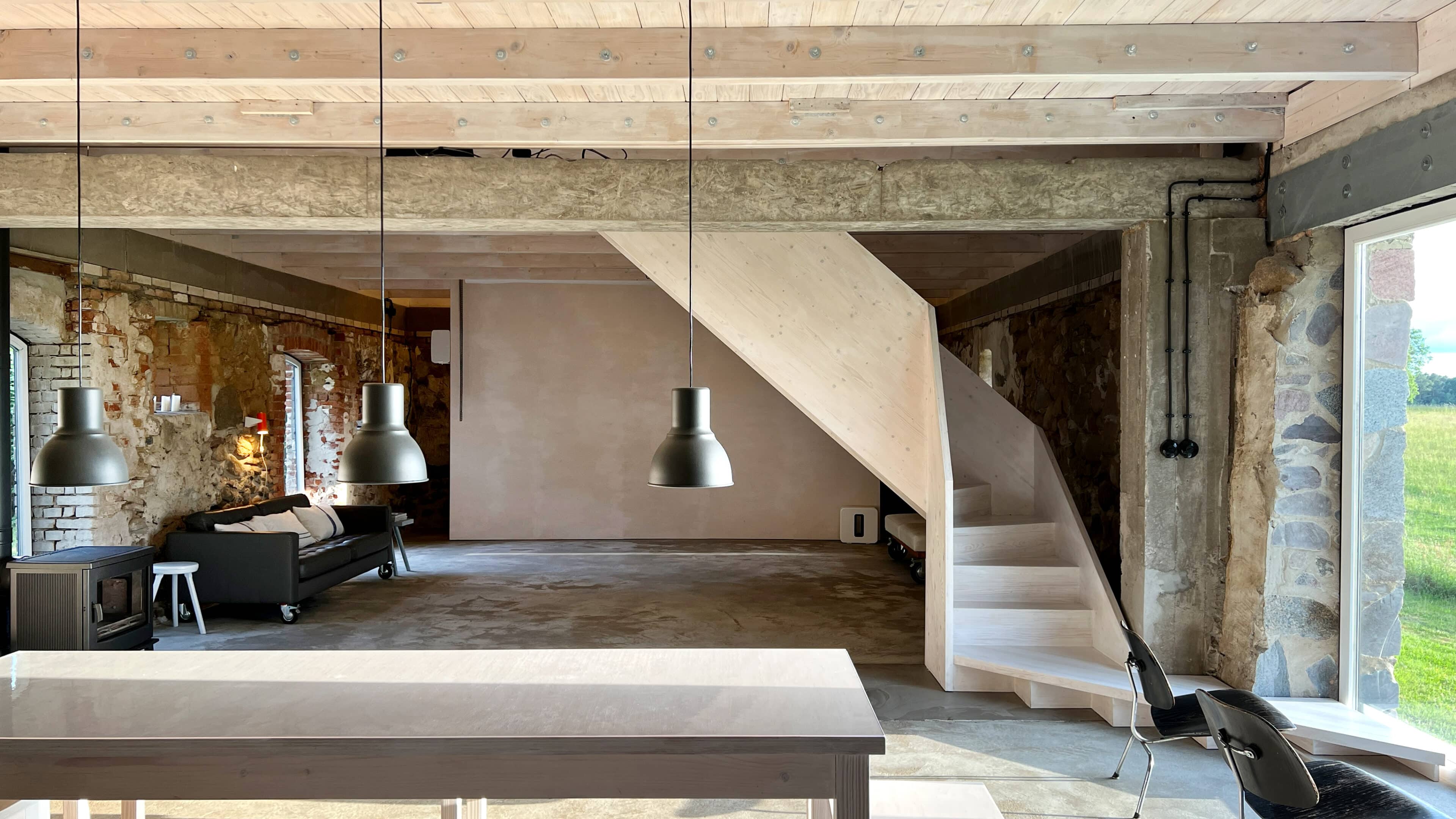 Damals stand hier auf dem stattlichen Anwesen namens Rieckshof ein Stall, in dem Pferde, Kühe und Schweine zu Hause waren. Heute finden wir an genau derselben Stelle das 2021 eröffnete Studio Uckermark – Kreativbüro, Shooting-Location und Ruheoase in einem. Es ist ein Ort, der jede Menge Raum für Klarheit, Inspiration und Persönlichkeit lässt. Entdeckt haben ihn Jane Garber und Karel Kuehne, selbst Kreative, die sich auf die Suche nach einem eigenen Schaffens- und Rückzugsort begeben hatten. Das 6.000 Quadratmeter große Gelände mit Hof und Wohnhaus, das einsam am Waldesrand außerhalb des Dorfes Klosterwalde liegt, schien perfekt: Das Projekt Studio Uckermark war geboren! Für das Paar ein Traum, der ganz behutsam und Schritt für Schritt umgesetzt werden sollte. Mithilfe eines tatkräftigen Teams und der Architektin Helga Blocksdorf wurde das ehemalige Stallgebäude umgebaut und heraus kam ein großzügig gestaltetes Loft mit zwei Etagen. Von außen gibt es mit seiner Steinfassade und großen Holztüren kleine Hinweise darauf, was da früher einmal war. Von innen beeindruckt es im modernen, minimalistischen Industrial-Style: Die offene Küche, der große Gemeinschaftstisch, gemütliche Sofas auf Rollen und der Kamin wirken einladend. Trotz – oder gerade wegen – des rohen Mauerwerks der Wände herrscht hier eine heimelige Atmosphäre. Das riesige Panoramafenster im Erdgeschoss ist das Herzstück des Studios, es gibt den Blick frei auf die Natur ringsum und bietet die Gelegenheit, Zeuge fantastischer Sonnenuntergänge zu werden. Im ausgebauten Dachgeschoss befindet sich ein Schlafsaal für bis zu sechs Personen inklusive Workplace. Hier kann man träumen und arbeiten – an kleinen oder ganz großen Ideen. Vielleicht werden auch sie eines Tages in die Tat umgesetzt. Wie das Studio Uckermark.