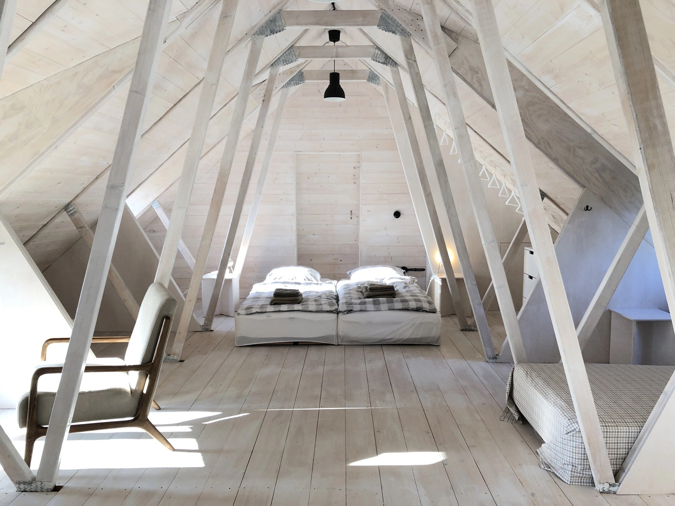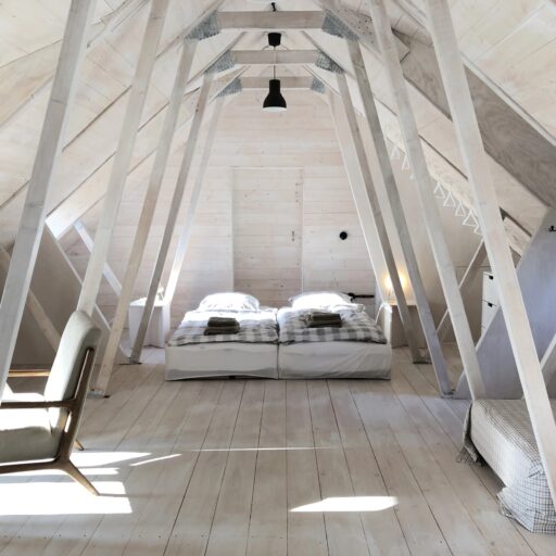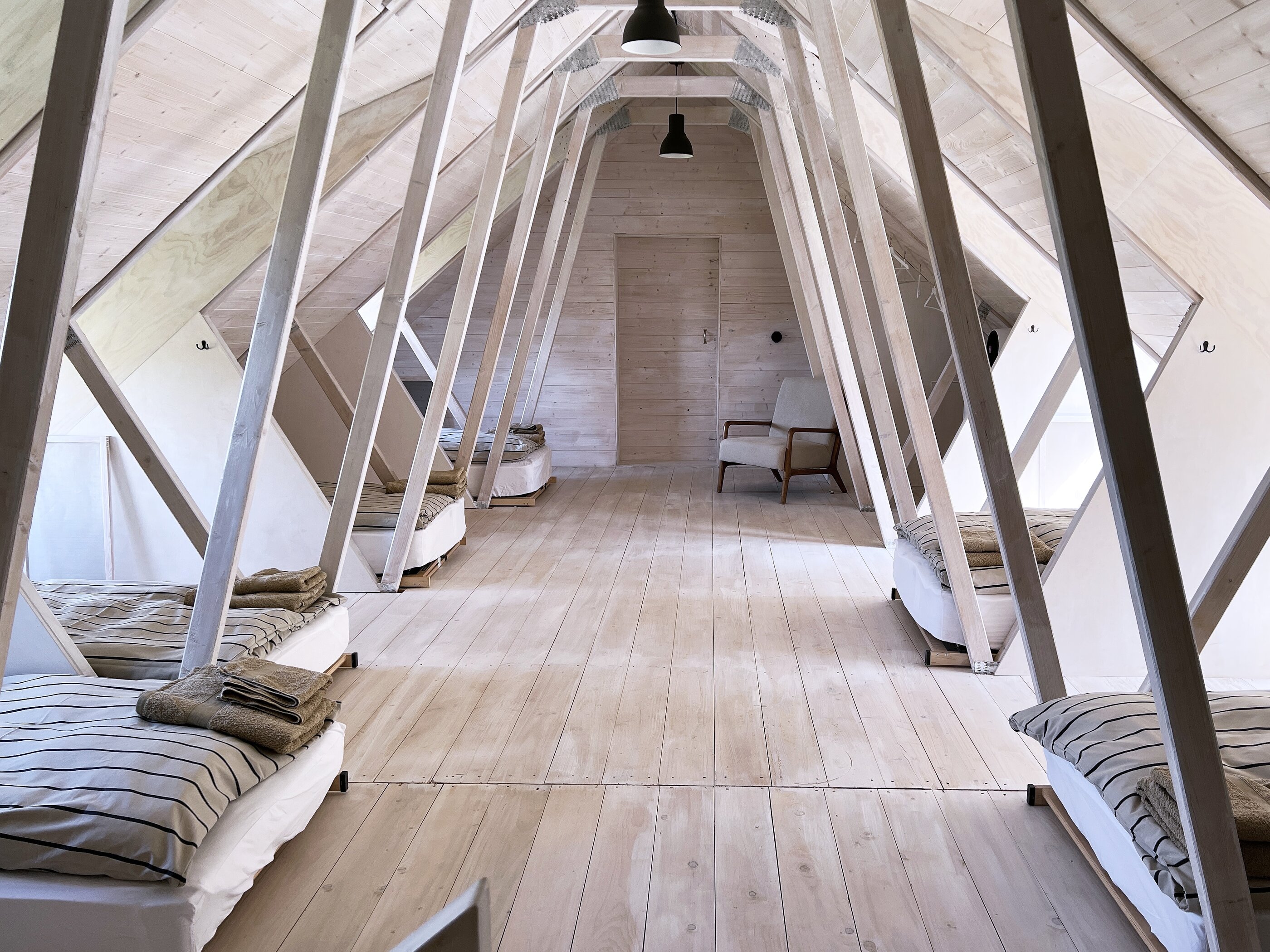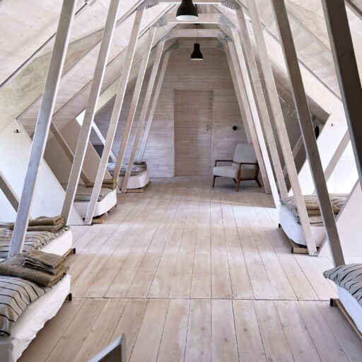- im atmosphärischen Schlafsaal unter dem Dach können bis zu sechs Personen in Einzelbett- oder Doppelbettkojen übernachten