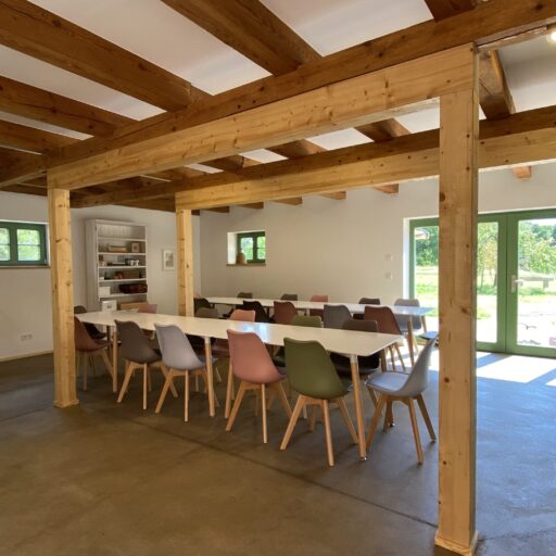- 25 Personen können in dem extra „Mufu-Haus“ zusammen am Tisch essen, draußen gibt es eine Terrasse mit Loungemöbeln, oben einen Seminarraum