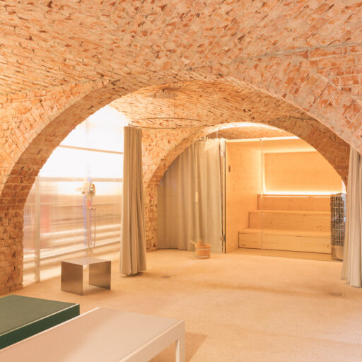- die Sauna im historischen Gewölbekeller, in der man sich nach langen Spaziergängen durchwärmen lässt. Vom Inneren blickt man durch die Glasfront auf altes Gemäuer