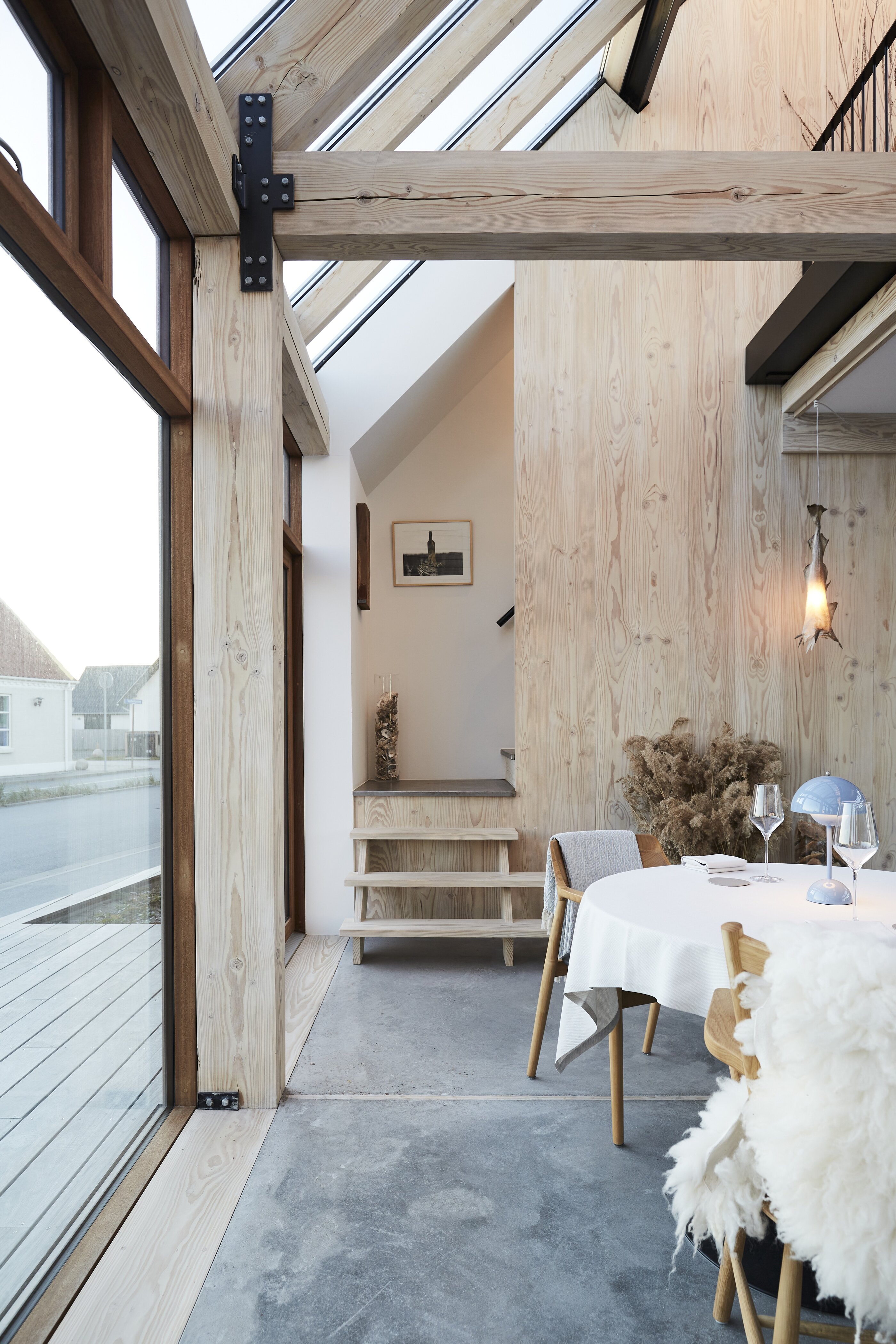 - schon von außen empfangen einen die klaren Linien, viel Holz, Beton und Glas: das ehemalige Bauernhaus Vesterlandet wirkt trotz Modernisierung stark verwurzelt mit seiner Umgebung und legt ganz klar den Fokus auf das Wesentliche