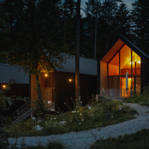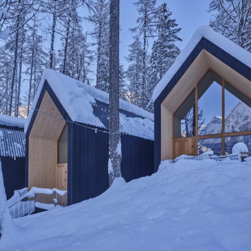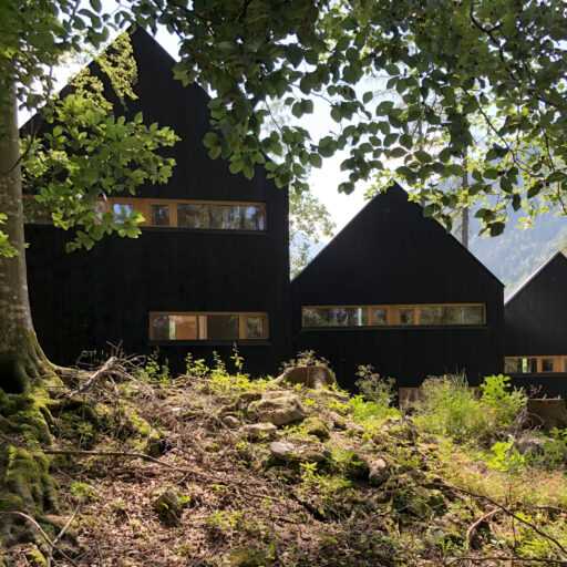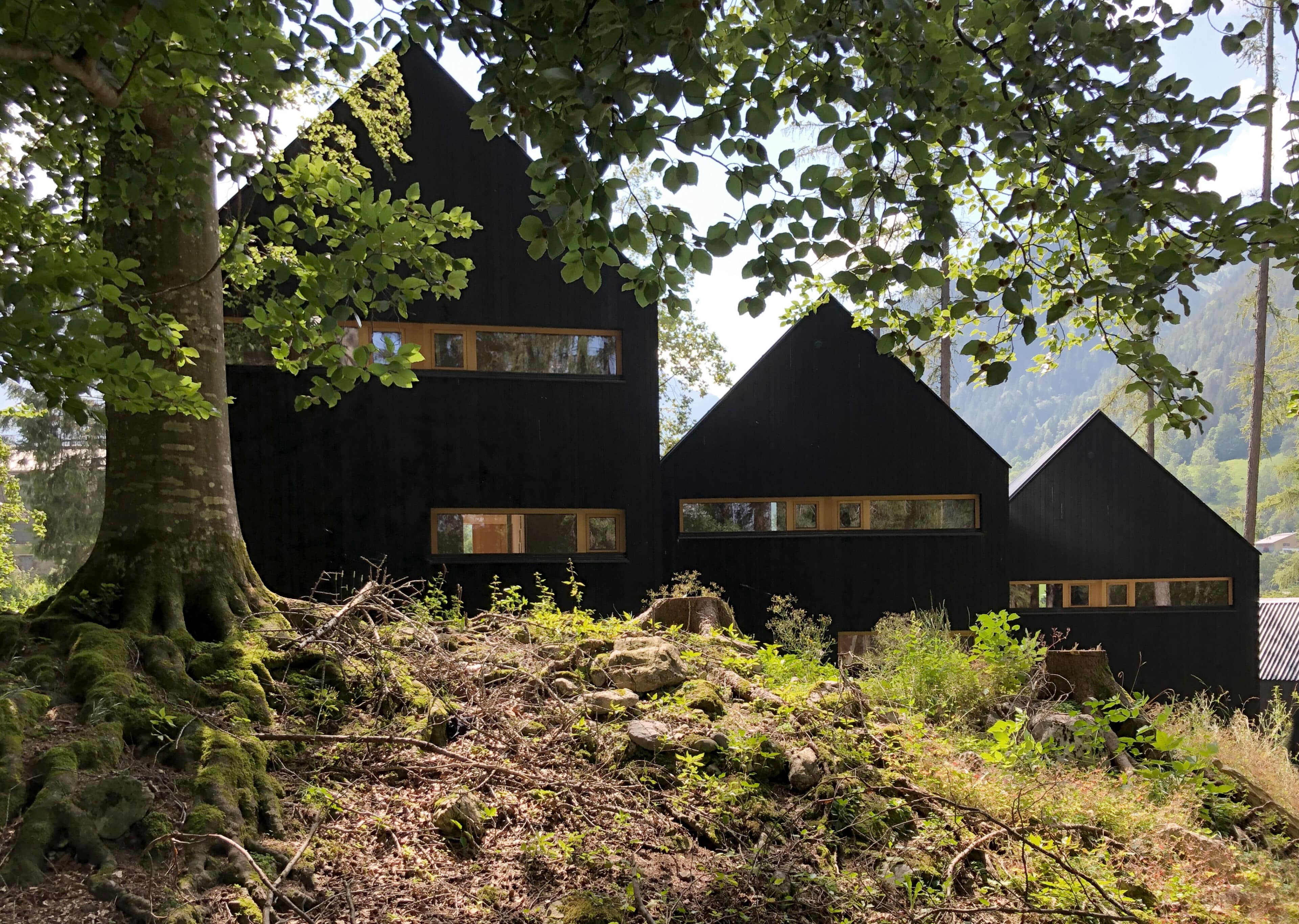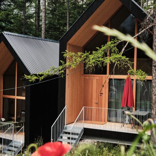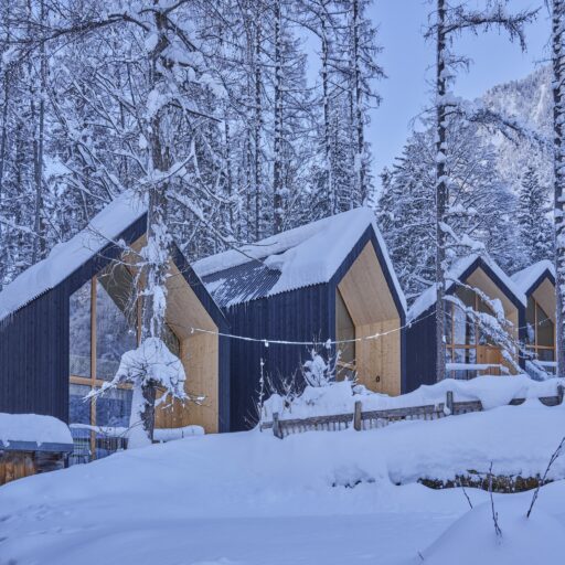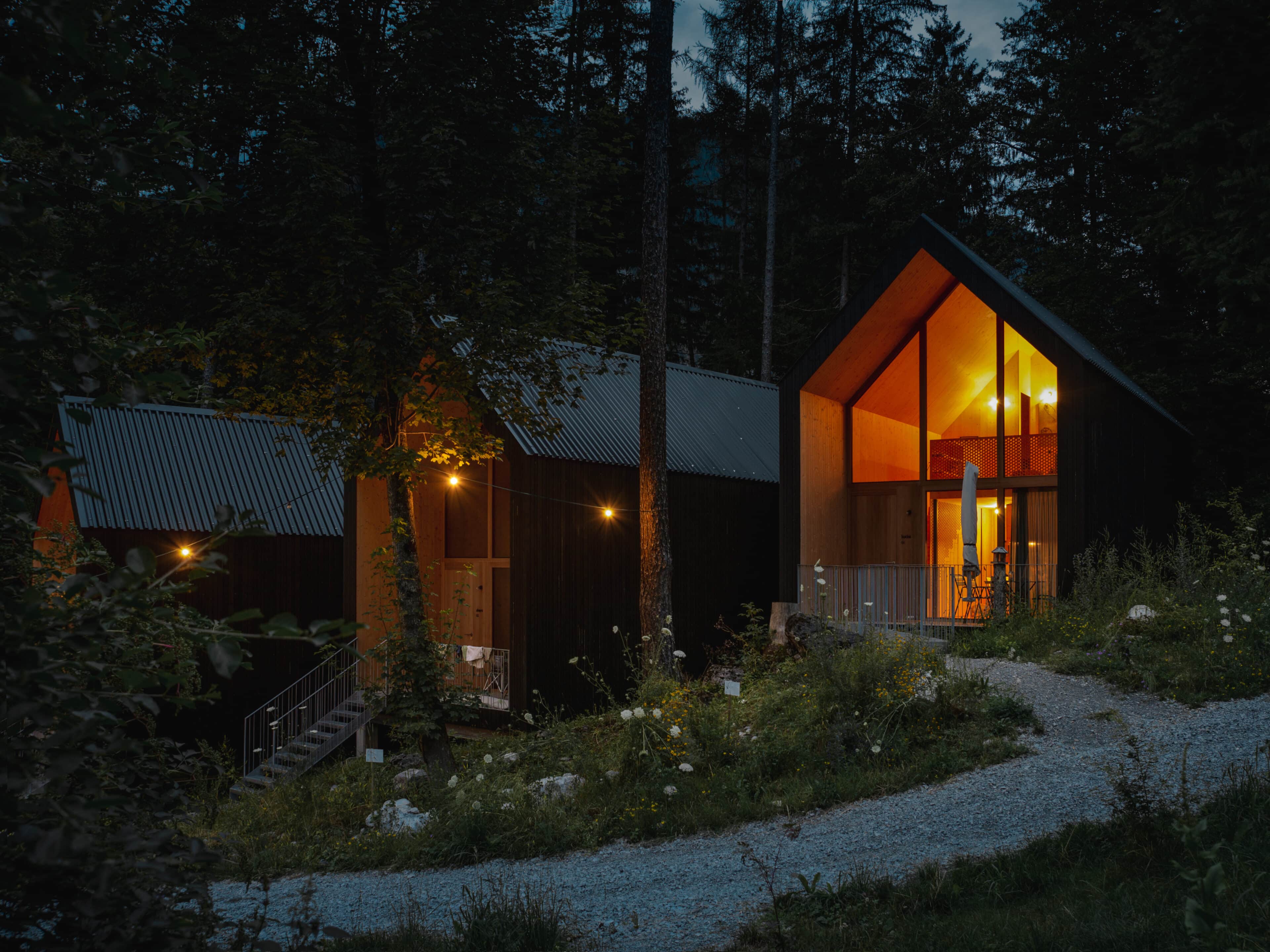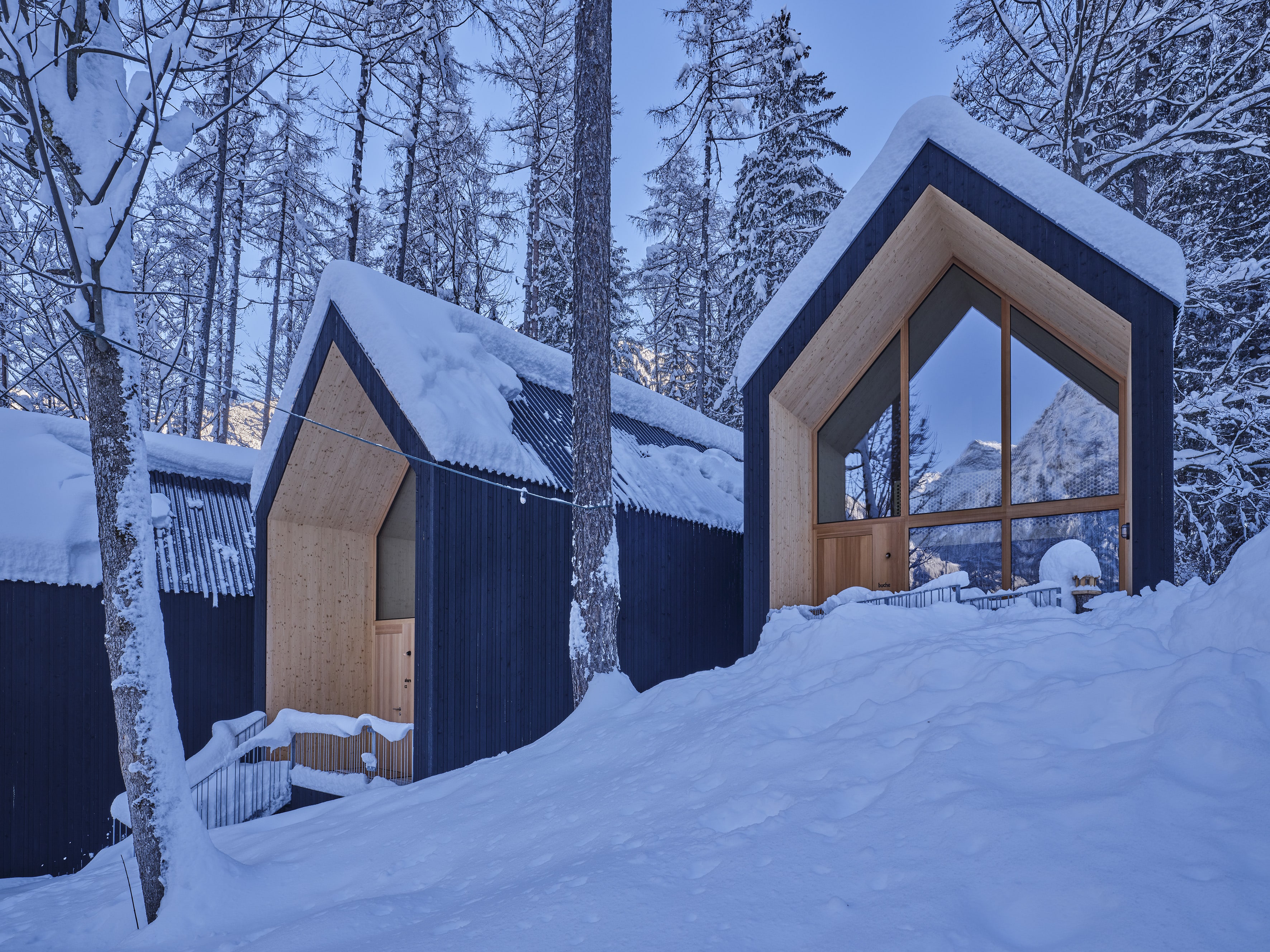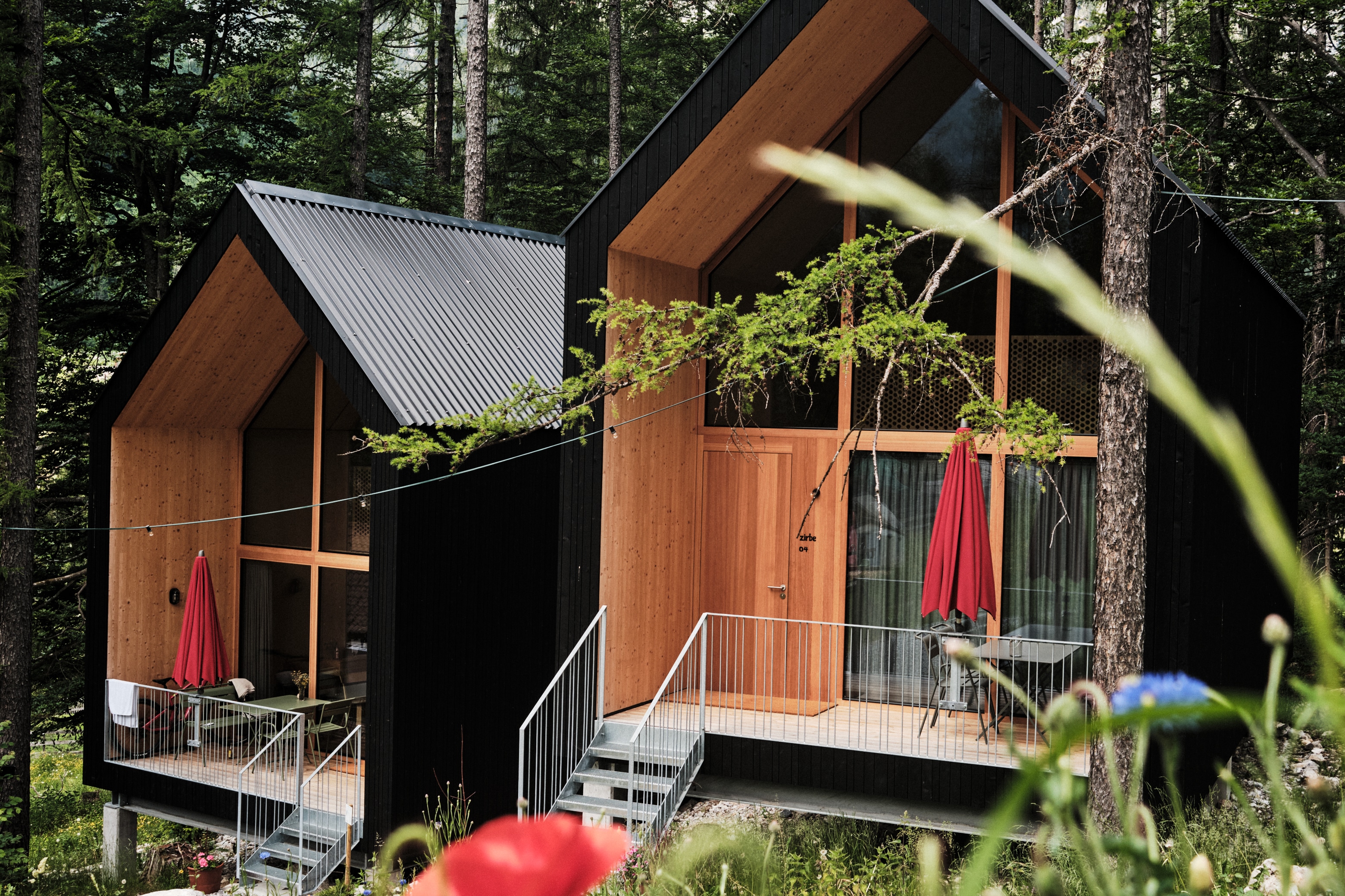 - wie die mattschwarze Holzverschalung der Chalets und das tiefe Grün der Bäume Natur und Architektur miteinander verschmelzen lassen