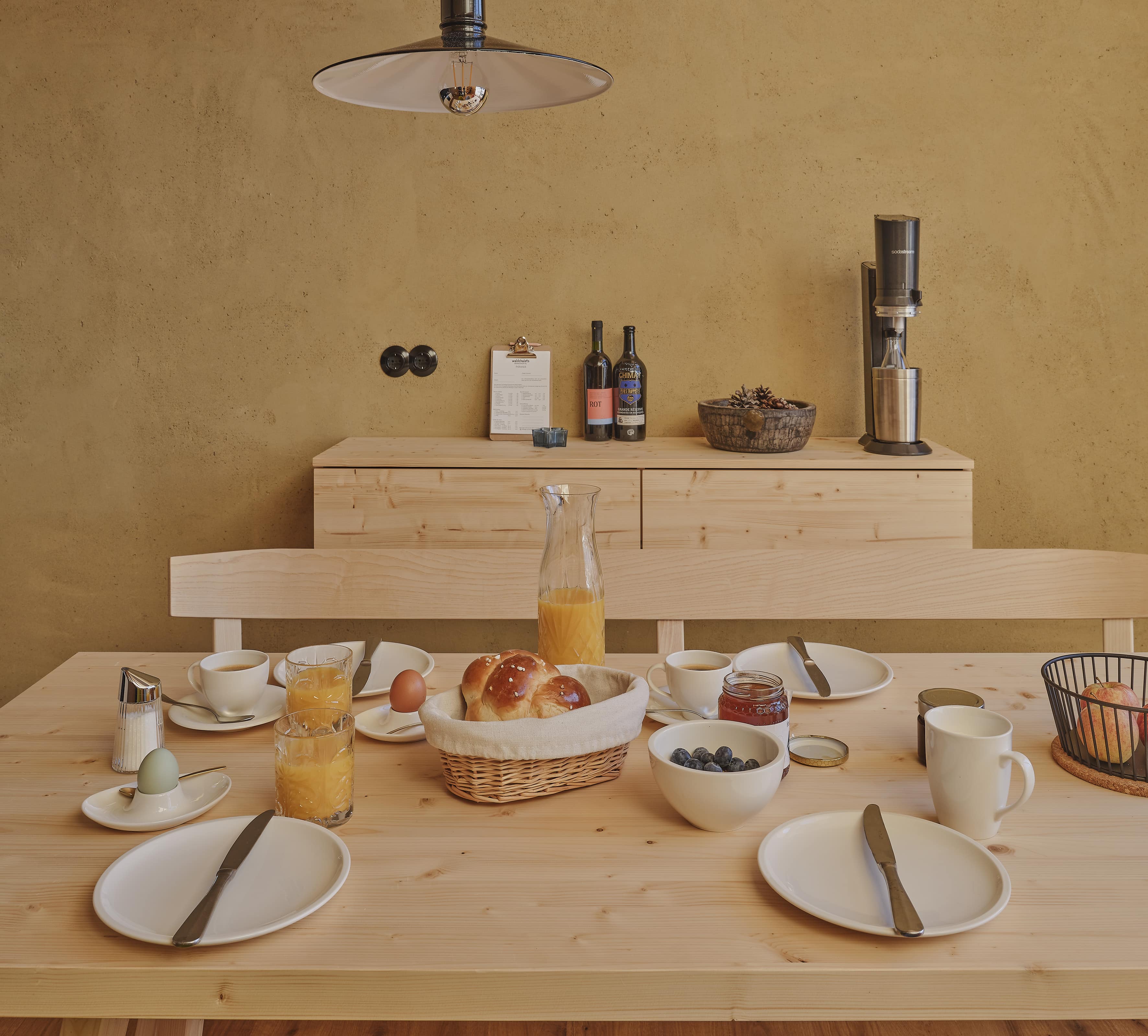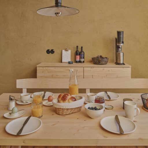- die Frühstückskörbe, die sich die Gäste vor die Tür liefern lassen können: Frisches Brot, Marmelade, Lieblings-Müsli und Eier von den Hühnern der Familie Durnwalder. Auch der der Kühlschrank kann vor der Anreise befüllt werden