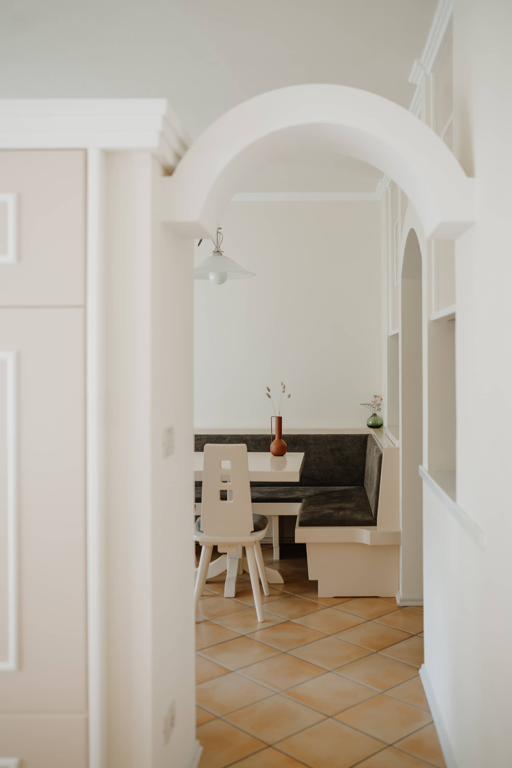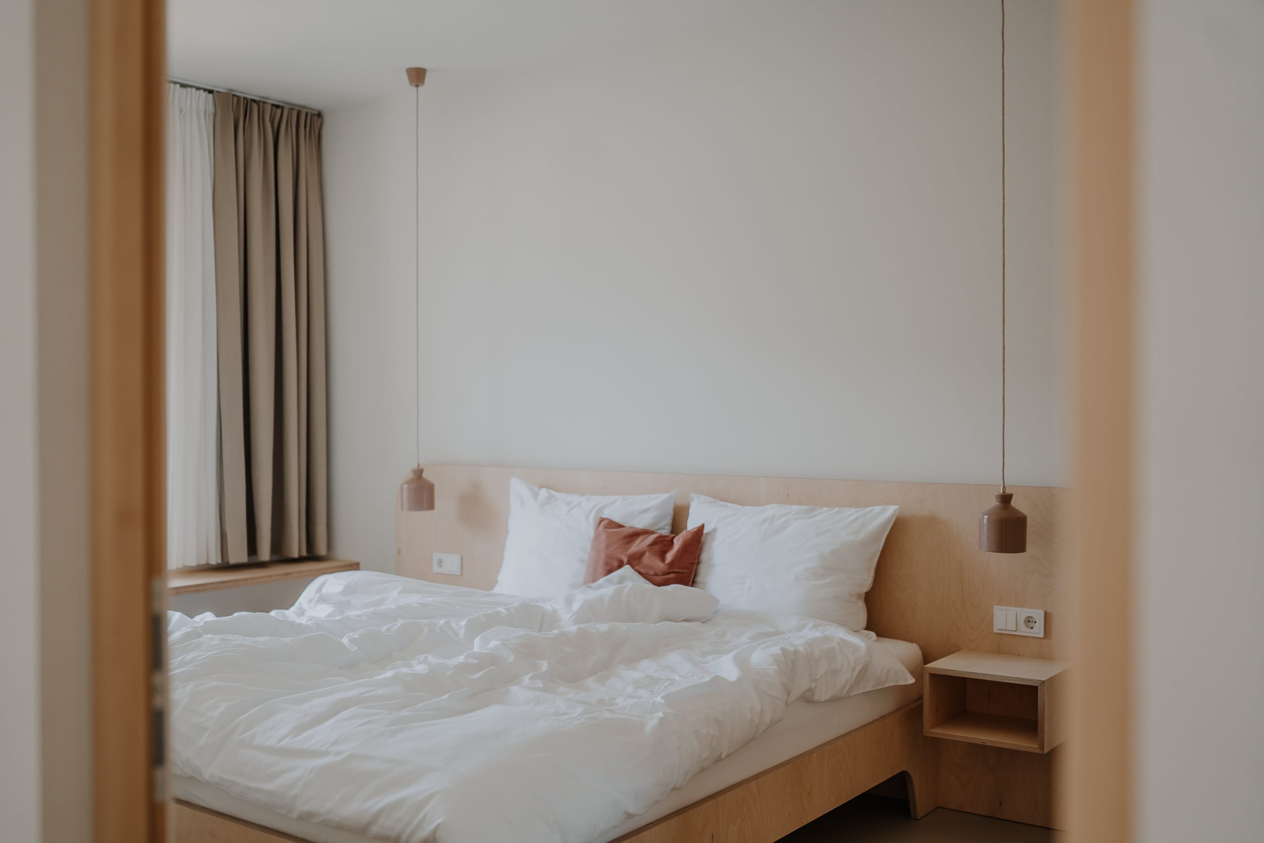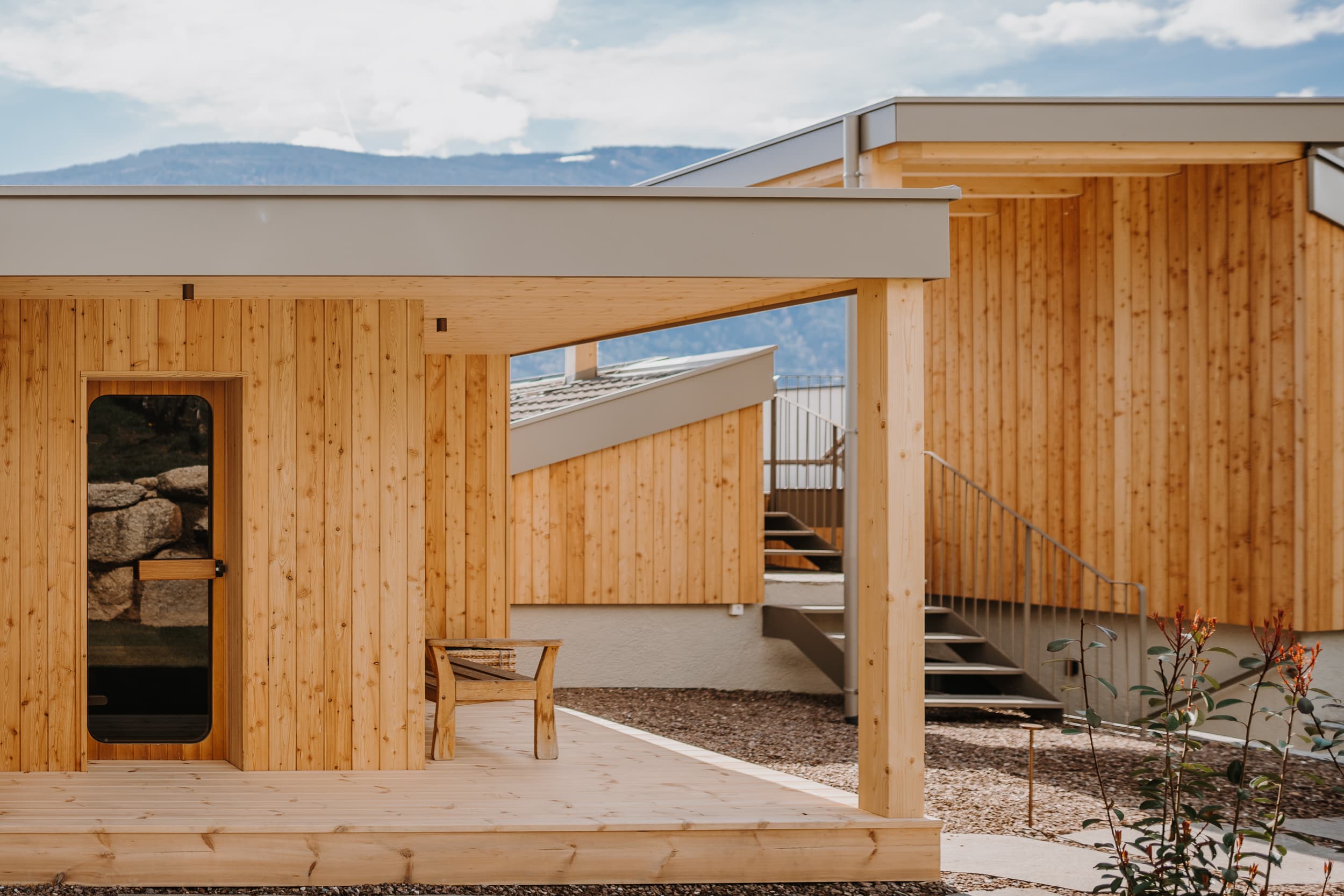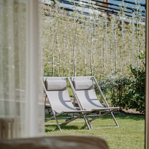 Manchmal können wir im Urlaub gerade dann am besten runterfahren, wenn wir in Bewegung kommen. Die Ausgangslage, um in grandioser Natur auf Entdeckungstour zu gehen, könnte kaum glücklicher sein als in dem Apartmenthaus Wanda am Ortsrand von Partschins in Südtirol. Nach dem Frühstück, das bei blauem Himmel (gibt’s hier zum Glück sehr häufig!) unbedingt auf der Dachterrasse mit Olivenbäumchen, Lavendel und Bergblick zelebriert werden sollte, ließe sich zum Beispiel rund um die Montiggler Seen radeln.  Trotz der vielen großartigen Outdoor-Optionen zieht es uns jedoch immer wieder zurück in unser Zuhause auf Zeit. Das hat natürlich etwas mit dem Salzwasser-Pool zwischen ganz viel Grün zu tun, in den wir nach einer strammen Bergtour abtauchen. Auch mit der Garten-Sauna, die für wohlige Entspannung sorgt, sowie dem mediterranen Gemeinschaftsgarten, der ein prima Setting für unser Lieblings-Südtirol-Szenario bietet: beim Aperitivo in der Sonne zu sitzen, während auf den umliegenden Bergspitzen noch Schnee liegt. Und ganz bestimmt hängt diese Anziehungskraft auch mit dem schönen Innenleben zusammen. Marion und Moritz haben 2020 die Leitung übernommen und dürfen sich die sehr gelungene Umgestaltung auf die Fahnen schreiben. Helles Holz, zurückgenommene und natürliche Farben, traditionelle Elemente neu interpretiert – genau der richtige Mix aus modernem Komfort und Gemütlichkeit. Und die perfekte Umgebung, um nach einem Action-Tag alle Viere von sich zu strecken.