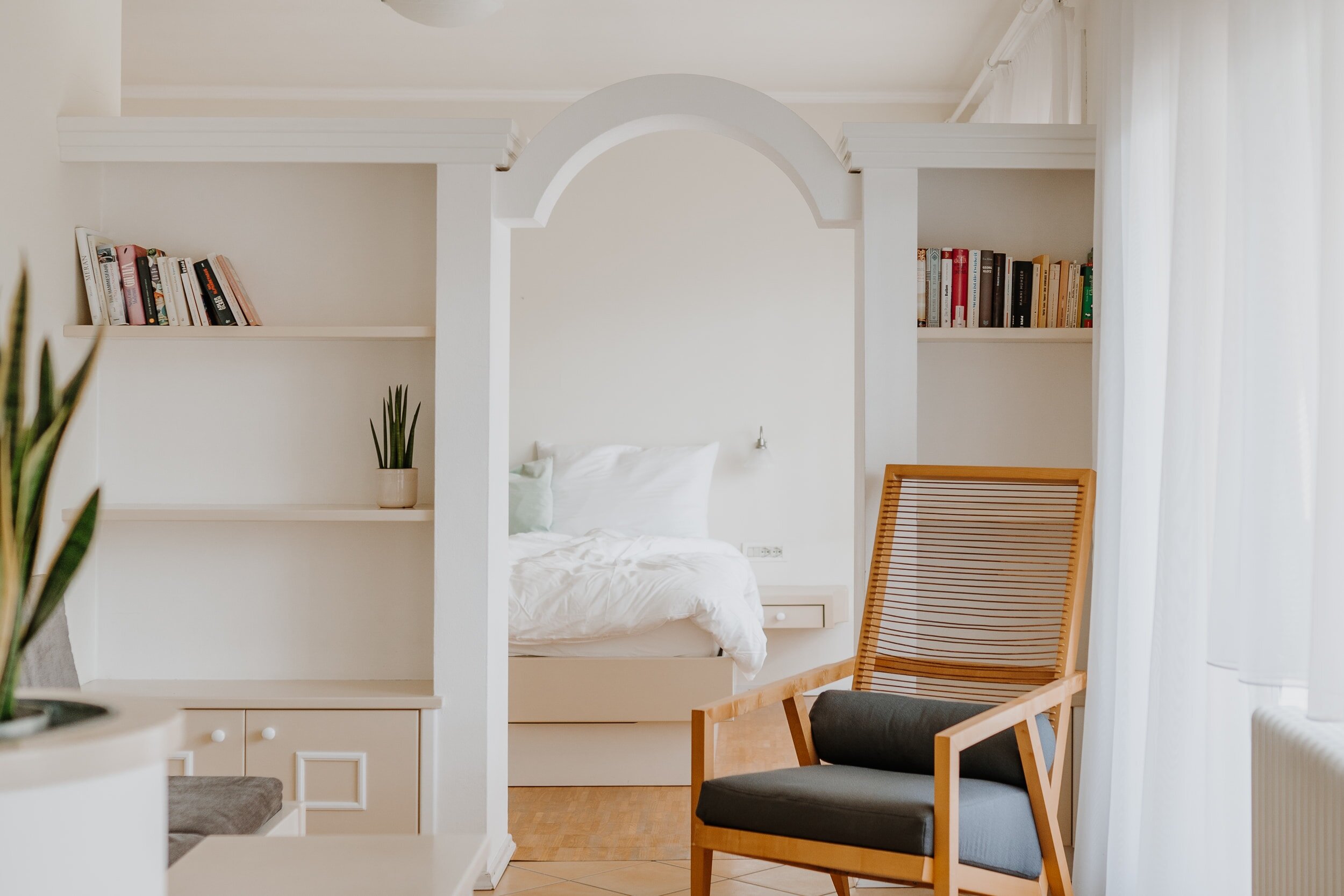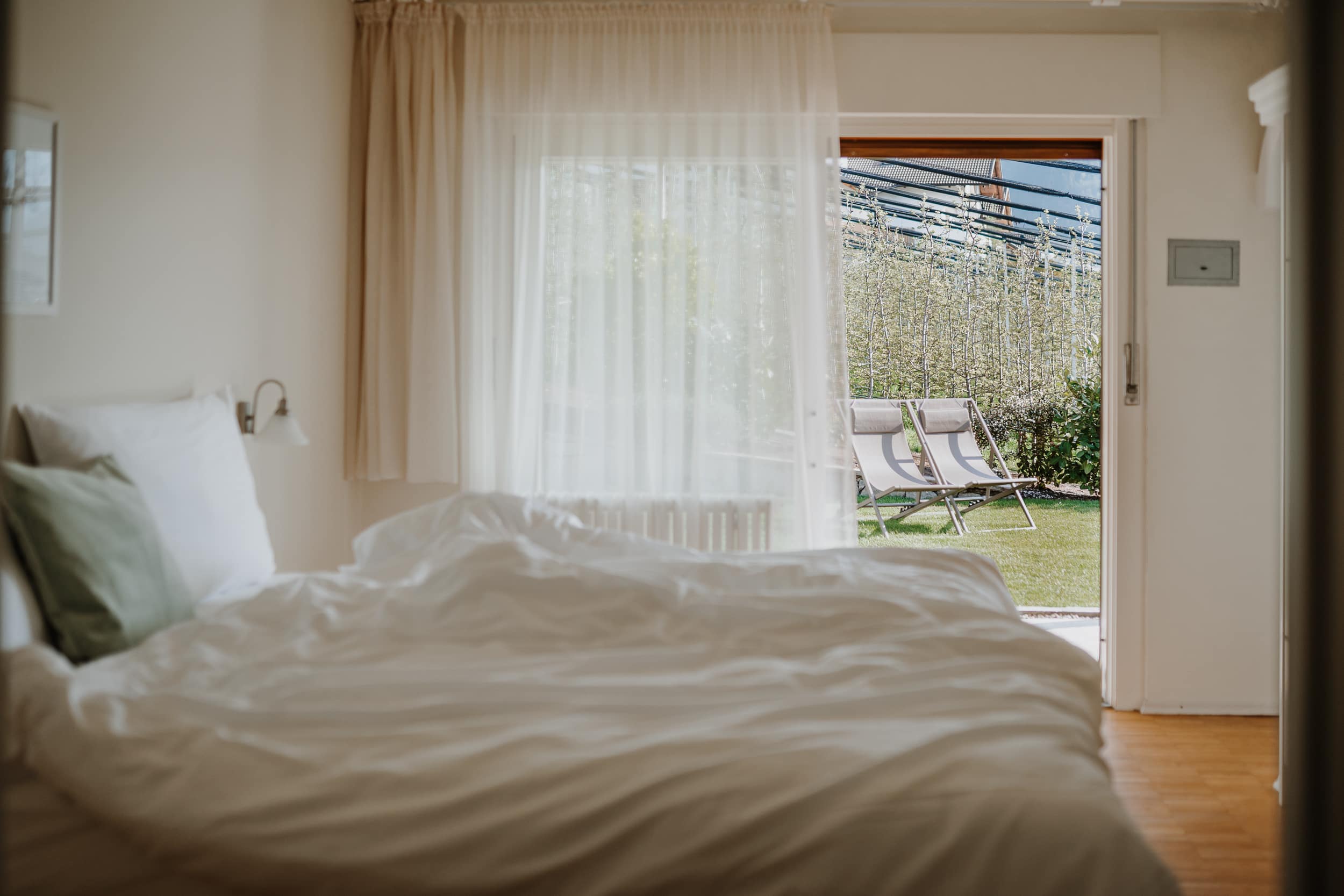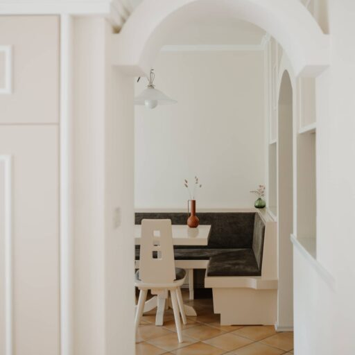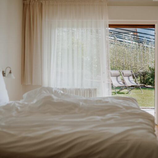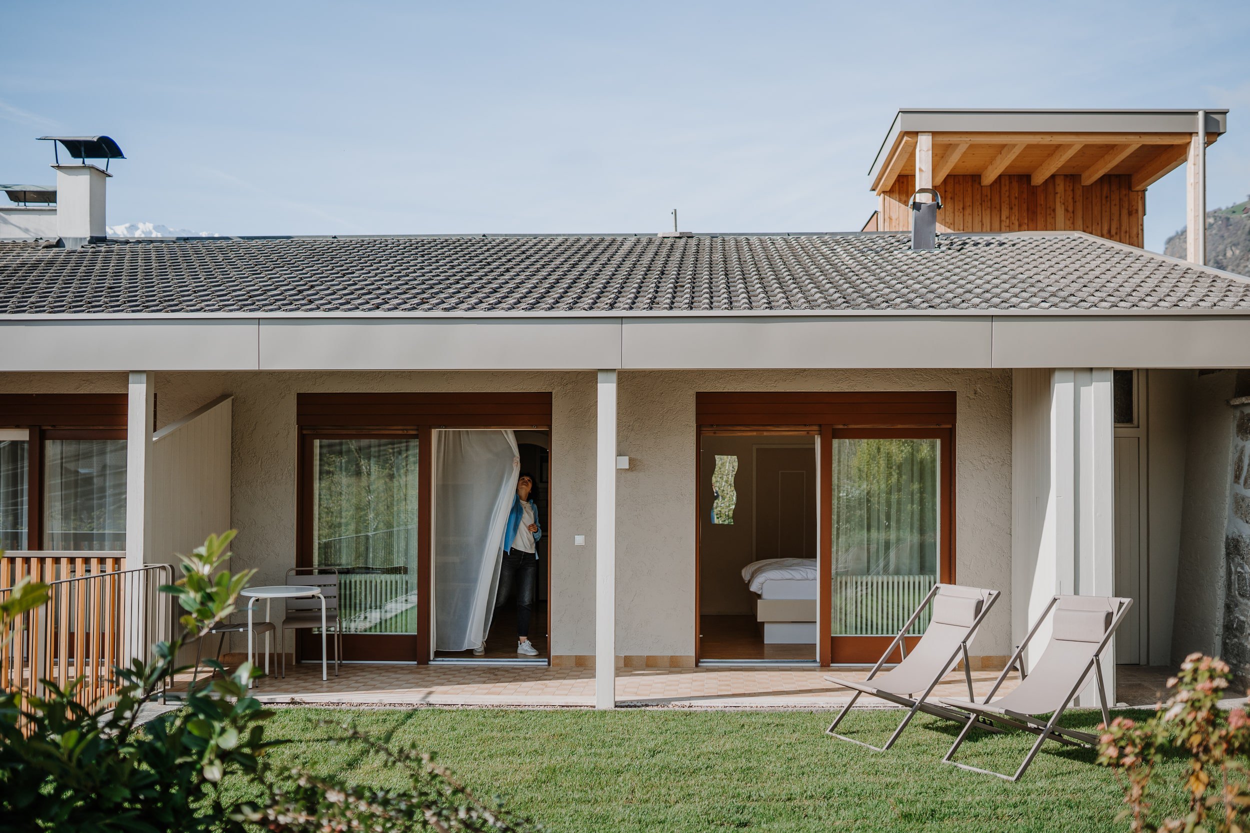 Manchmal können wir im Urlaub gerade dann am besten runterfahren, wenn wir in Bewegung kommen. Die Ausgangslage, um in grandioser Natur auf Entdeckungstour zu gehen, könnte kaum glücklicher sein als in dem Apartmenthaus Wanda am Ortsrand von Partschins in Südtirol. Nach dem Frühstück, das bei blauem Himmel (gibt’s hier zum Glück sehr häufig!) unbedingt auf der Dachterrasse mit Olivenbäumchen, Lavendel und Bergblick zelebriert werden sollte, ließe sich zum Beispiel rund um die Montiggler Seen radeln.  Trotz der vielen großartigen Outdoor-Optionen zieht es uns jedoch immer wieder zurück in unser Zuhause auf Zeit. Das hat natürlich etwas mit dem Salzwasser-Pool zwischen ganz viel Grün zu tun, in den wir nach einer strammen Bergtour abtauchen. Auch mit der Garten-Sauna, die für wohlige Entspannung sorgt, sowie dem mediterranen Gemeinschaftsgarten, der ein prima Setting für unser Lieblings-Südtirol-Szenario bietet: beim Aperitivo in der Sonne zu sitzen, während auf den umliegenden Bergspitzen noch Schnee liegt. Und ganz bestimmt hängt diese Anziehungskraft auch mit dem schönen Innenleben zusammen. Marion und Moritz haben 2020 die Leitung übernommen und dürfen sich die sehr gelungene Umgestaltung auf die Fahnen schreiben. Helles Holz, zurückgenommene und natürliche Farben, traditionelle Elemente neu interpretiert – genau der richtige Mix aus modernem Komfort und Gemütlichkeit. Und die perfekte Umgebung, um nach einem Action-Tag alle Viere von sich zu strecken.