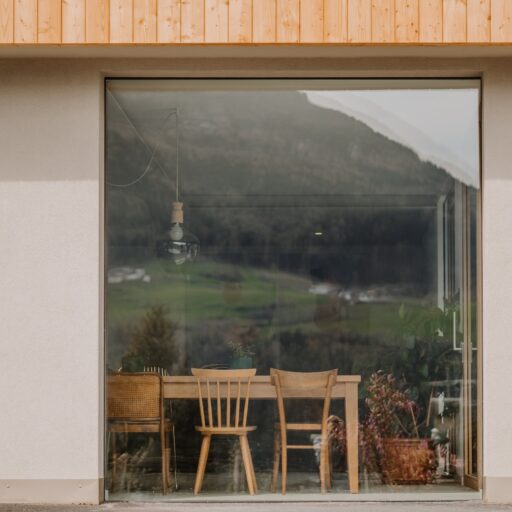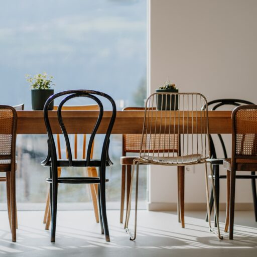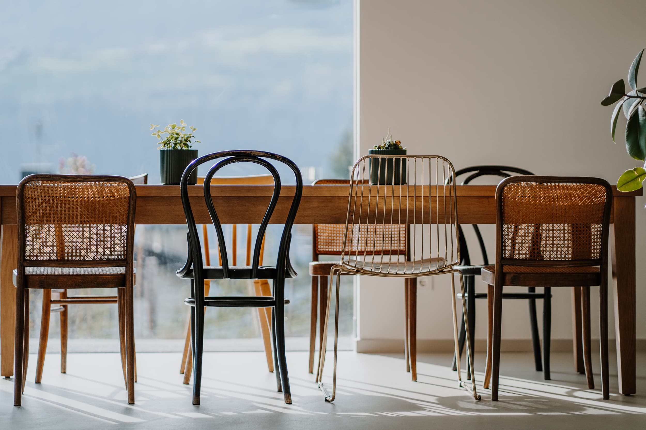 • den langen Esstisch mit der lässigen Kombination aus verschiedenen Stühlen, der vor dem bodentiefen Fenster platziert wurde und einen herrlichen Platz für ein Abendessen mit Freunden bietet